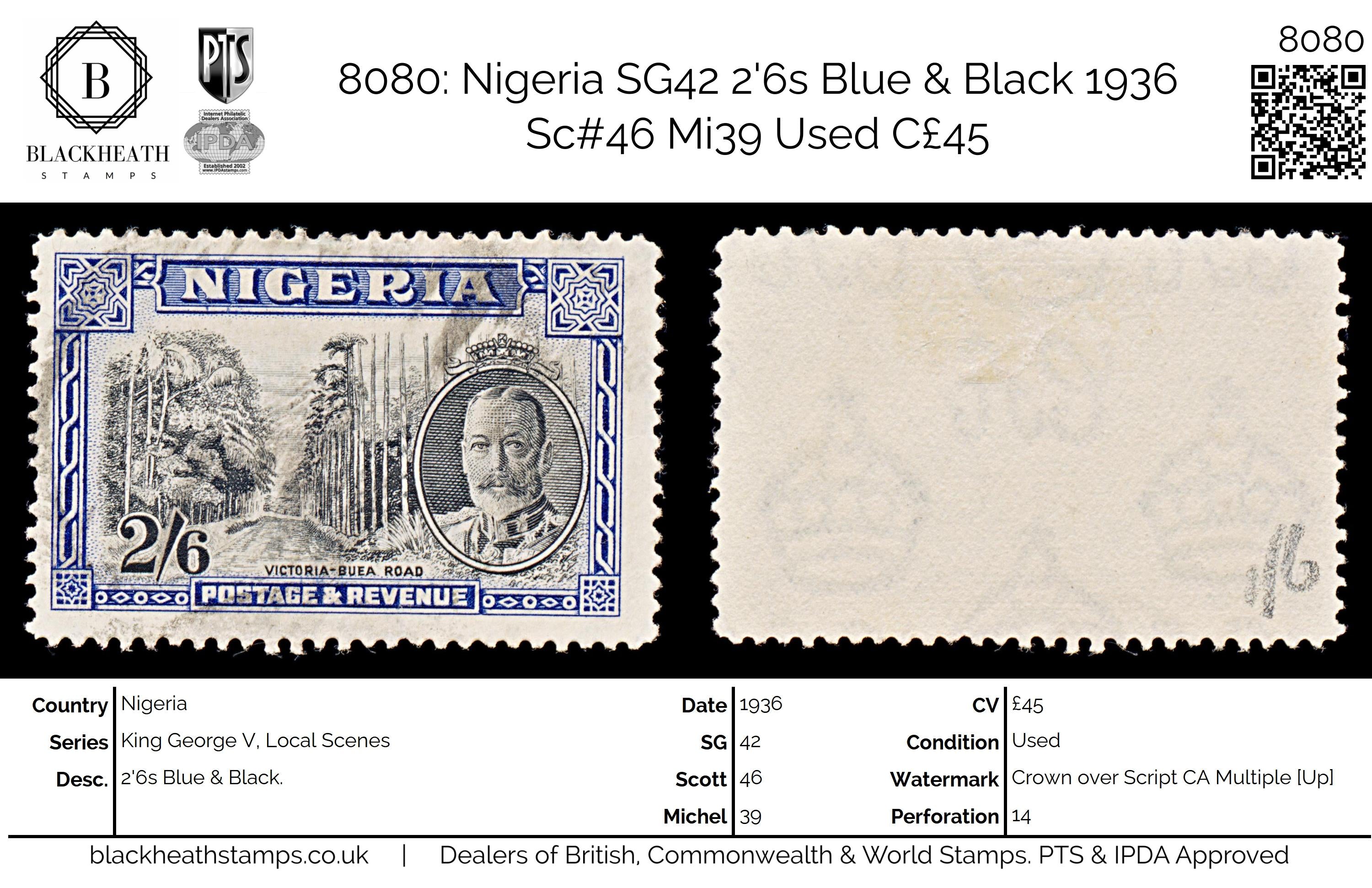 8080: Nigeria SG42 2'6s Blue & Black 1936 Sc#46 Mi39 Used C£45