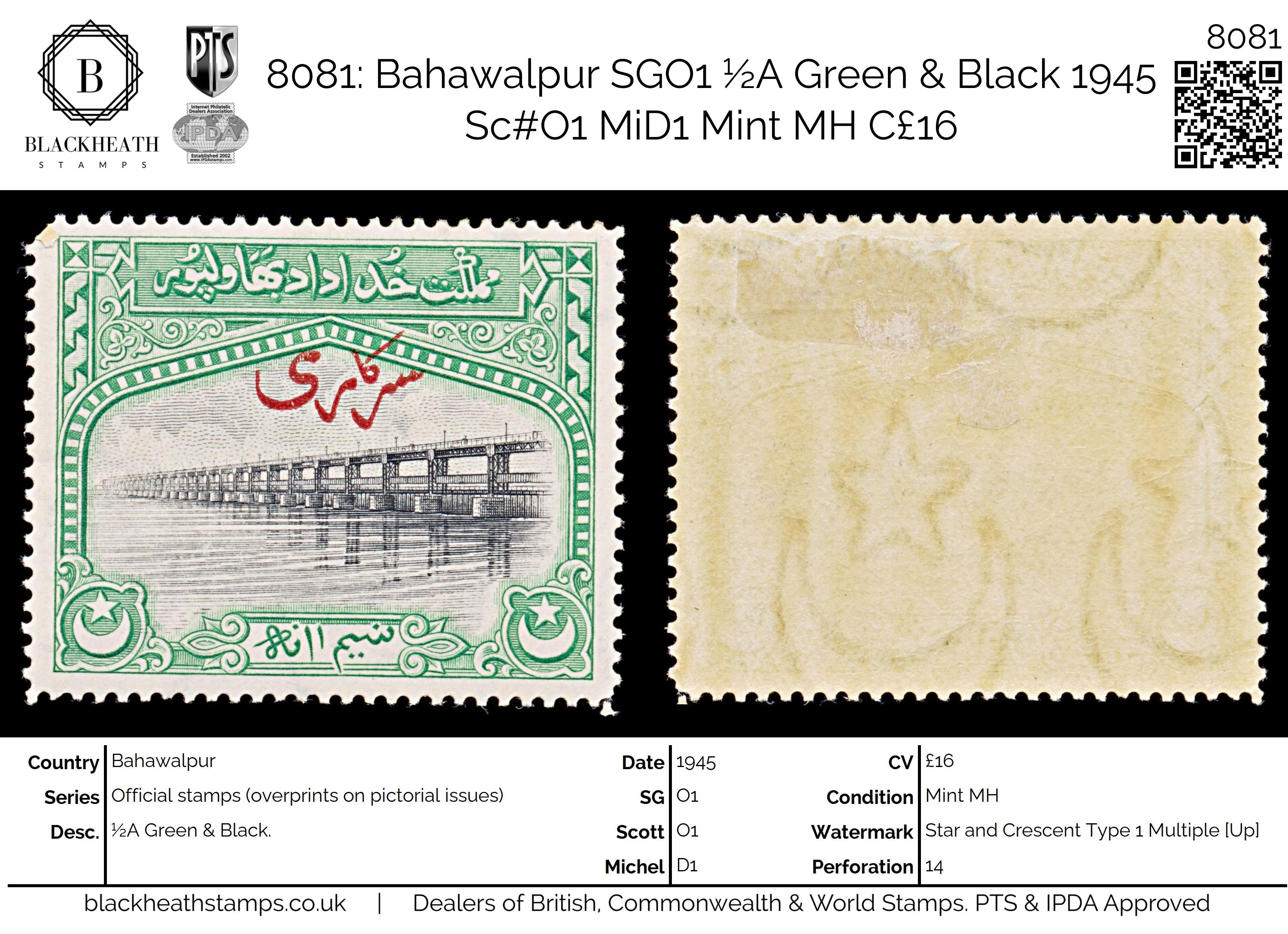 8081: Bahawalpur SGO1 ½A Green & Black 1945 Sc#O1 MiD1 Mint MH C£16