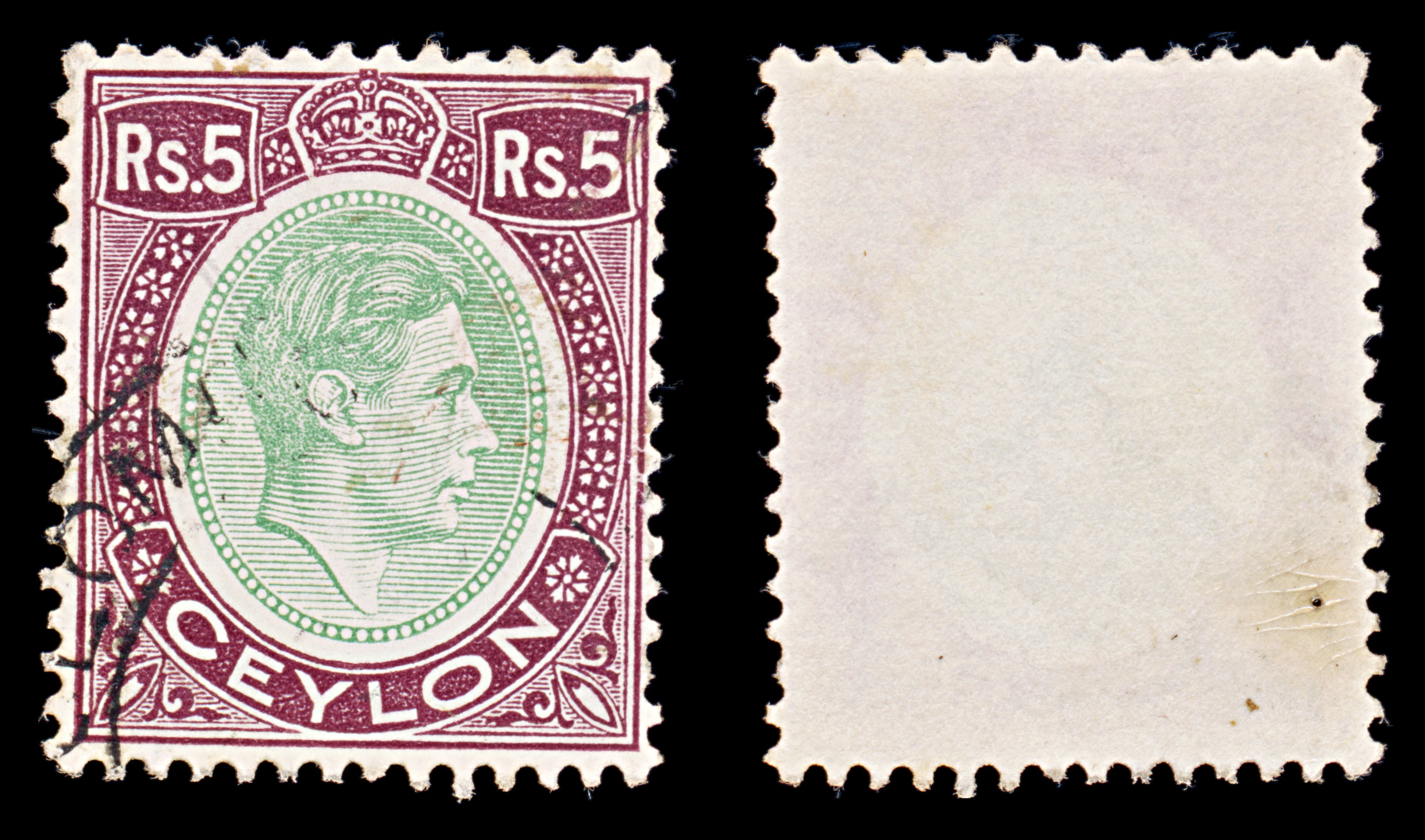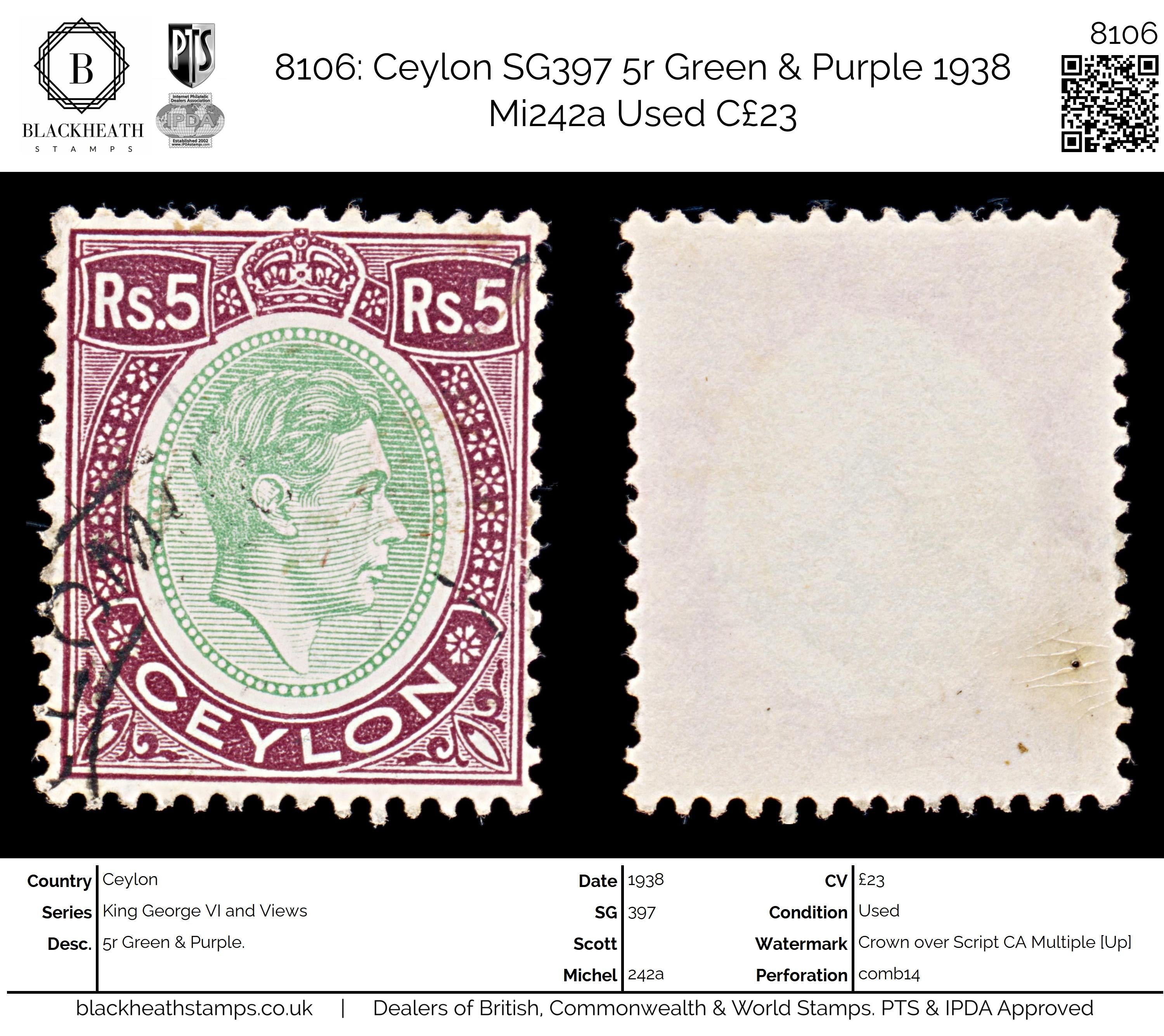 8106: Ceylon SG397 5r Green & Purple 1938 Mi242a Used C£23