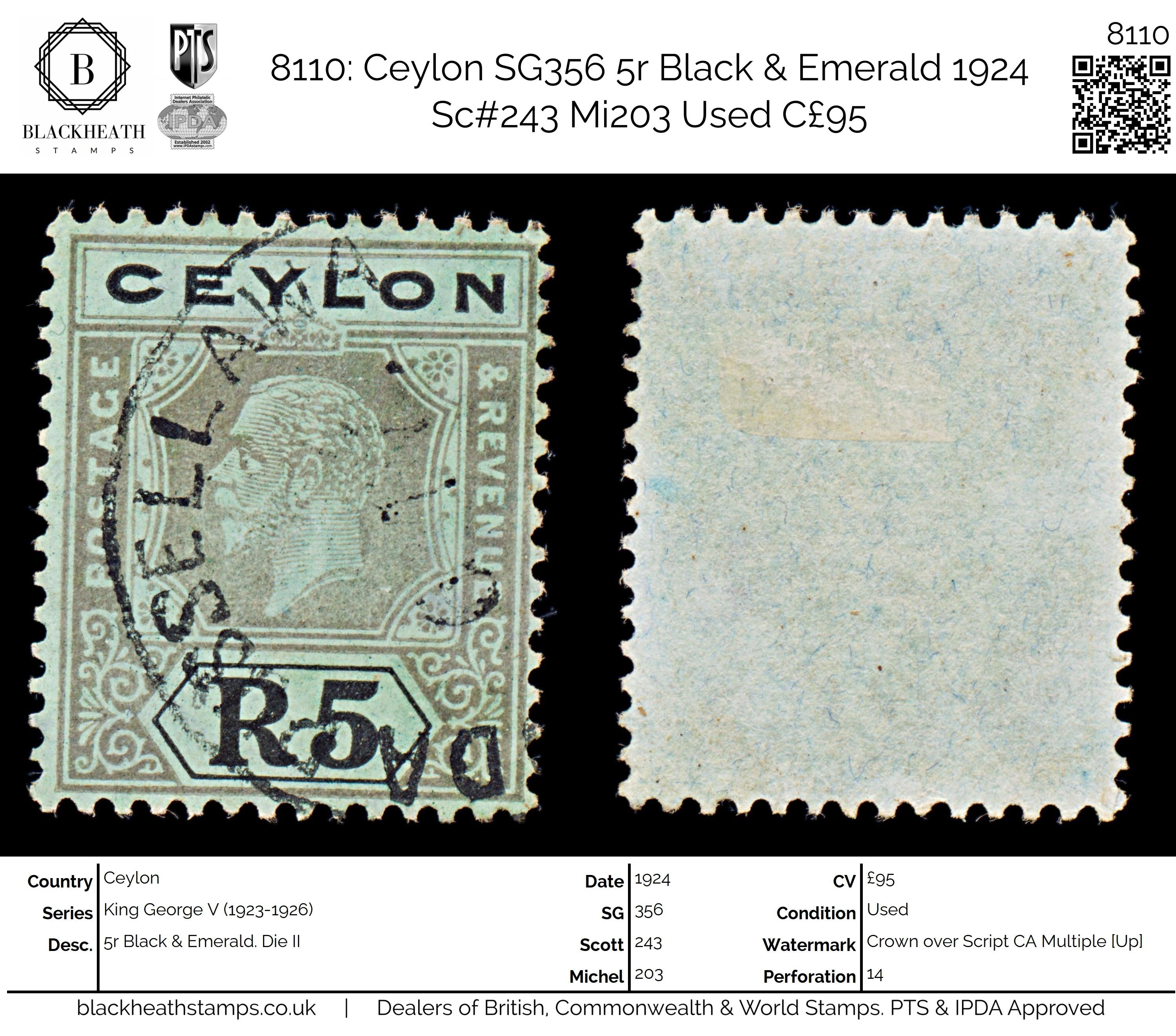 8110: Ceylon SG356 5r Black & Emerald 1924 Sc#243 Mi203 Uséd C£95: Die II