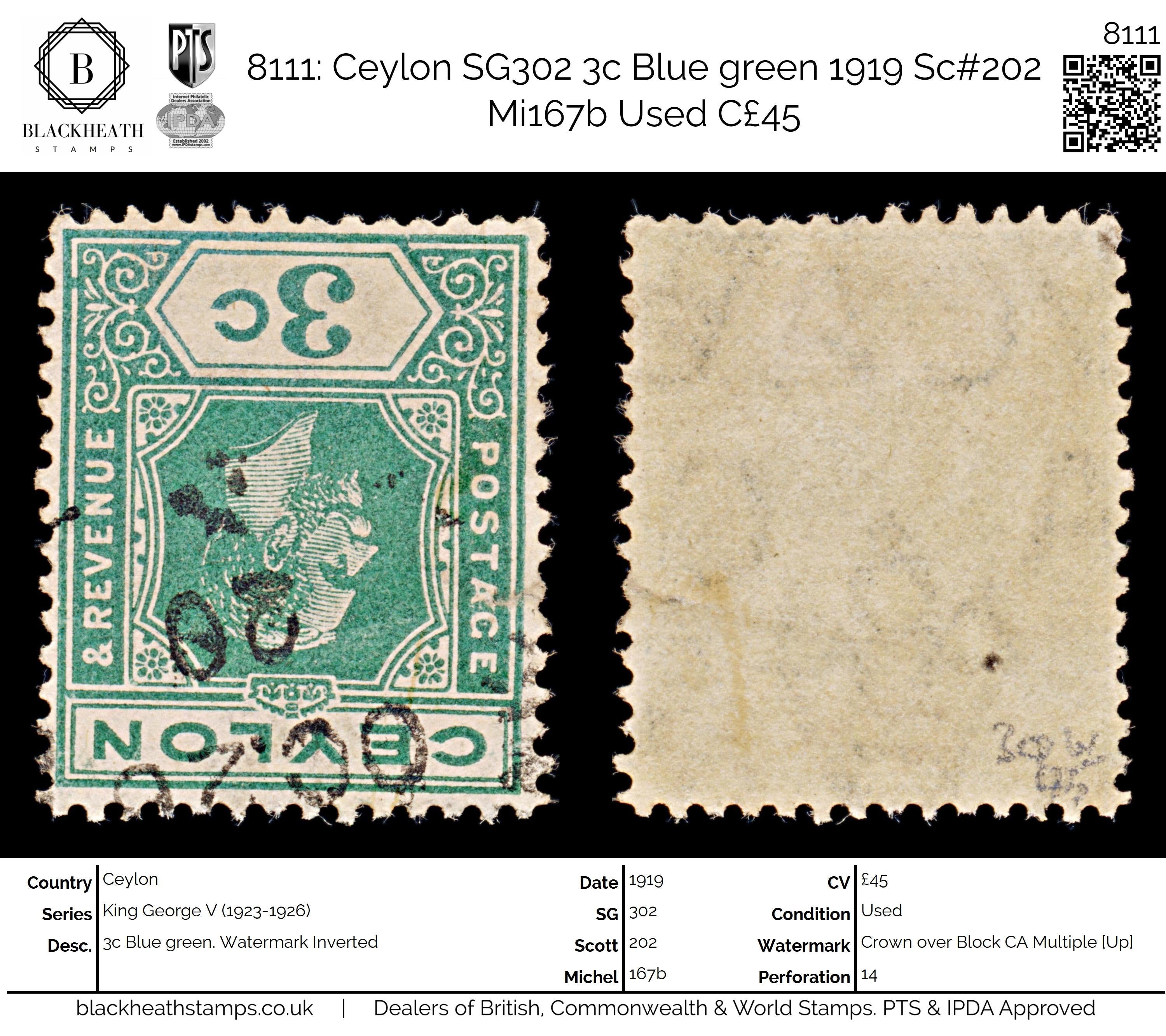 8111: Ceylon SG302 3c Blue green 1919 Sc#202 Mi167b Uséd C£45: Watermark Inverted