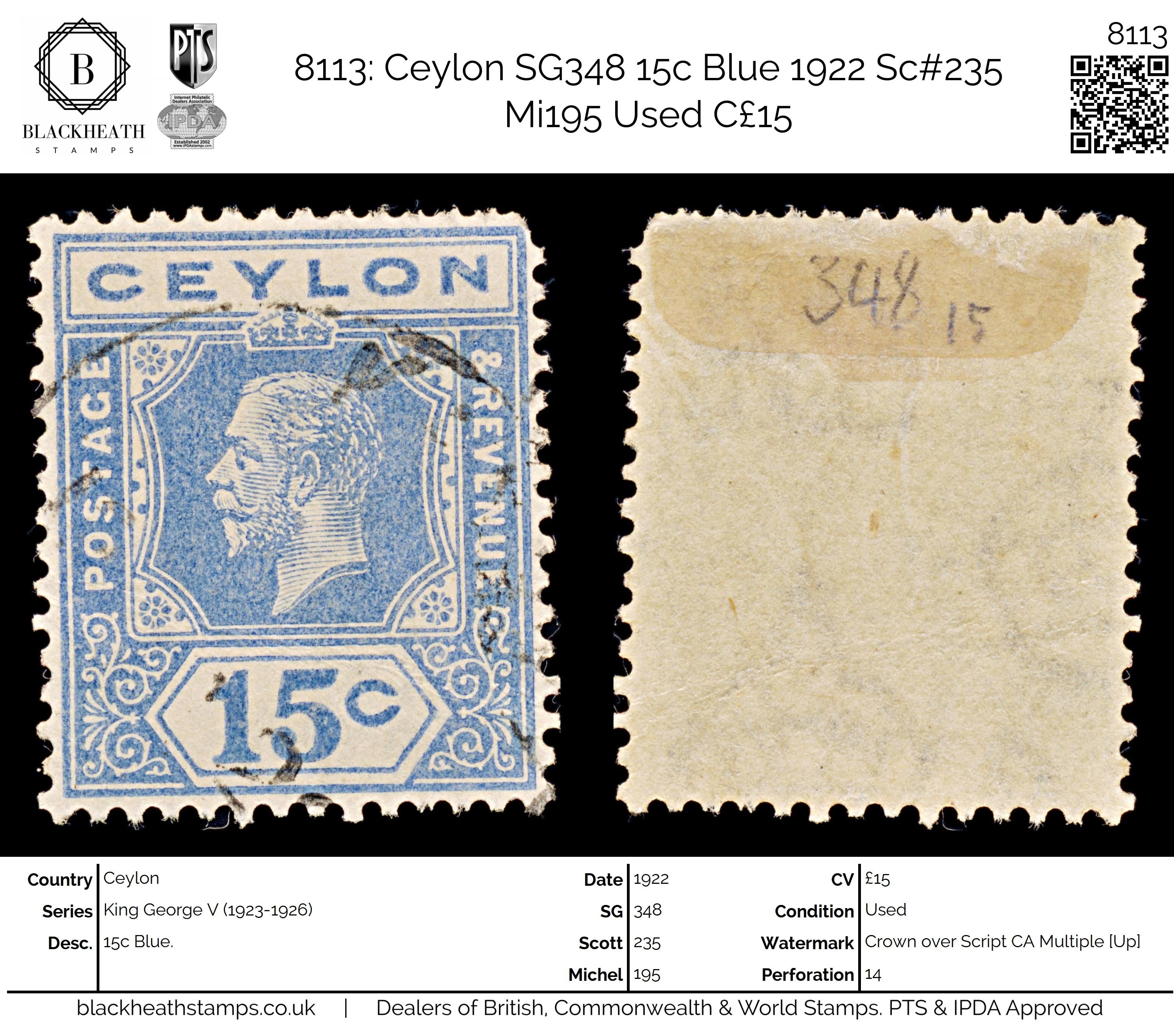 8113: Ceylon SG348 15c Blue 1922 Sc#235 Mi195 Uséd C£15