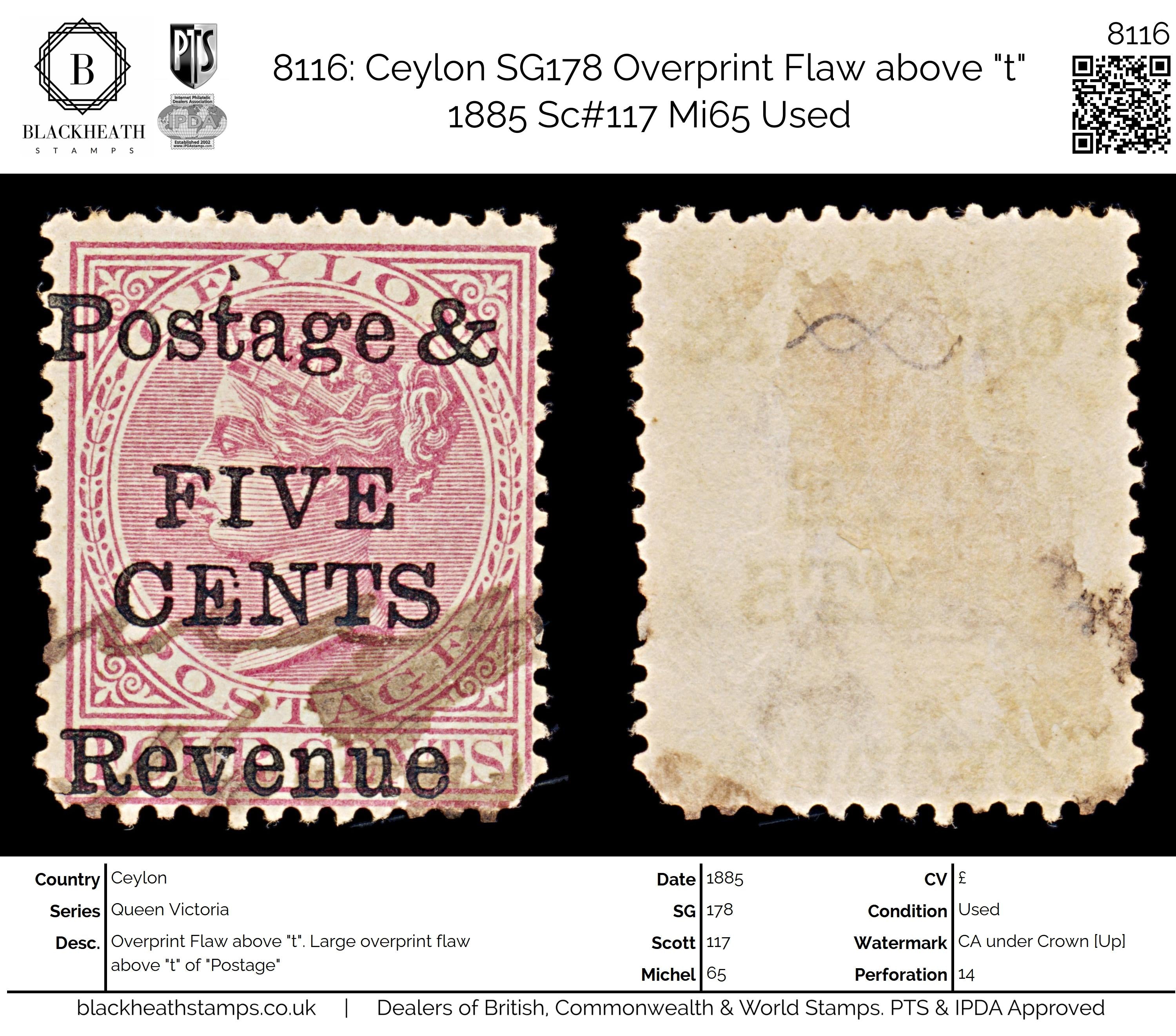 8116: Ceylon SG178 Overprint Flaw above "t" 1885 Sc#117 Mi65 Used