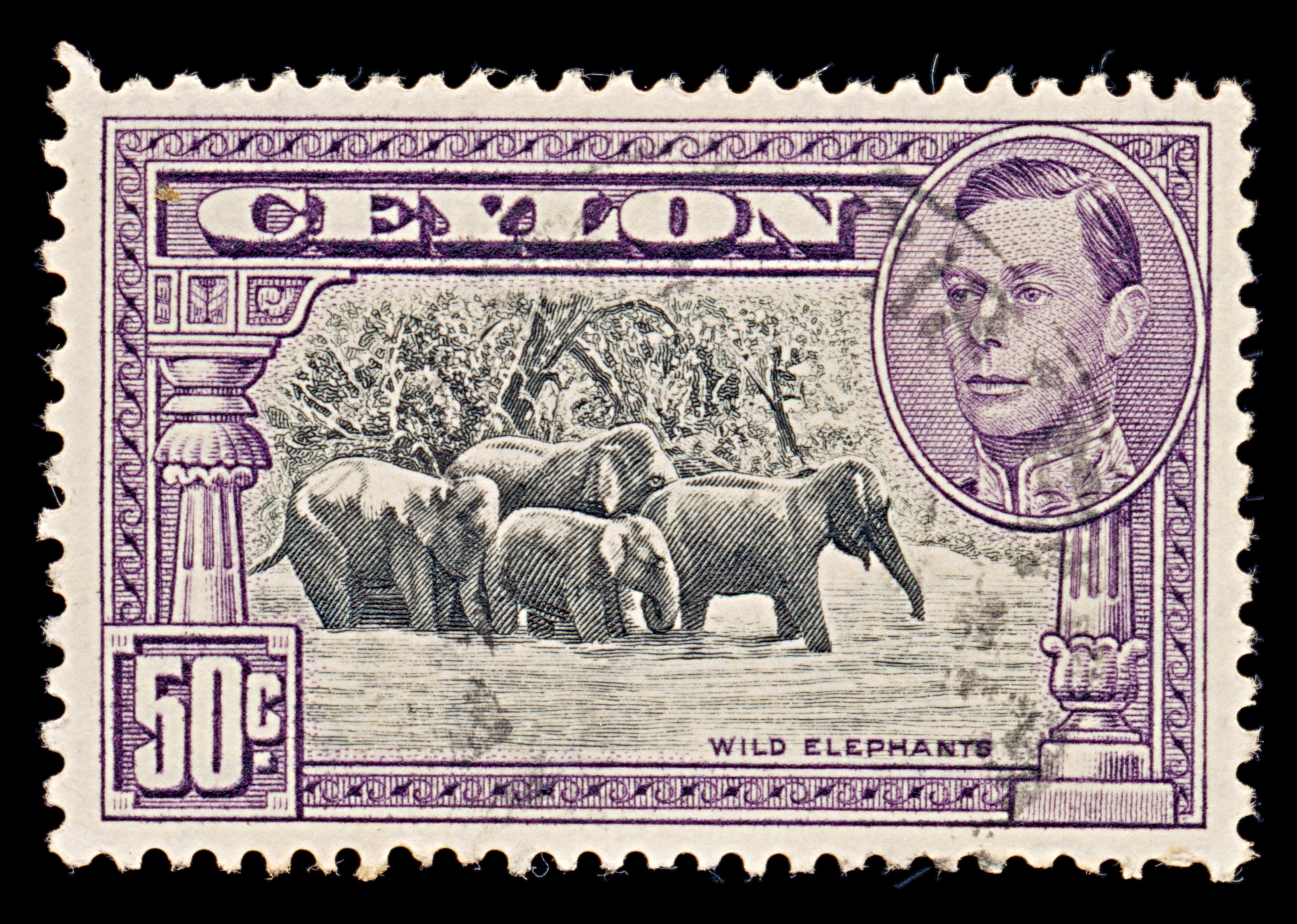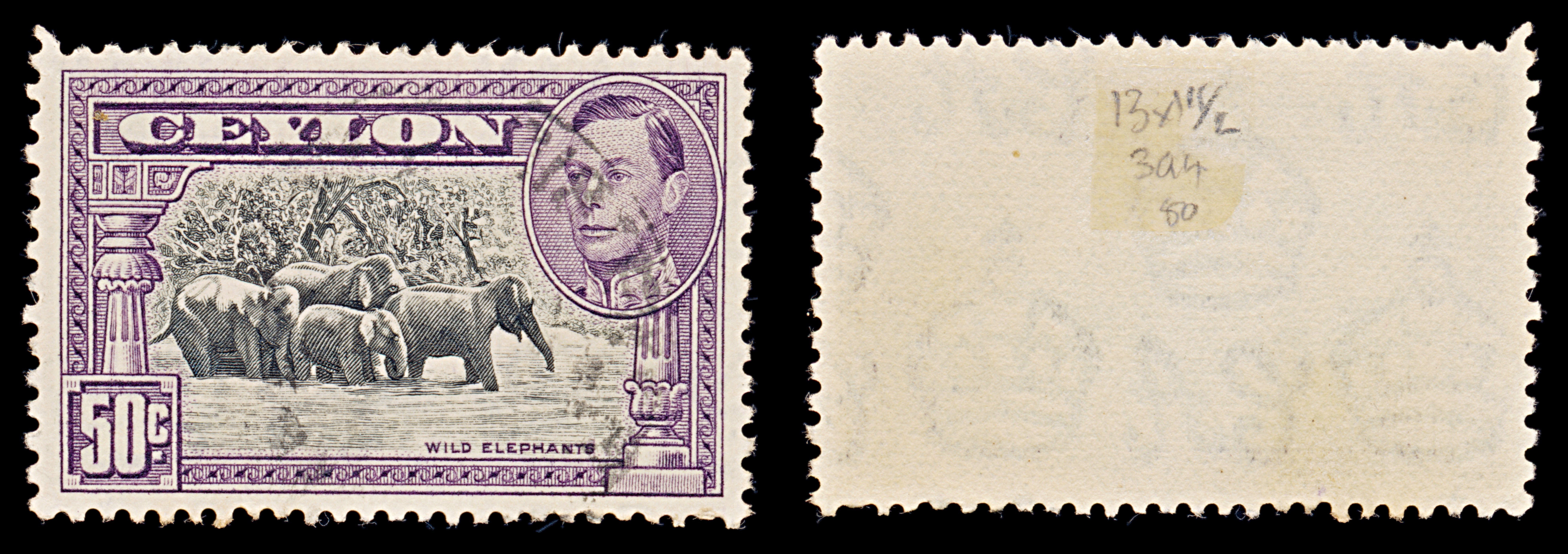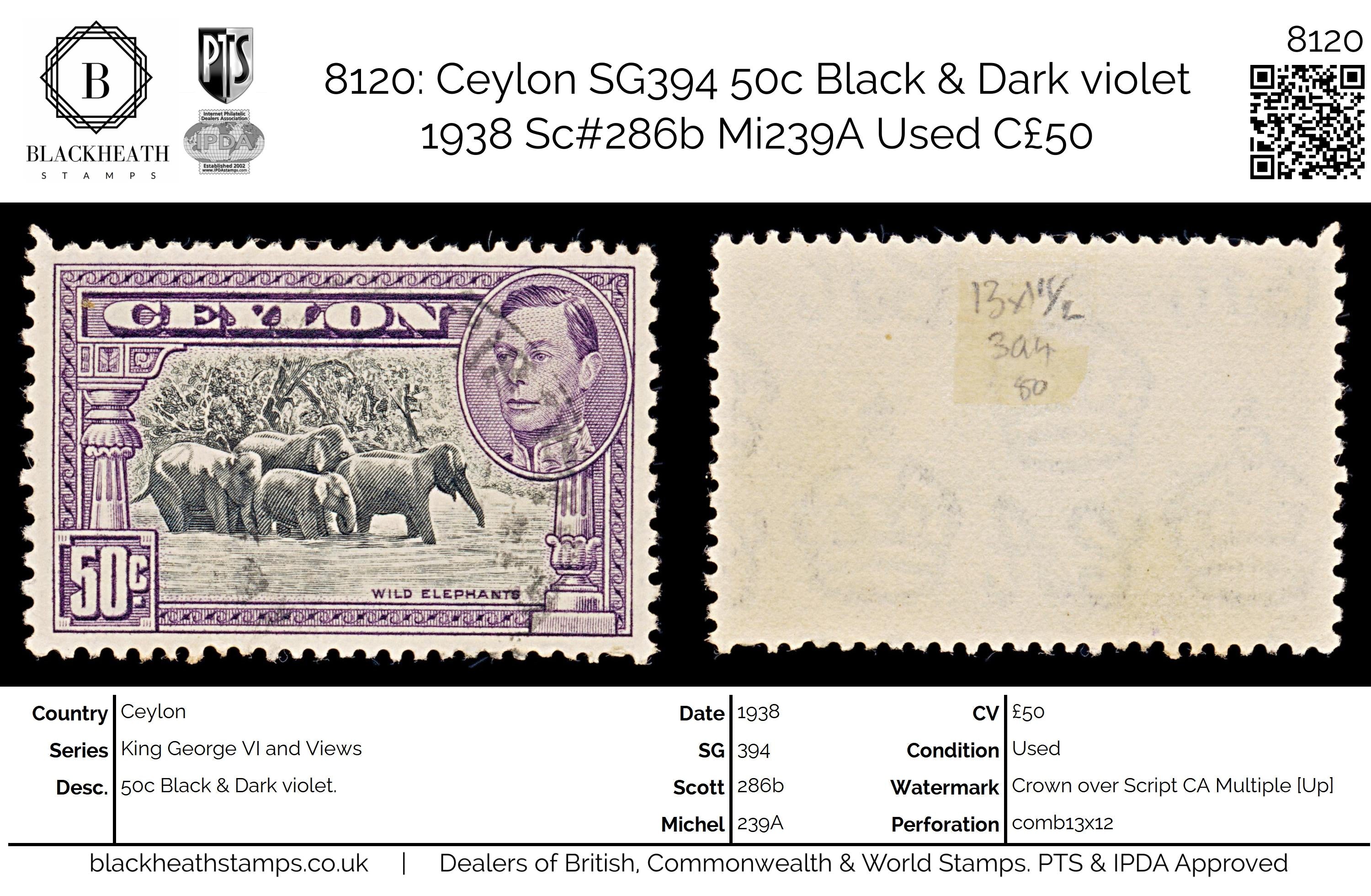 8120: Ceylon SG394 50c Black & Dark violet 1938 Sc#286b Mi239A Uséd C£50