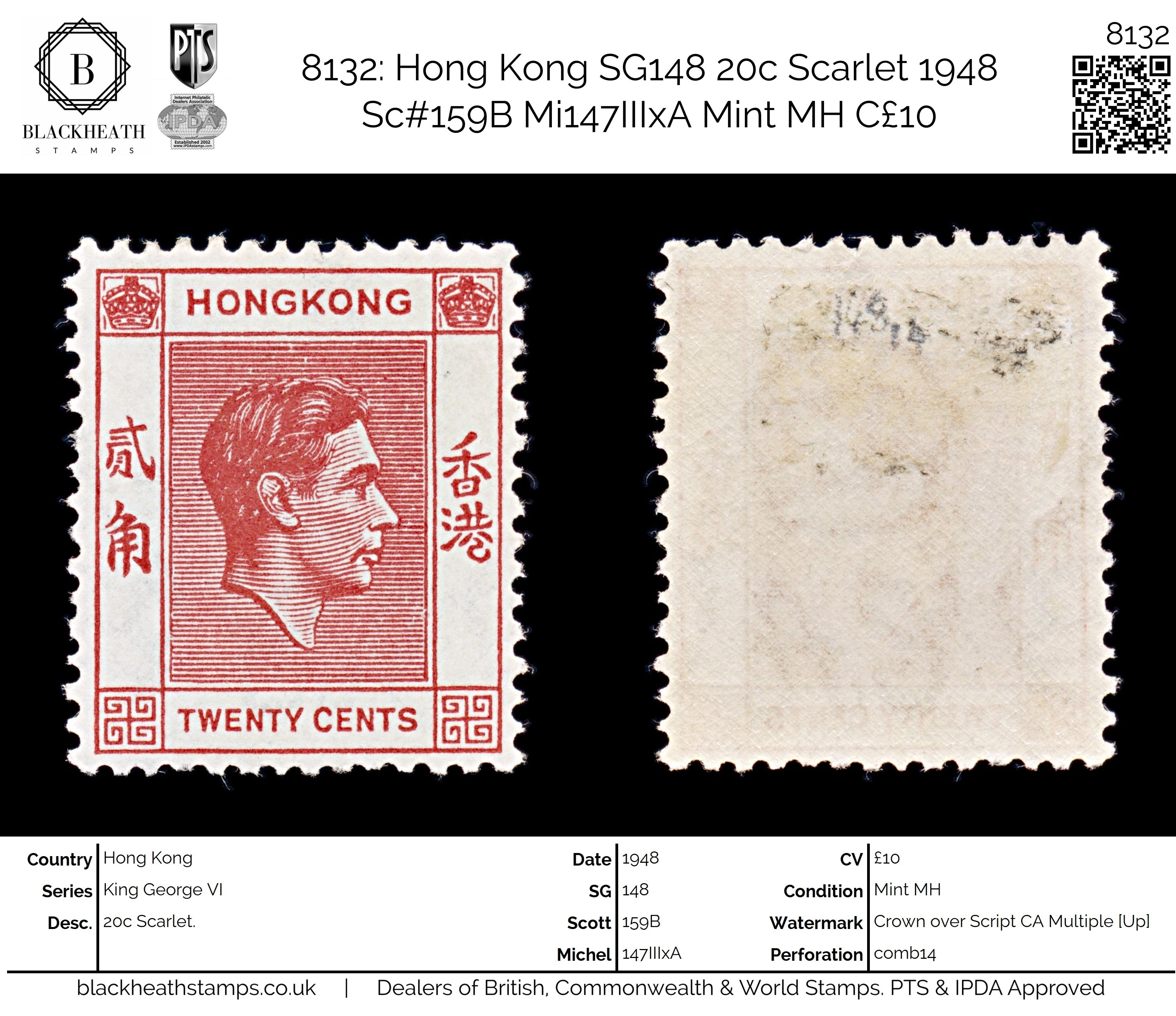 8132: Hong Kong SG148 20c Scarlet 1948 Sc#159B Mi147IIIxA Mint MH C£10