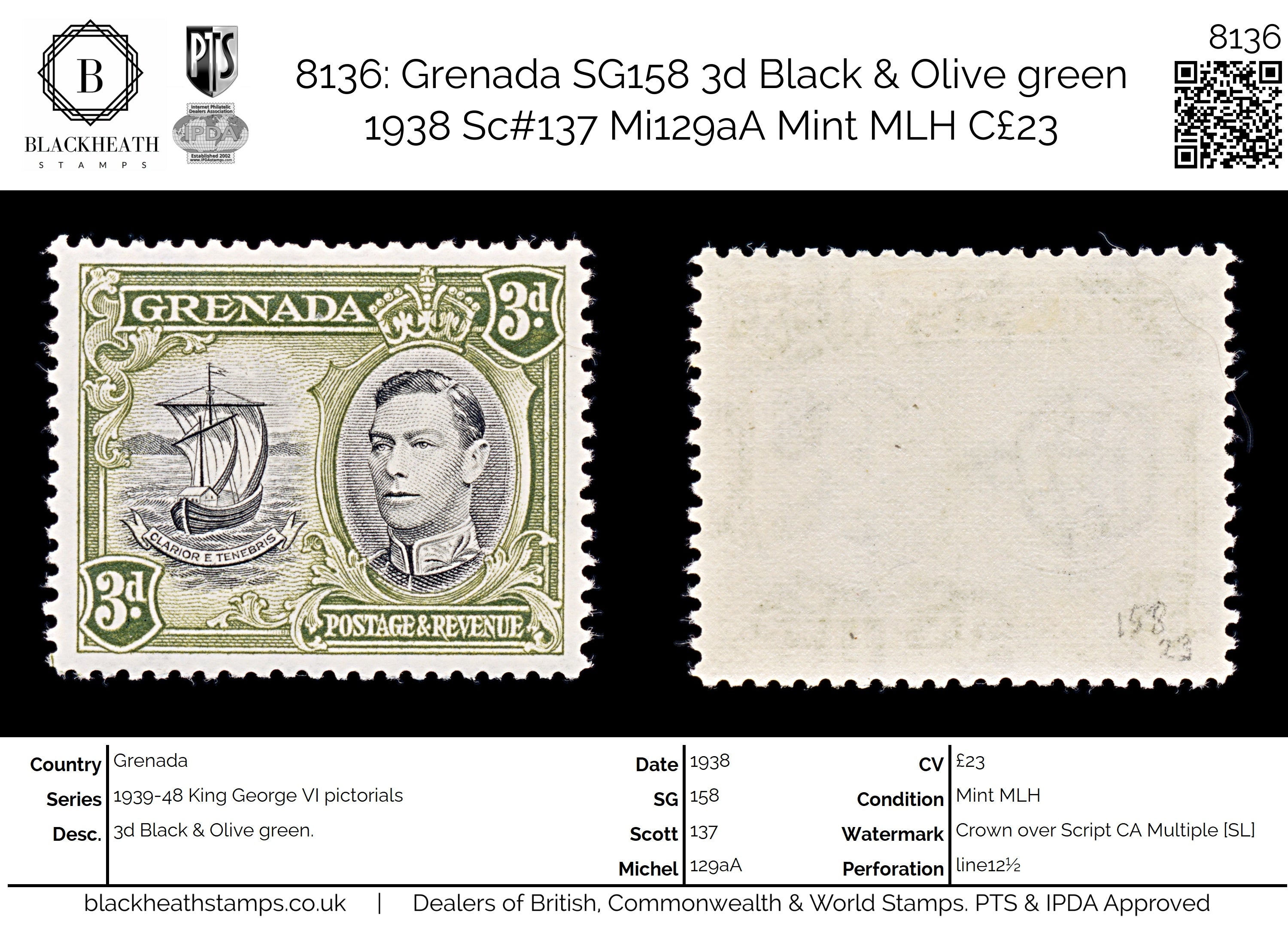 8136: Grenada SG158 3d Black & Olive green 1938 Sc#137 Mi129aA Mint MLH C£23