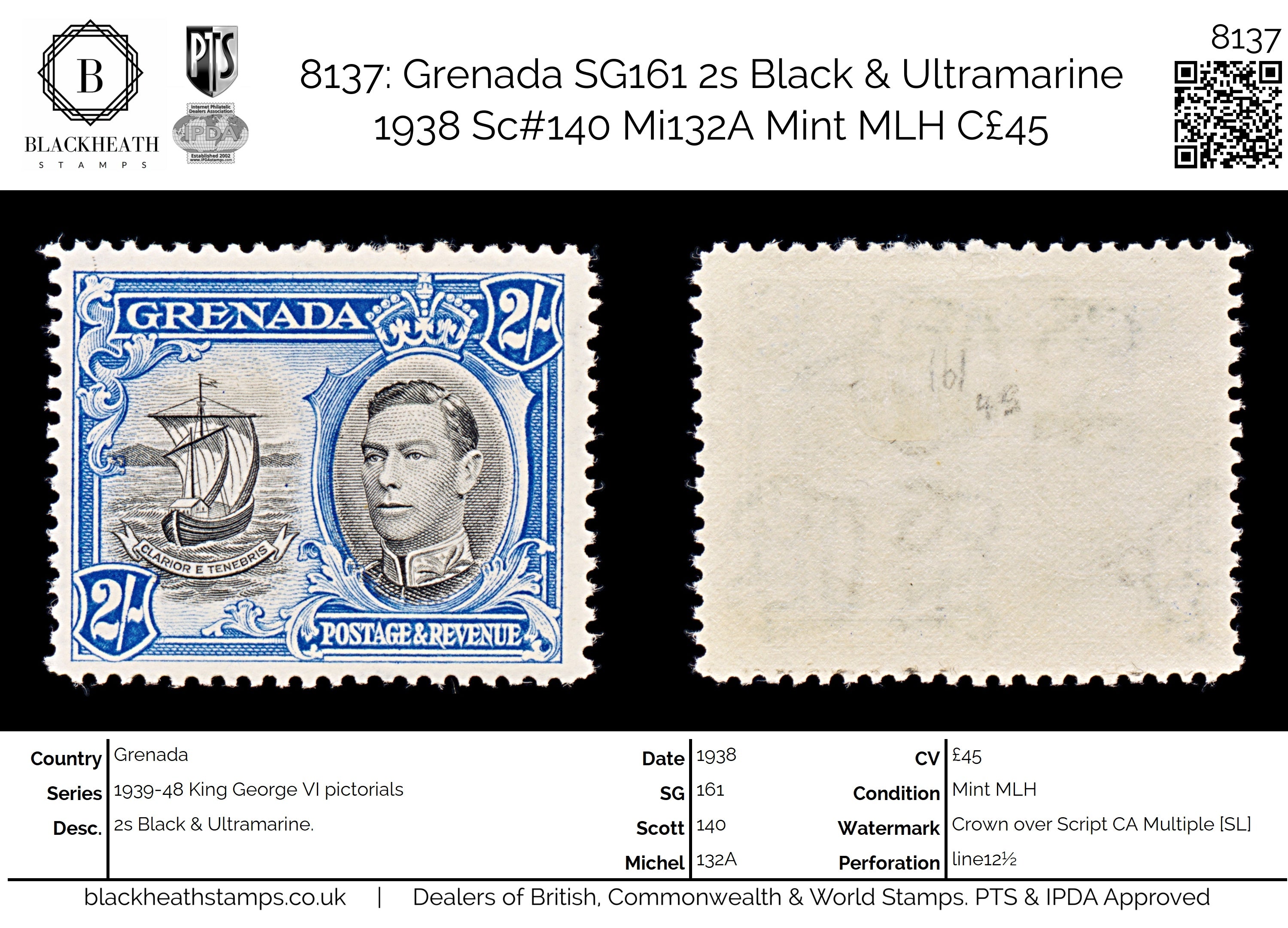8137: Grenada SG161 2s Black & Ultramarine 1938 Sc#140 Mi132A Mint MLH C£45