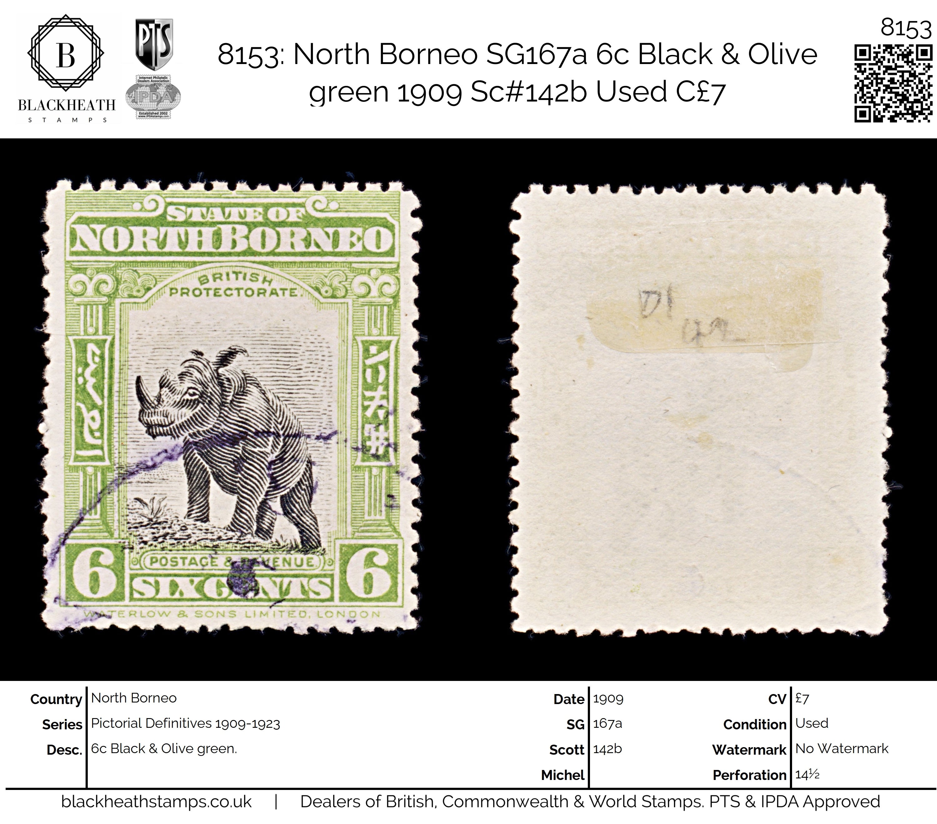 8153: North Borneo SG167a 6c Black & Olive green 1909 Sc#142b Uséd C£7