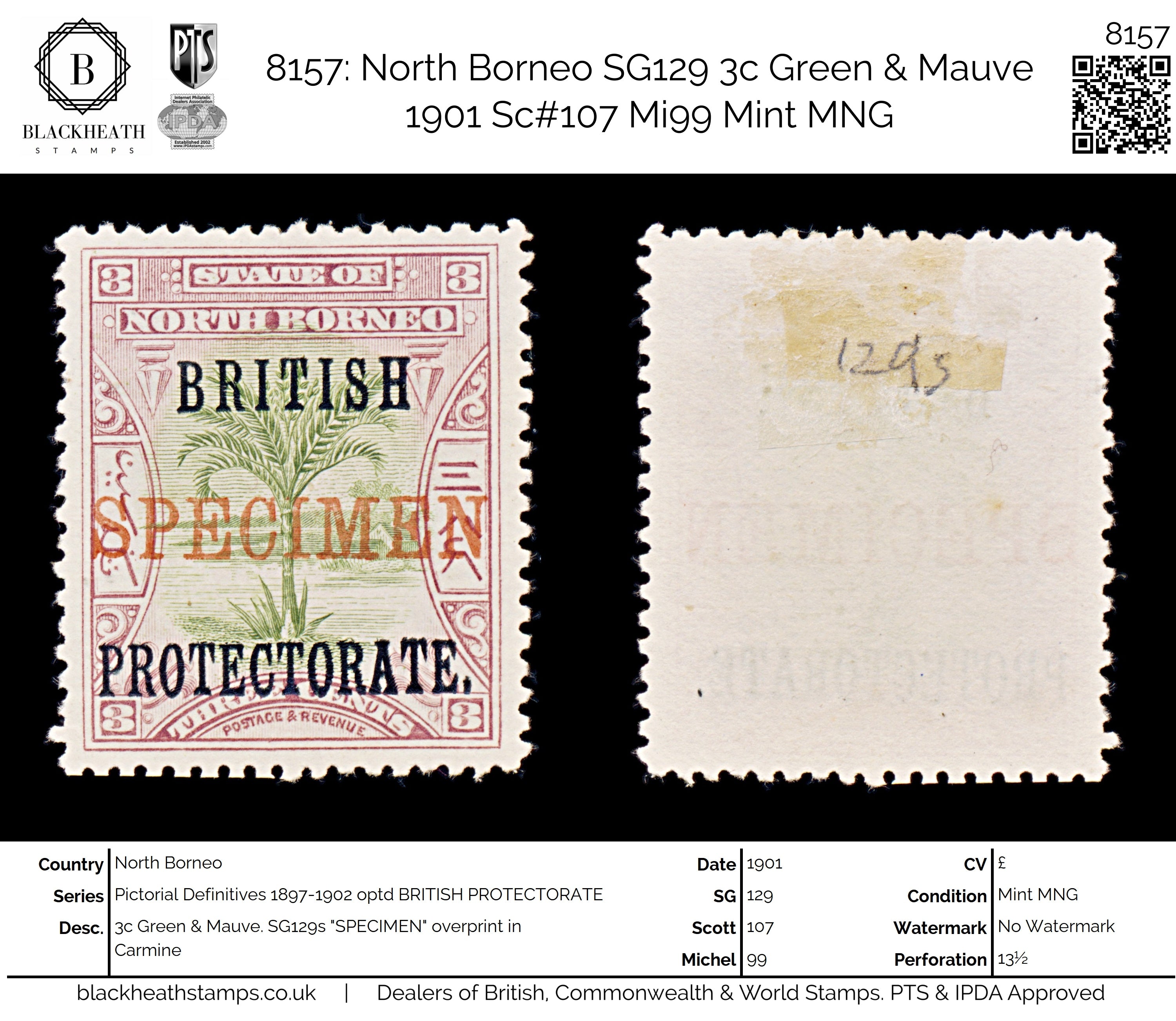 8157: North Borneo SG129 3c Green & Mauve 1901 Sc#107 Mi99 Mint MNG: SG129s "SPECIMEN" overprint in Carmine
