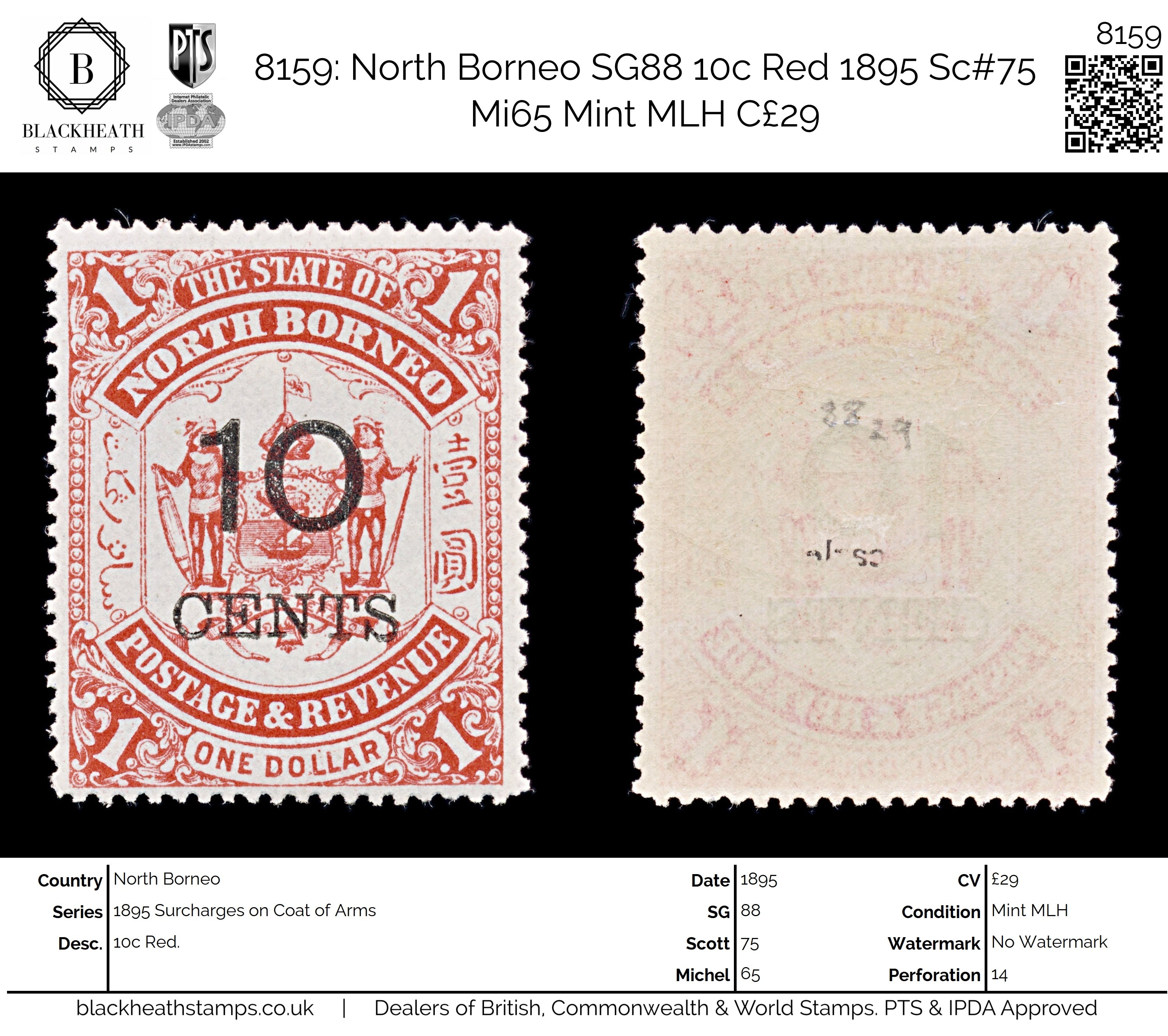8159: North Borneo SG88 10c Red 1895 Sc#75 Mi65 Mint MLH C£29