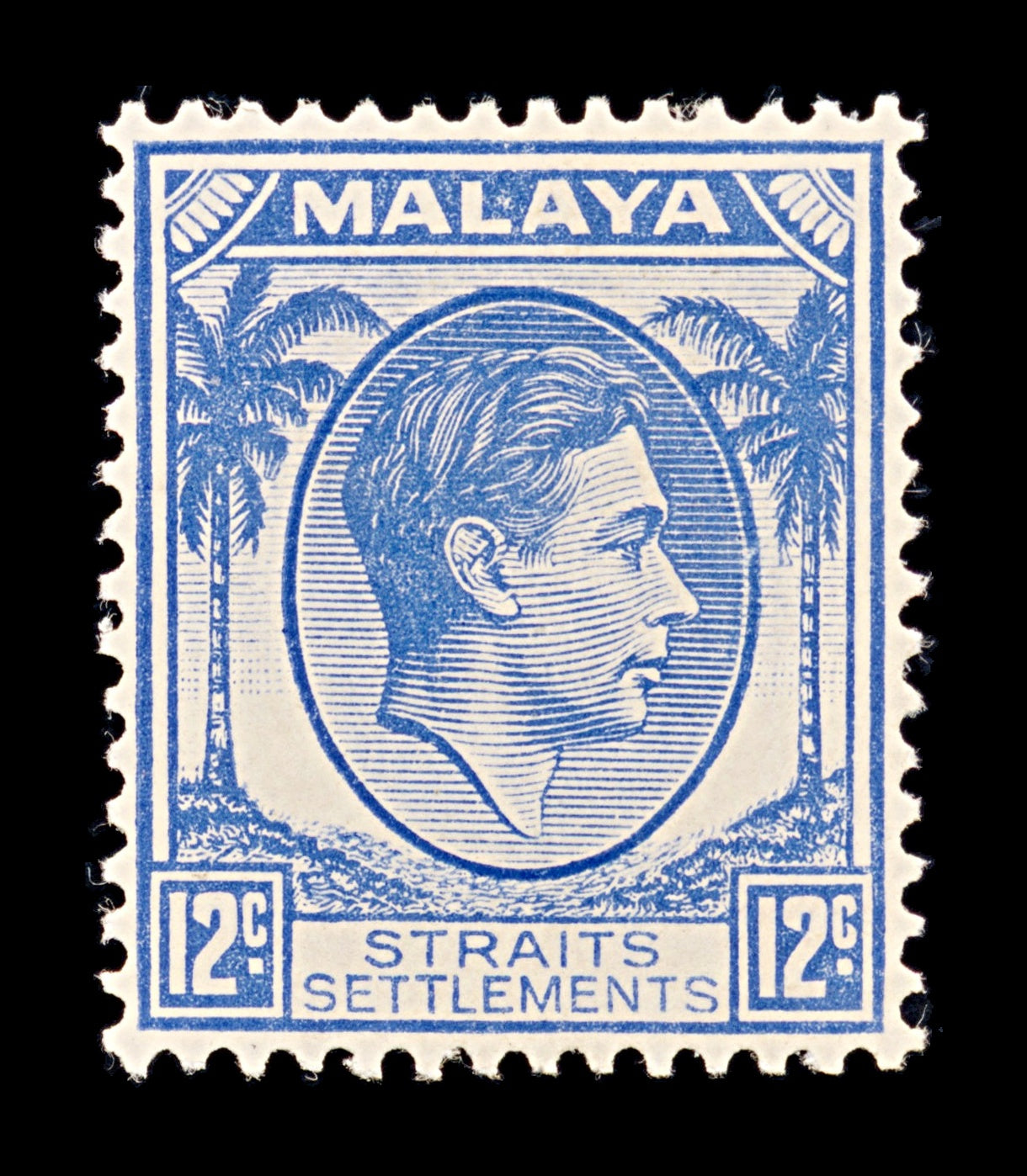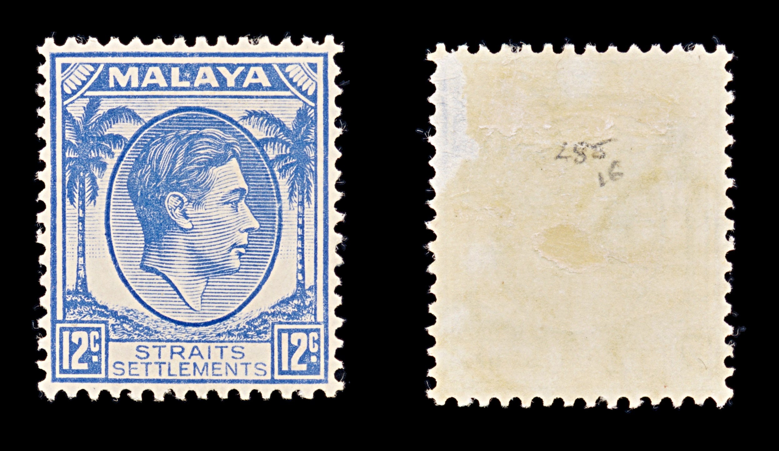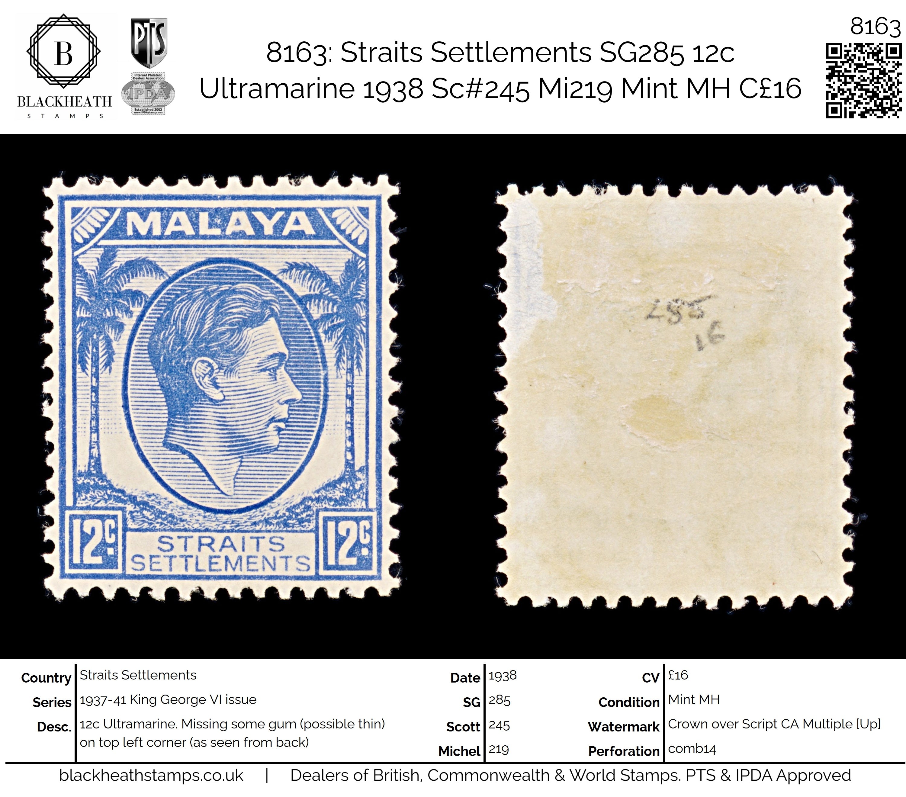 8163: Straits Settlements SG285 12c Ultramarine 1938 Sc#245 Mi219 Mint MH C£16: Missing some gum (possible thin) on top left corner (as seen from back)