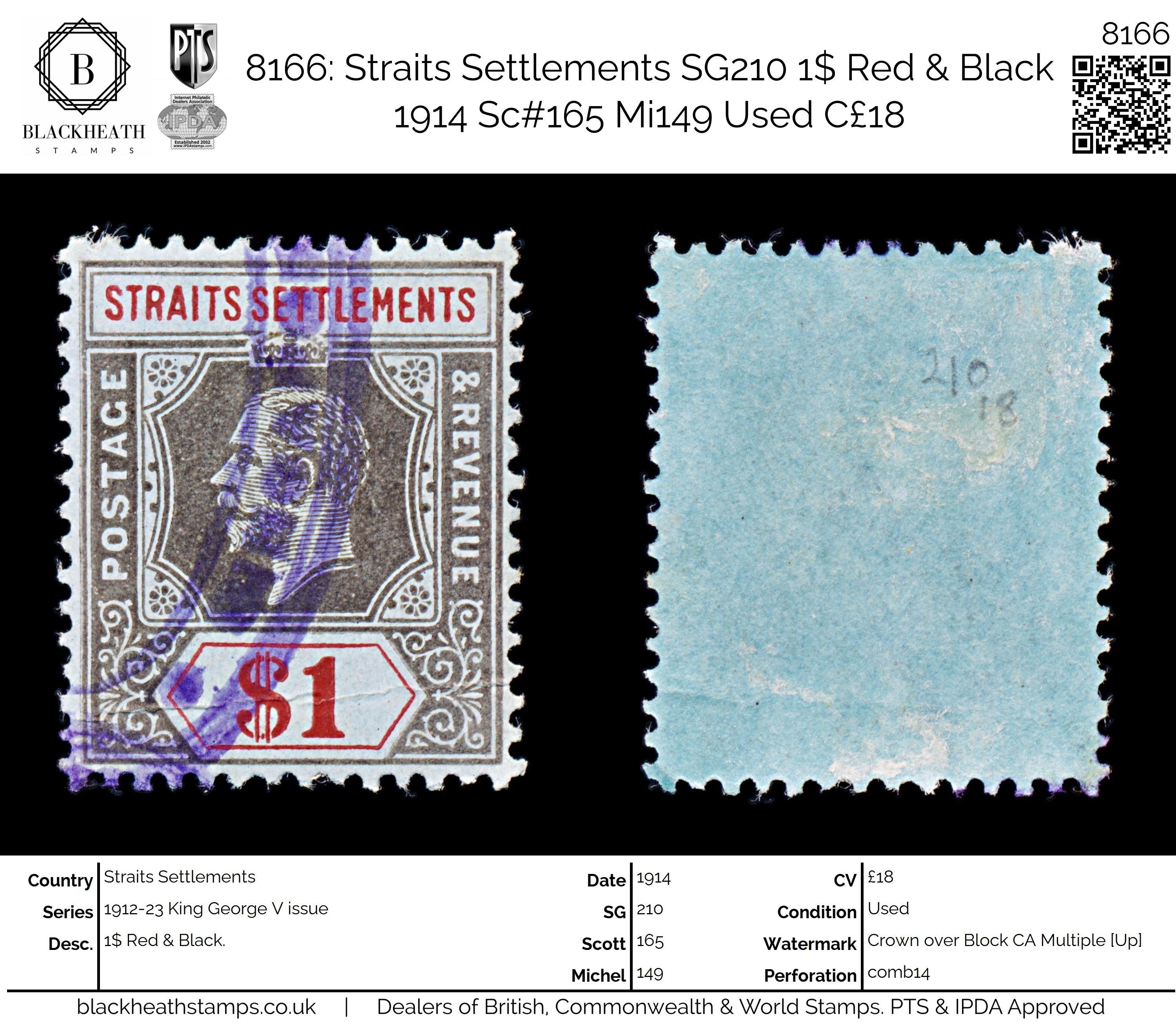 8166: Straits Settlements SG210 1$ Red & Black 1914 Sc#165 Mi149 Uséd C£18