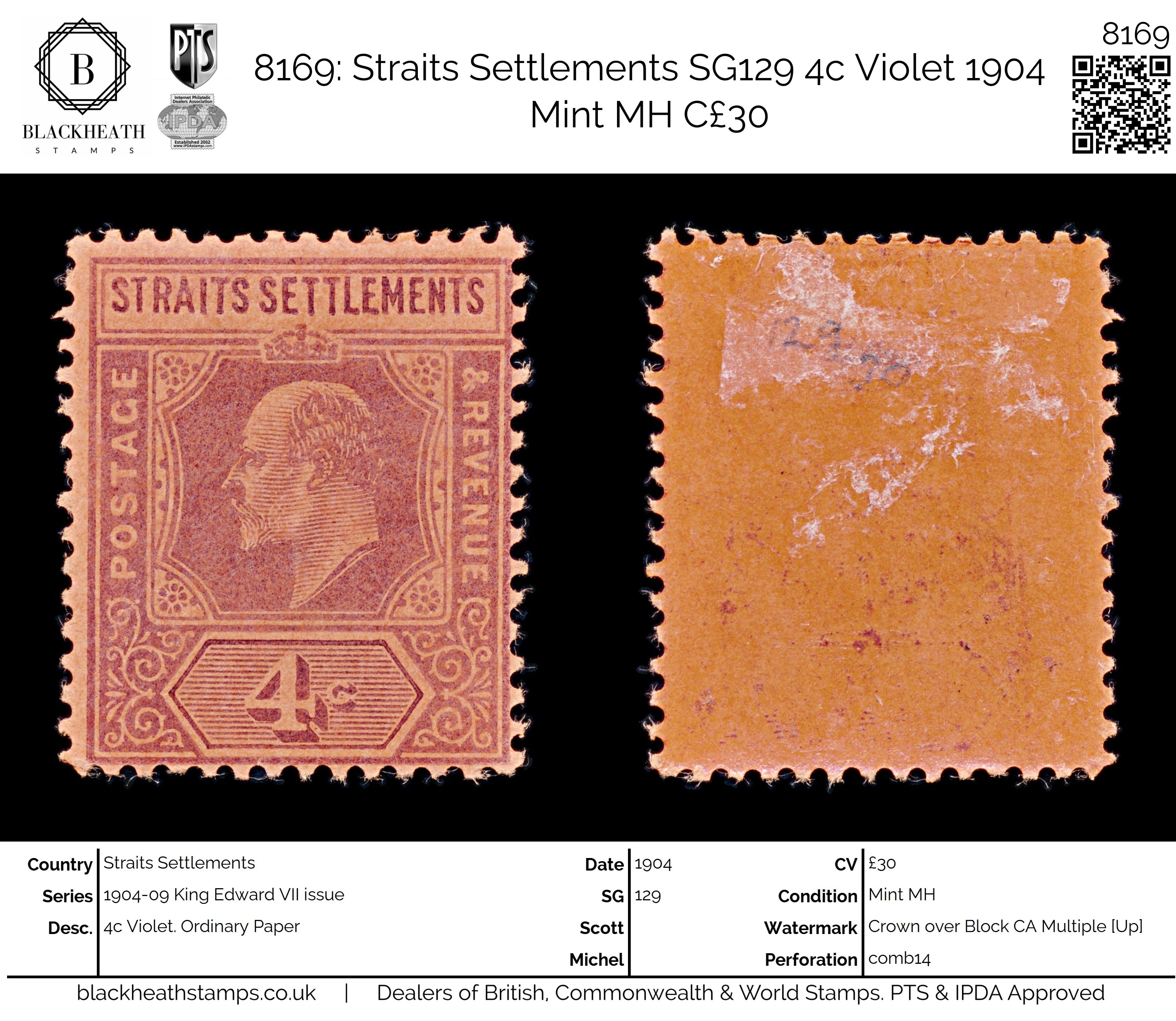 8169: Straits Settlements SG129 4c Violet 1904 Mint MH C£30