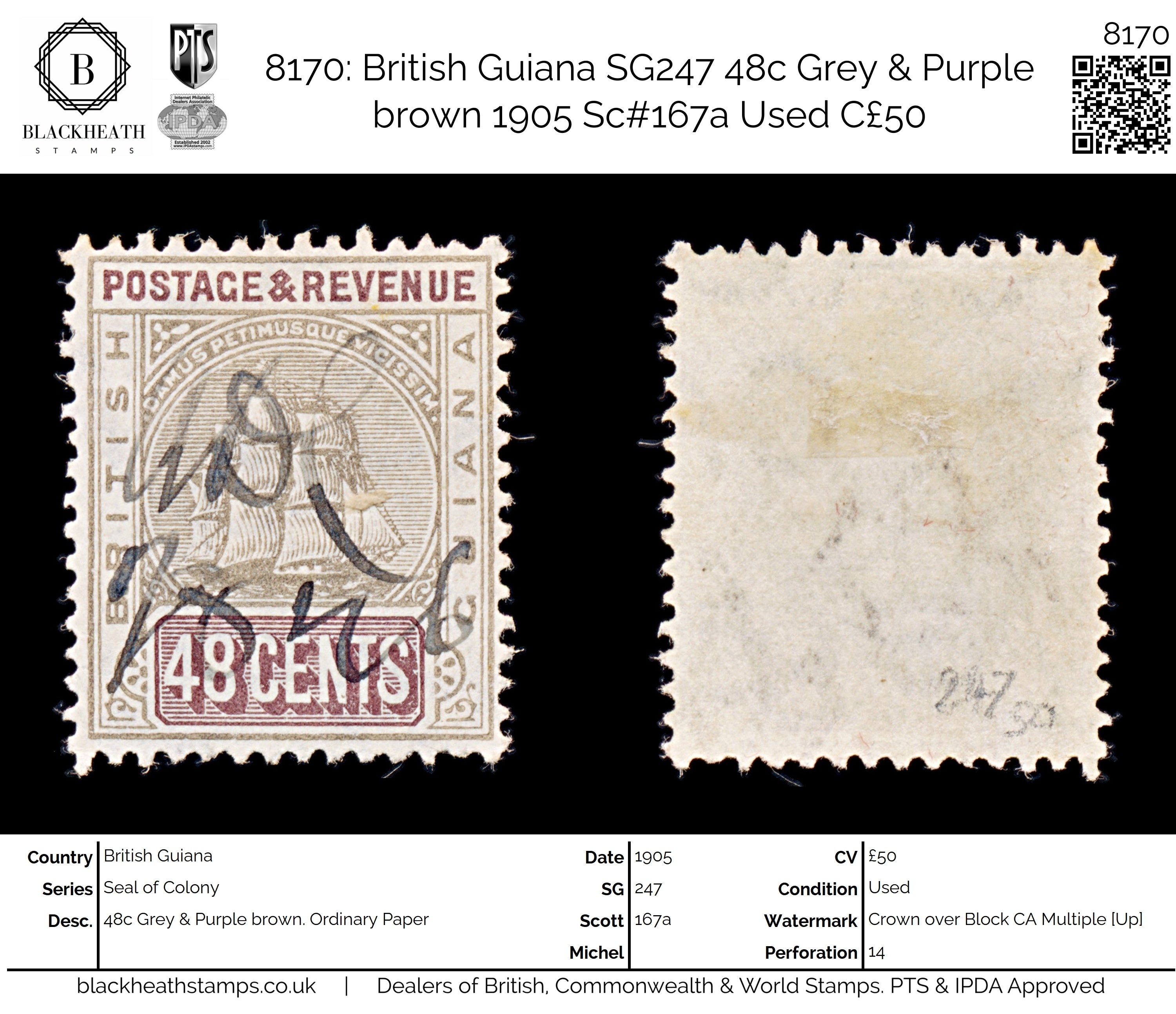 8170: British Guiana SG247 48c Grey & Purple brown 1905 Sc#167a Uséd C£50: Ordinary Paper