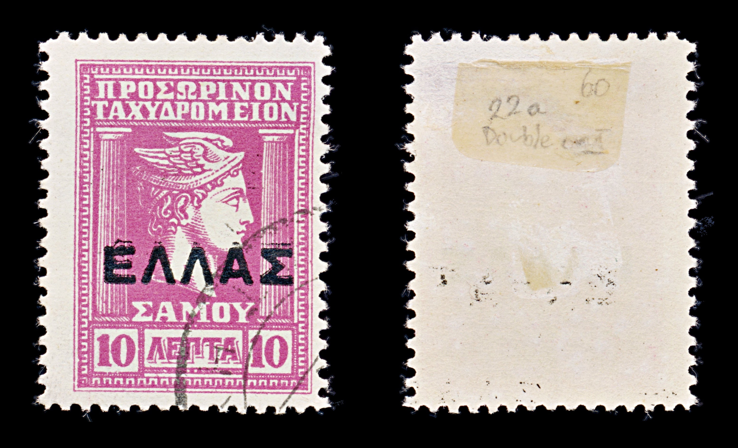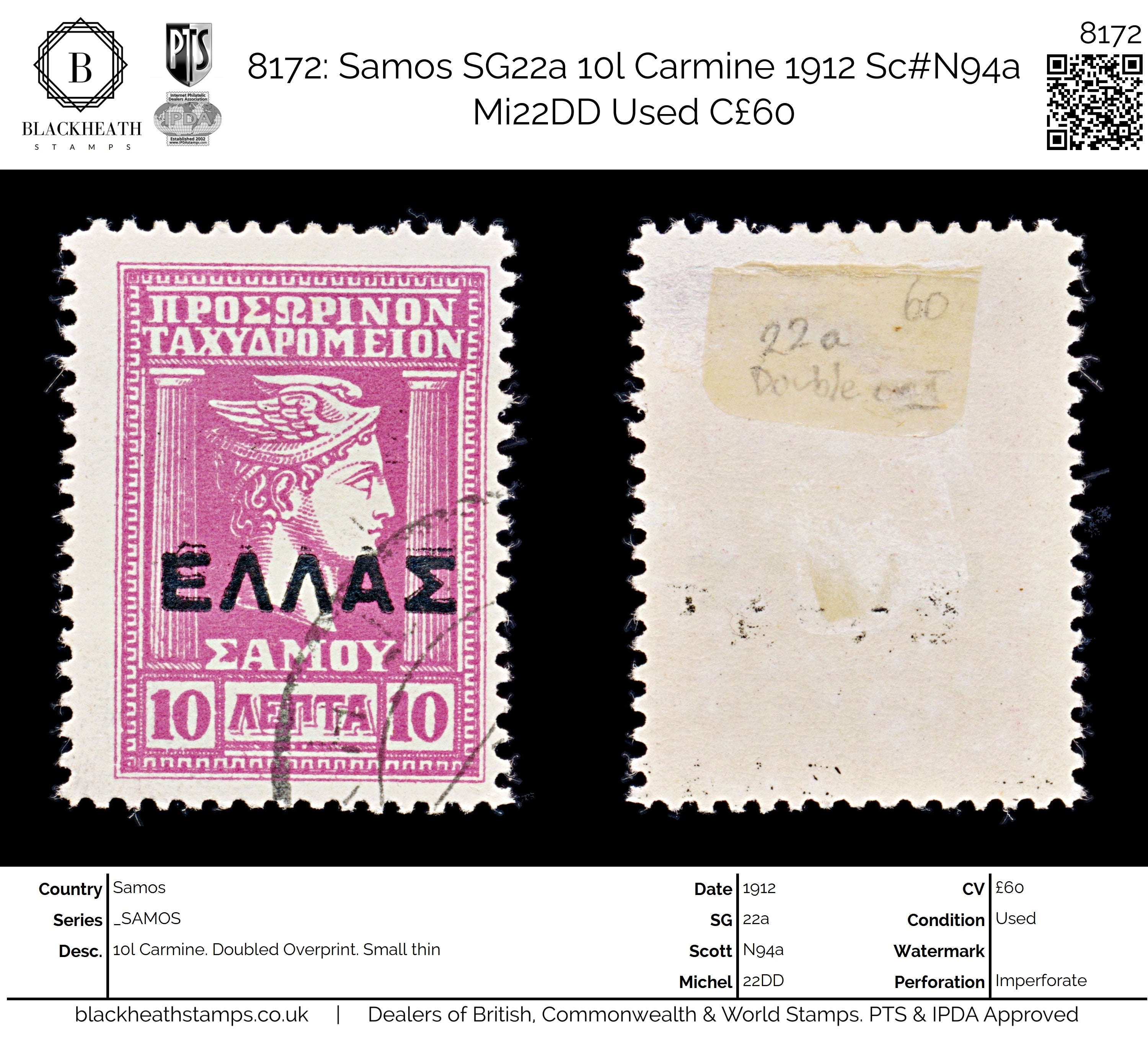 8172: Samos SG22a 10l Carmine 1912 Sc#N94a Mi22DD Uséd C£60: Doubled Overprint. Small thin