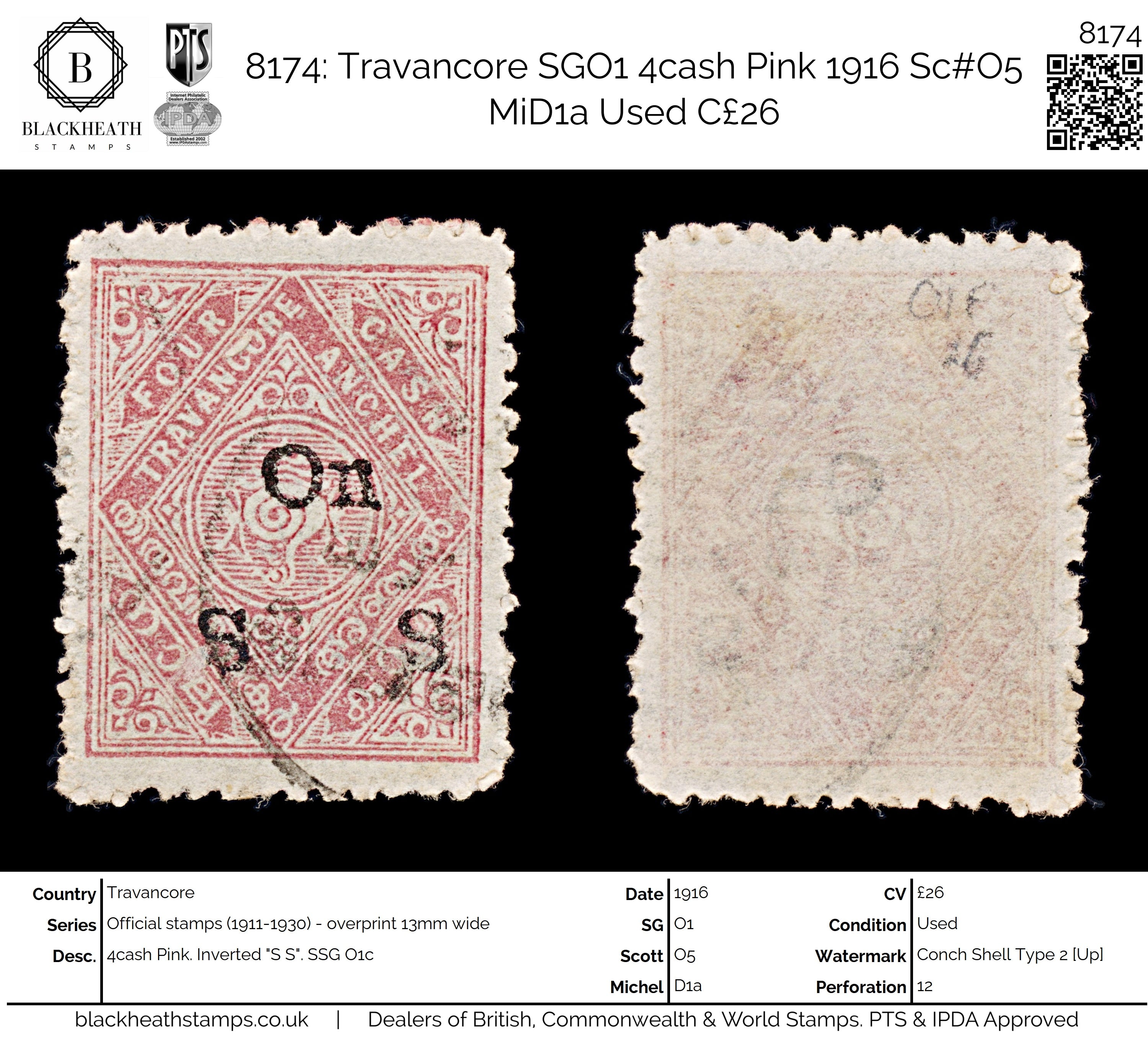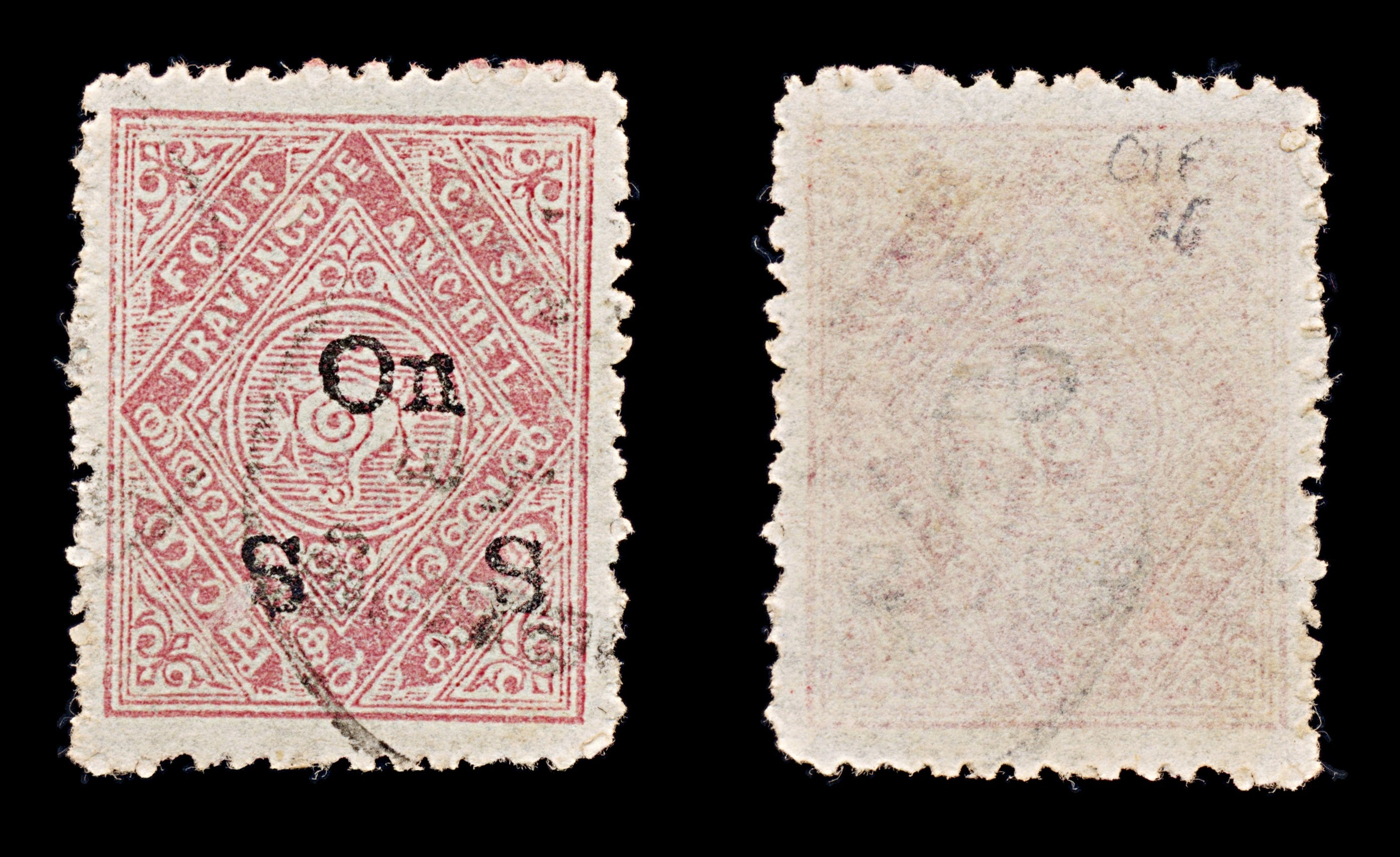 8174: Travancore SGO1 4cash Pink 1916 Sc#O5 MiD1a Uséd C£26: Inverted "S S". SSG O1c