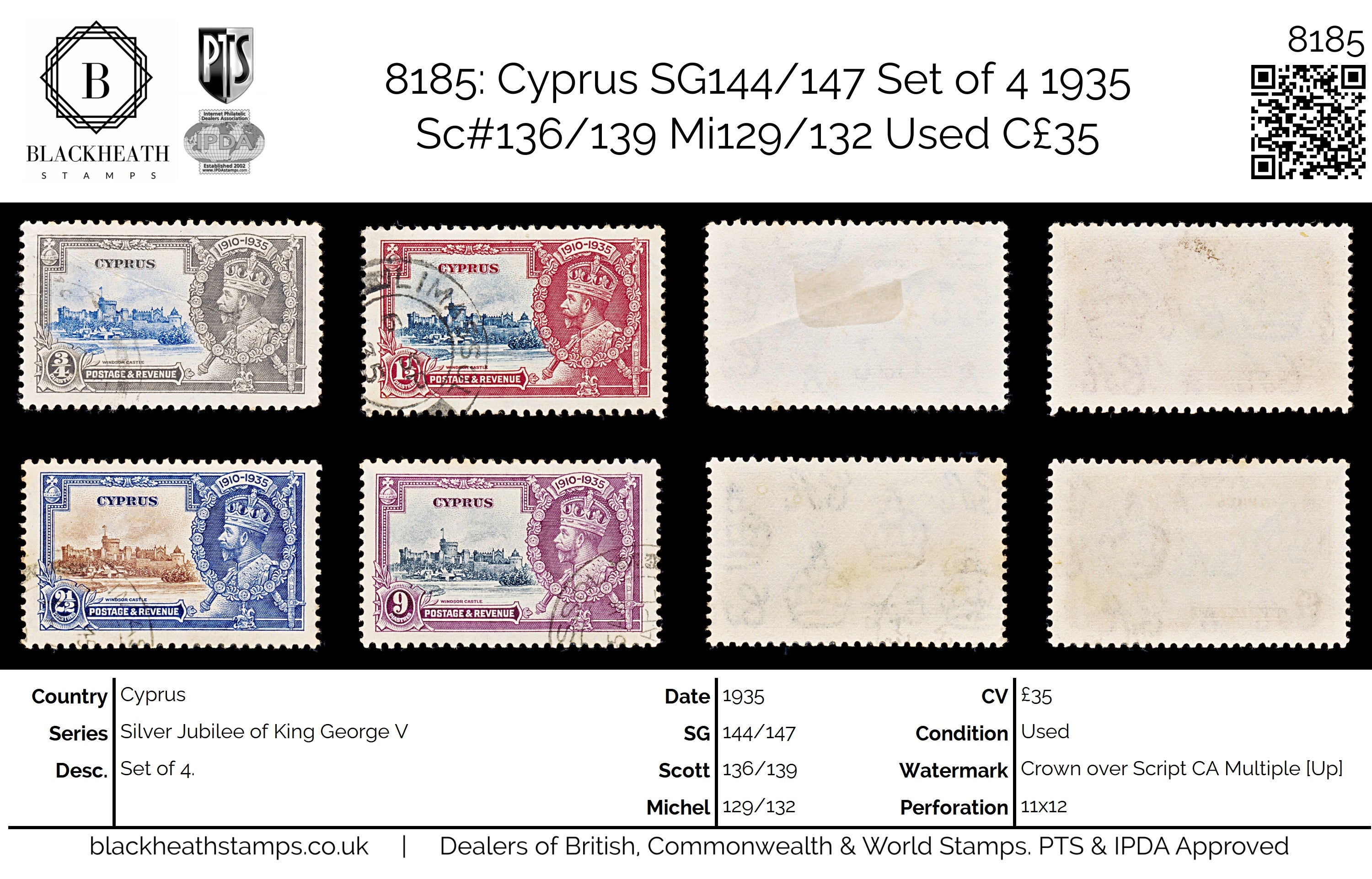 8185: Cyprus SG144/147 Set of 4 1935 Sc#136/139 Mi129/132 Used C£35