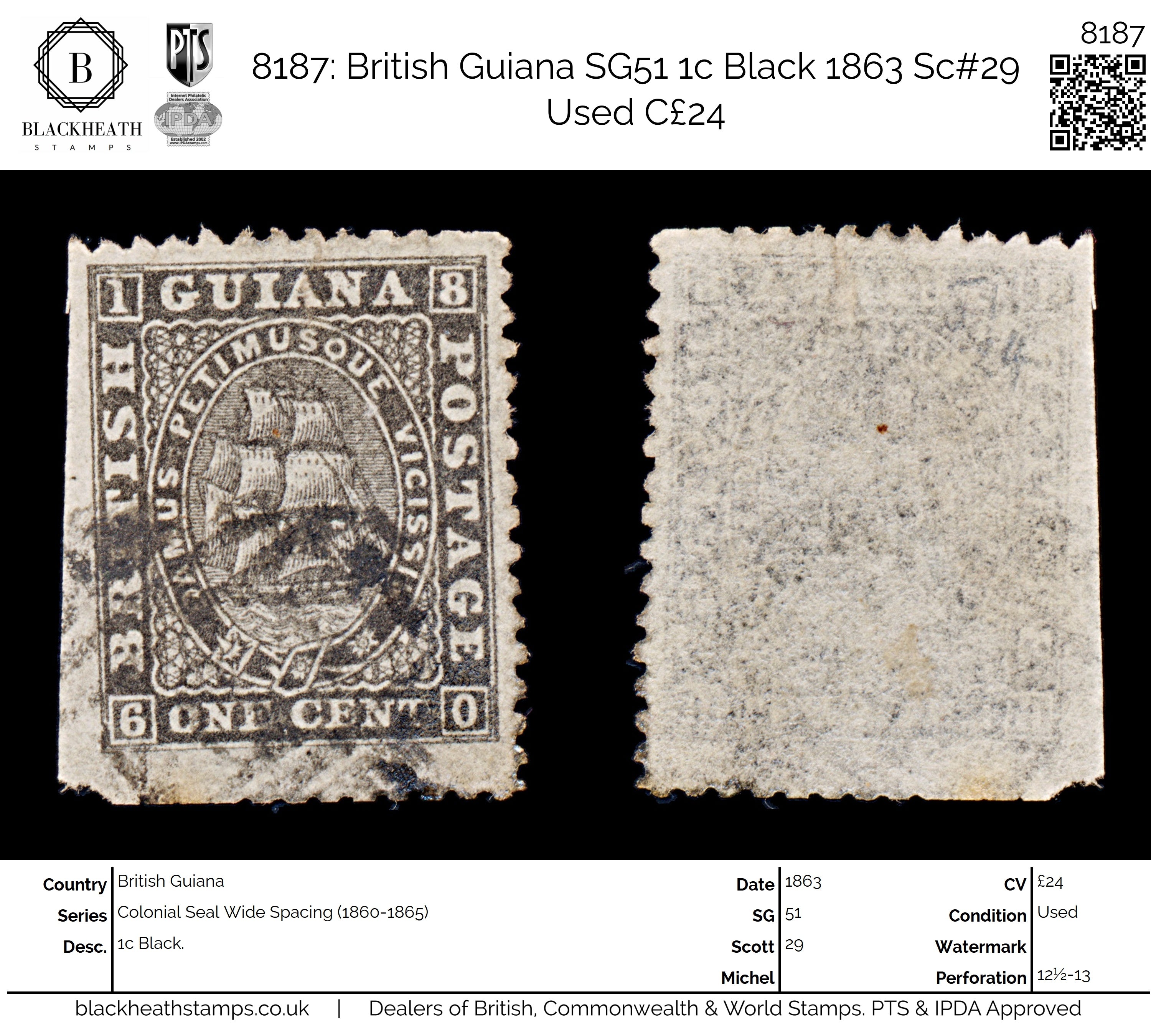 8187: British Guiana SG51 1c Black 1863 Sc#29 Used C£24
