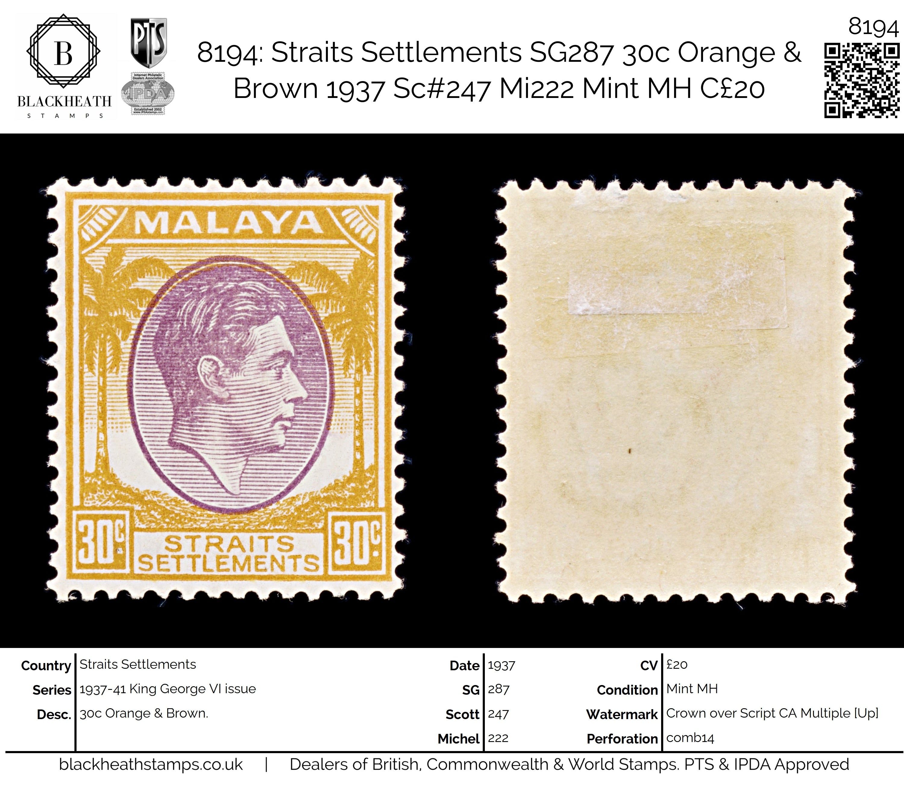 8194: Straits Settlements SG287 30c Orange & Brown 1937 Sc#247 Mi222 Mint MH C£20
