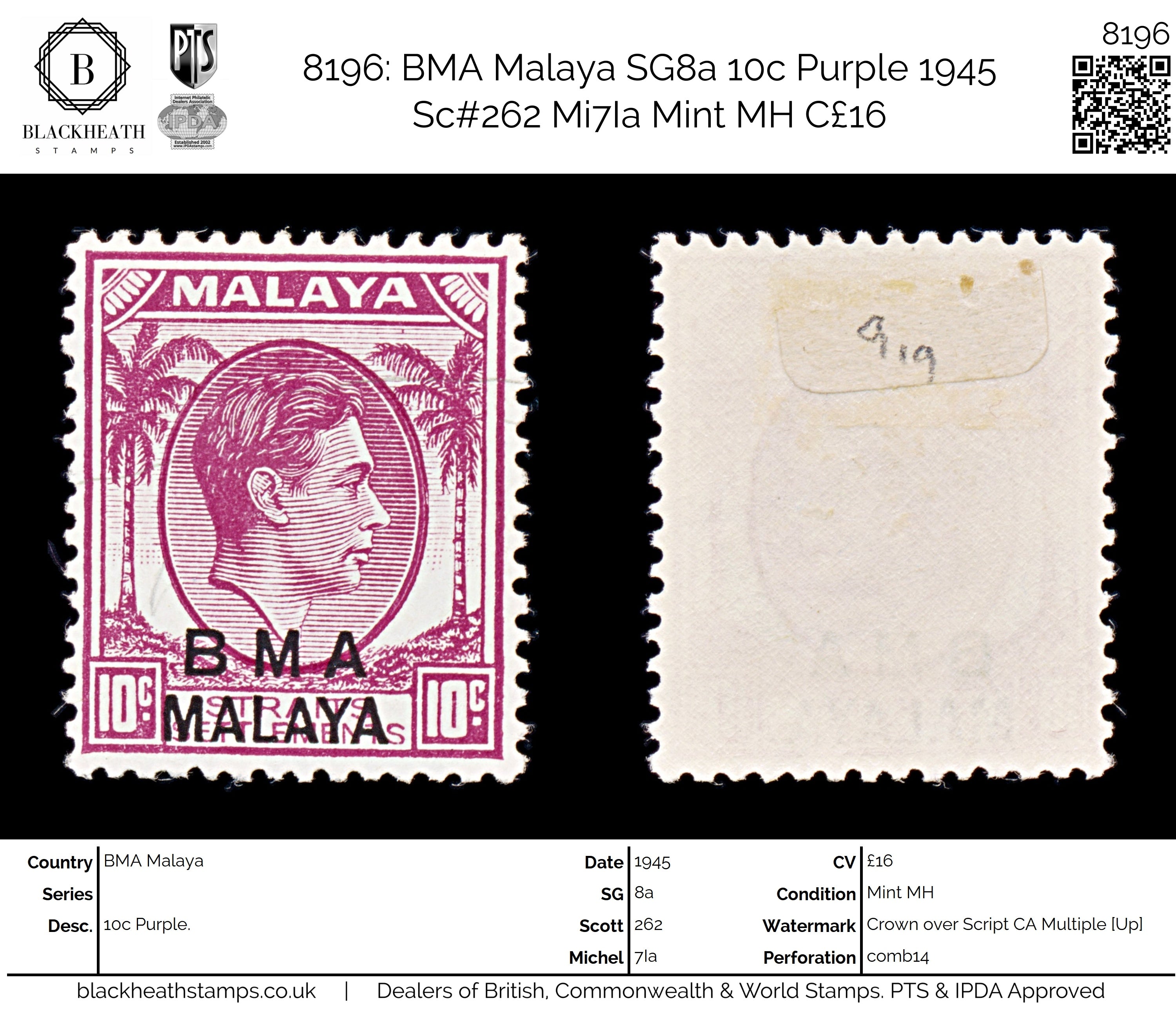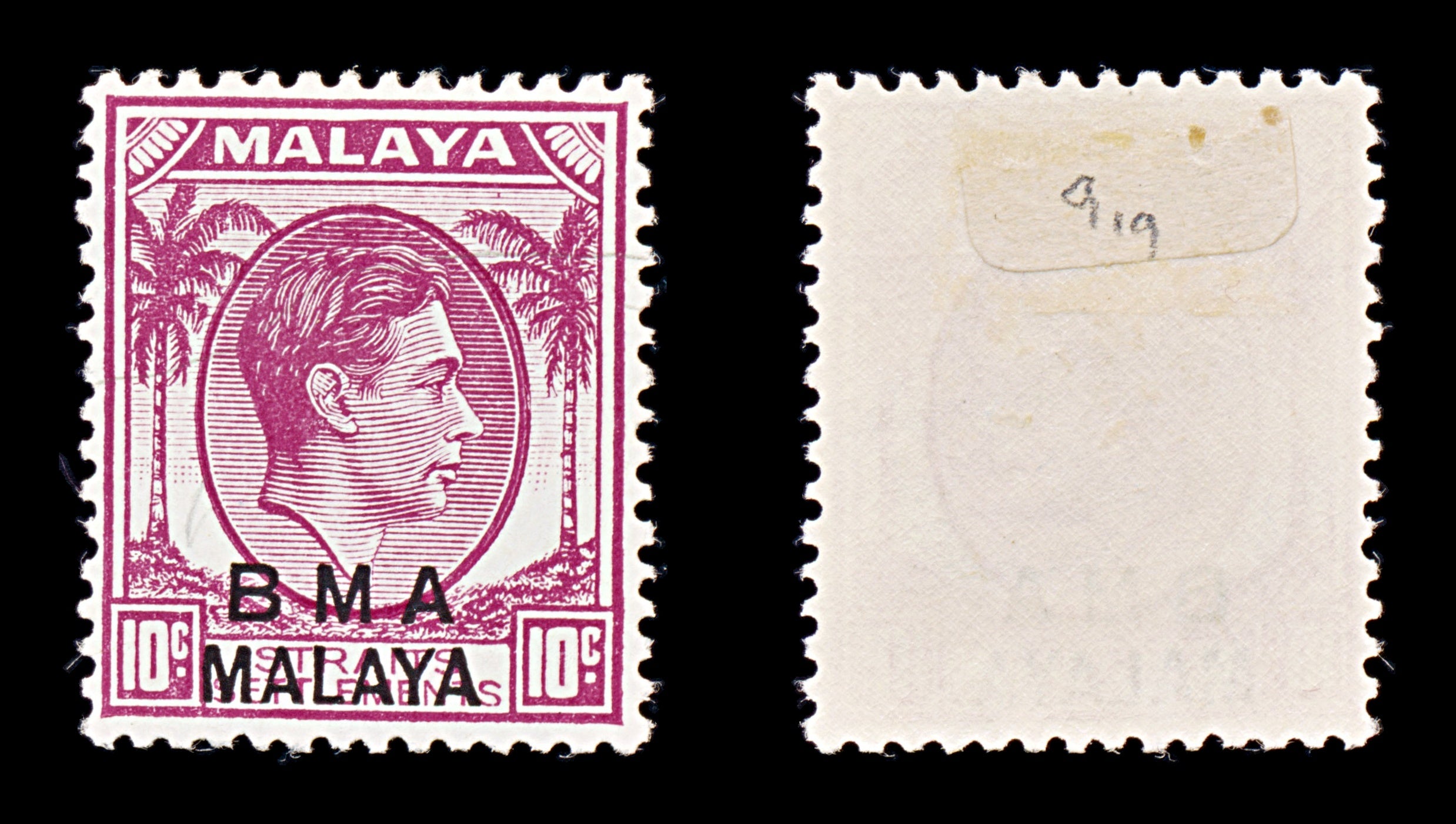 8196: BMA Malaya SG8a 10c Purple 1945 Sc#262 Mi7Ia Mint MH C£16