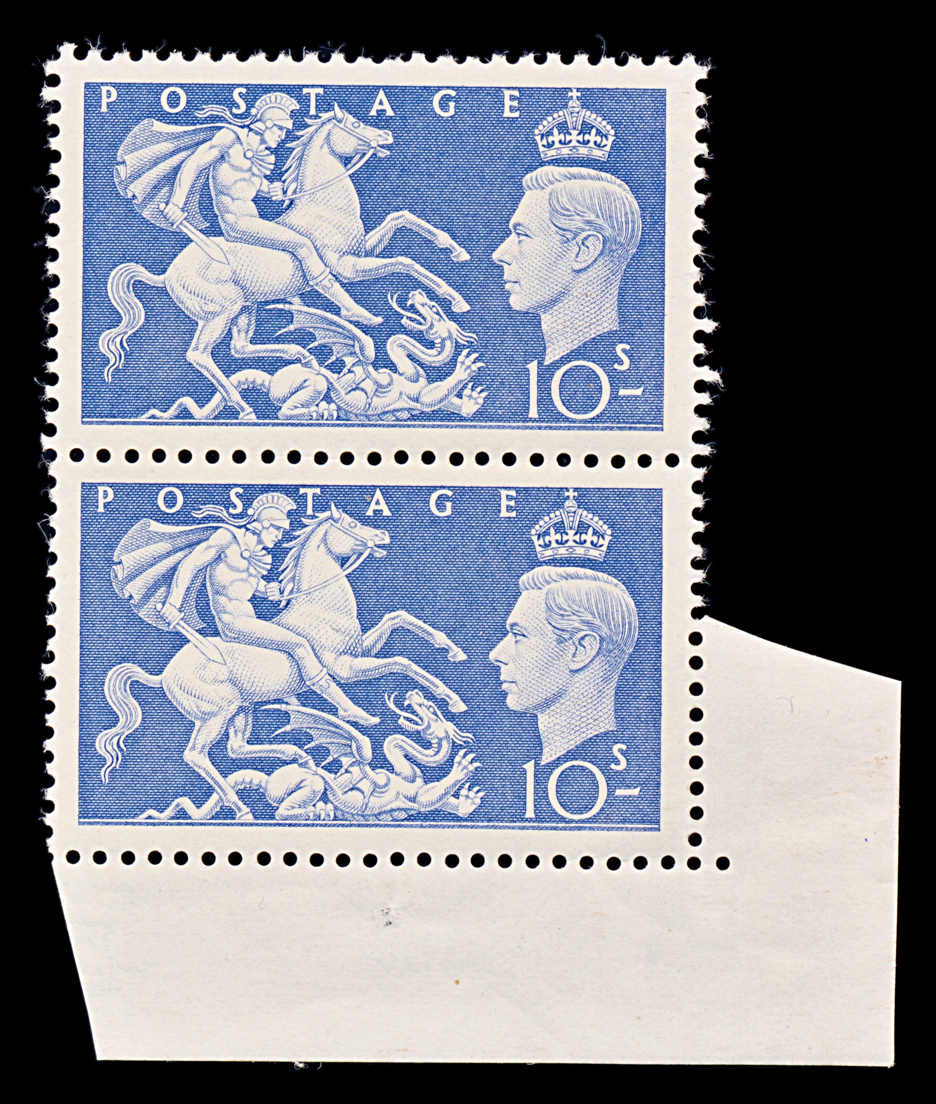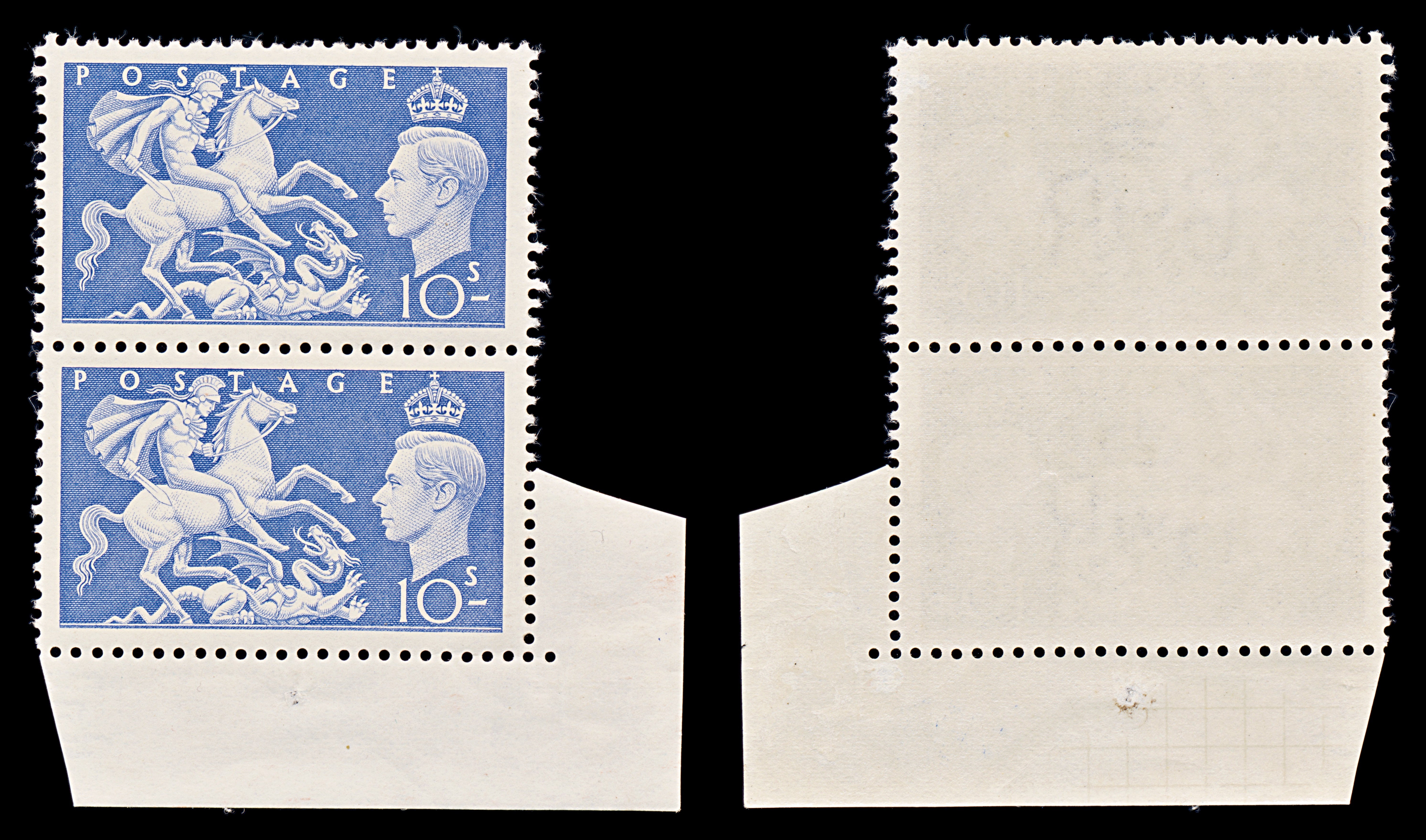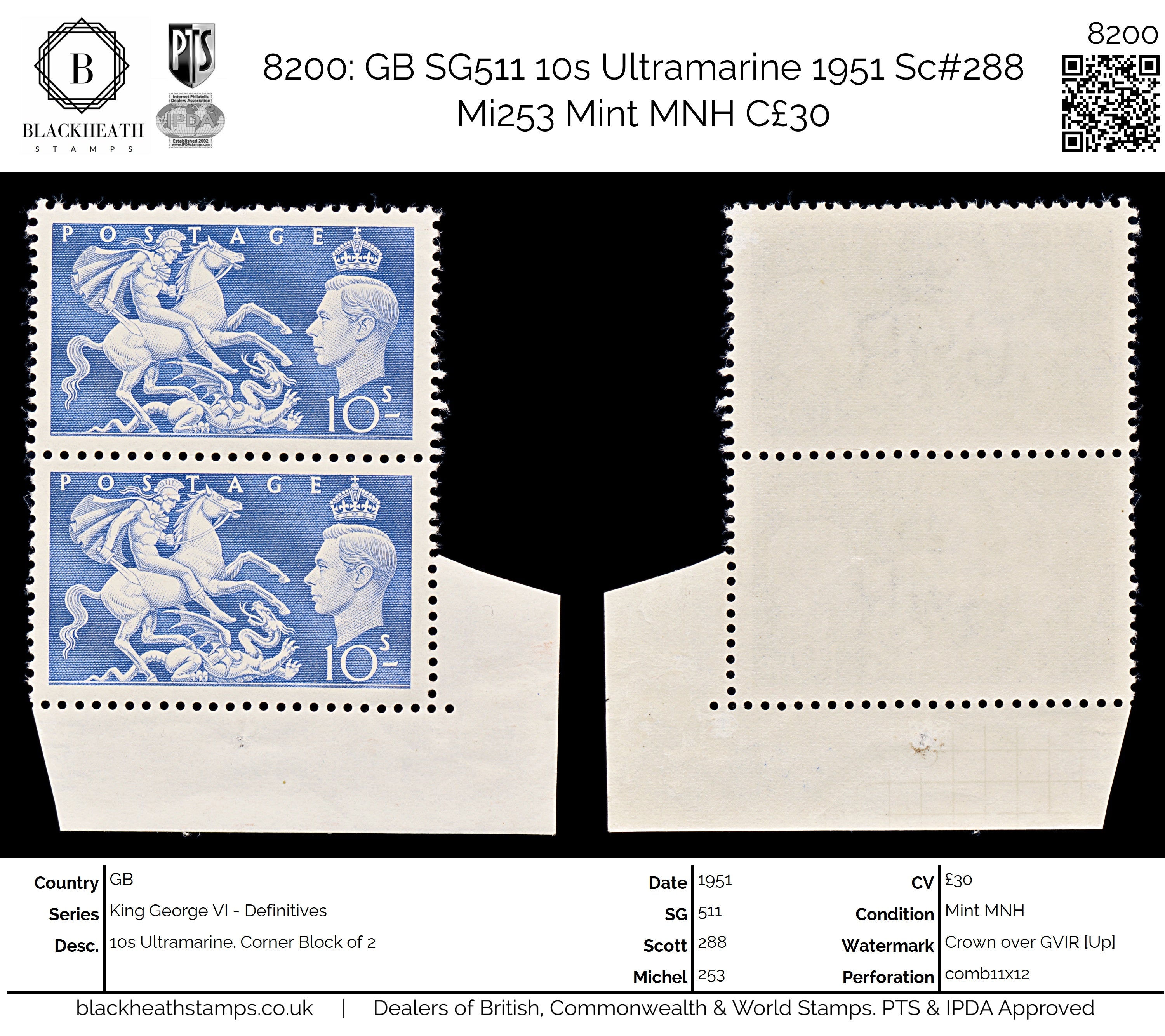 8200: GB SG511 10s Ultramarine 1951 Sc#288 Mi253 Mint MNH C£30: Corner Block of 2