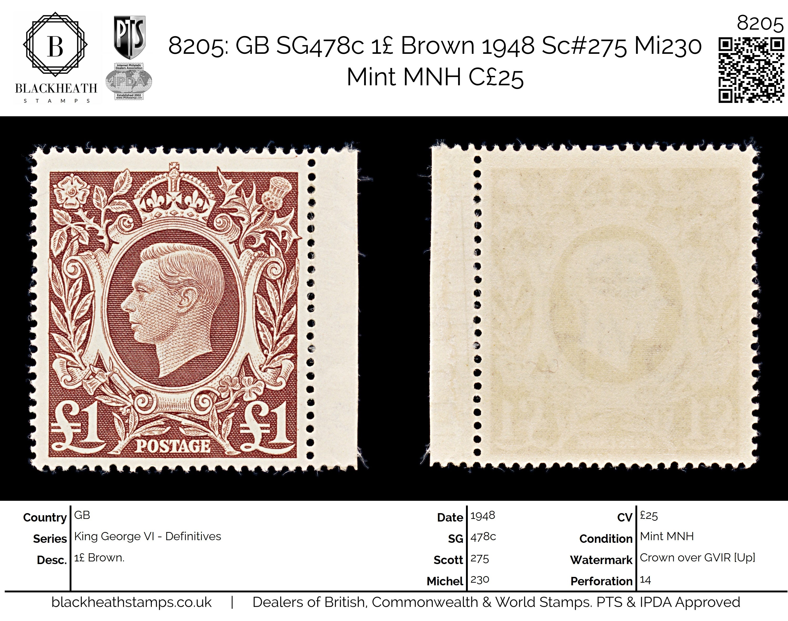 8205: GB SG478c 1£ Brown 1948 Sc#275 Mi230 Mint MNH C£25
