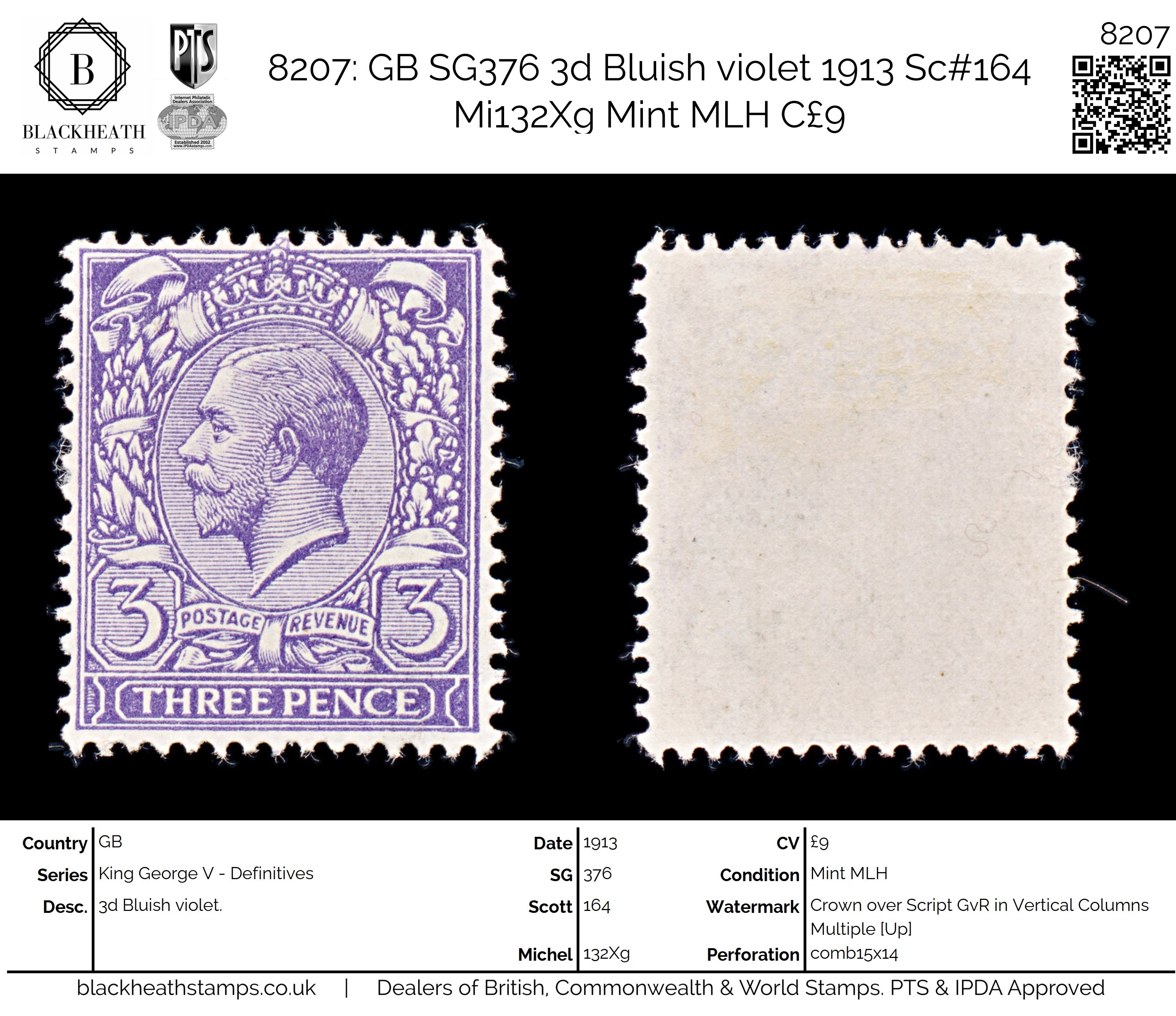 8207: GB SG376 3d Bluish violet 1913 Sc#164 Mi132Xg Mint MLH C£9