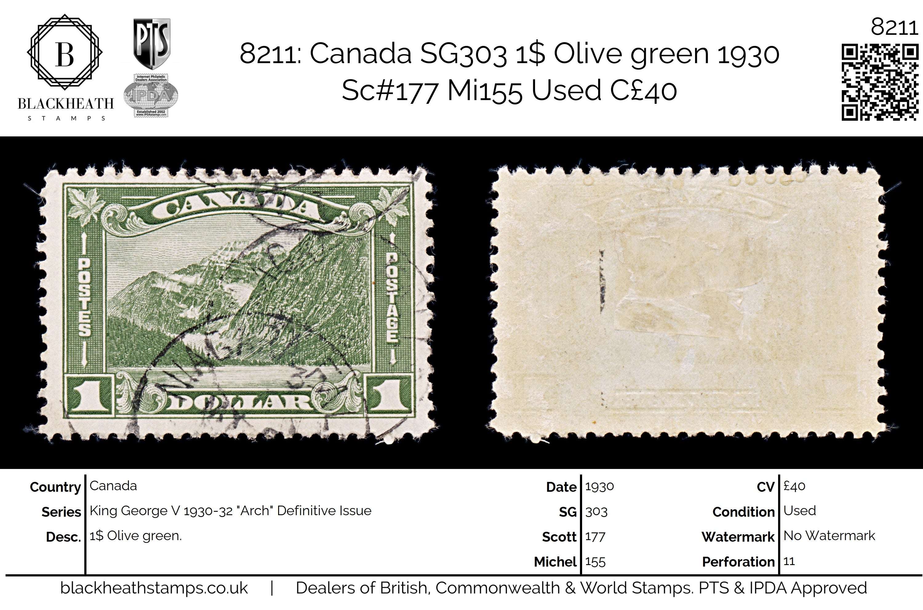 8211: Canada SG303 1$ Olive green 1930 Sc#177 Mi155 Used C£40