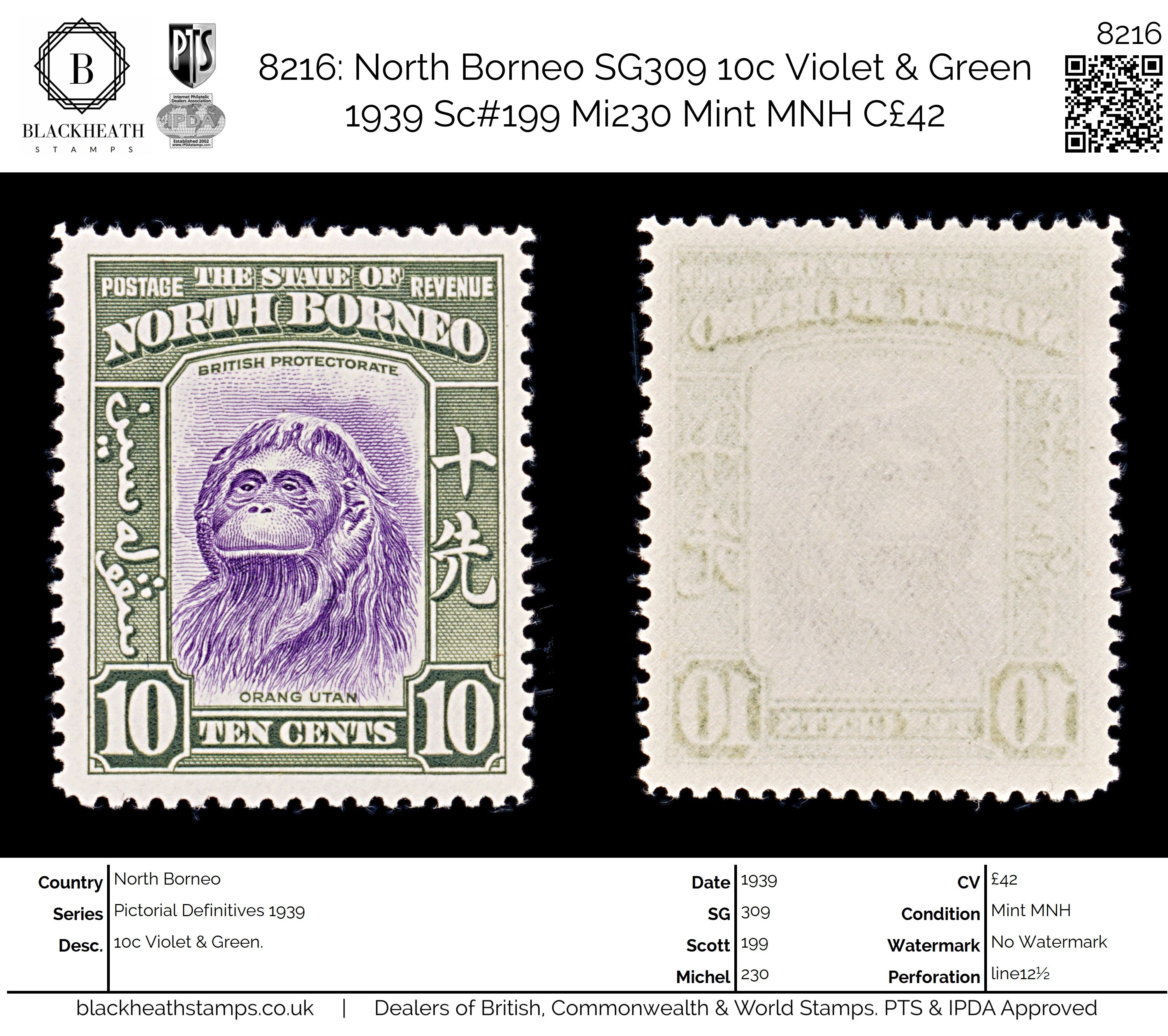 8216: North Borneo SG309 10c Violet & Green 1939 Sc#199 Mi230 Mint MNH C£42