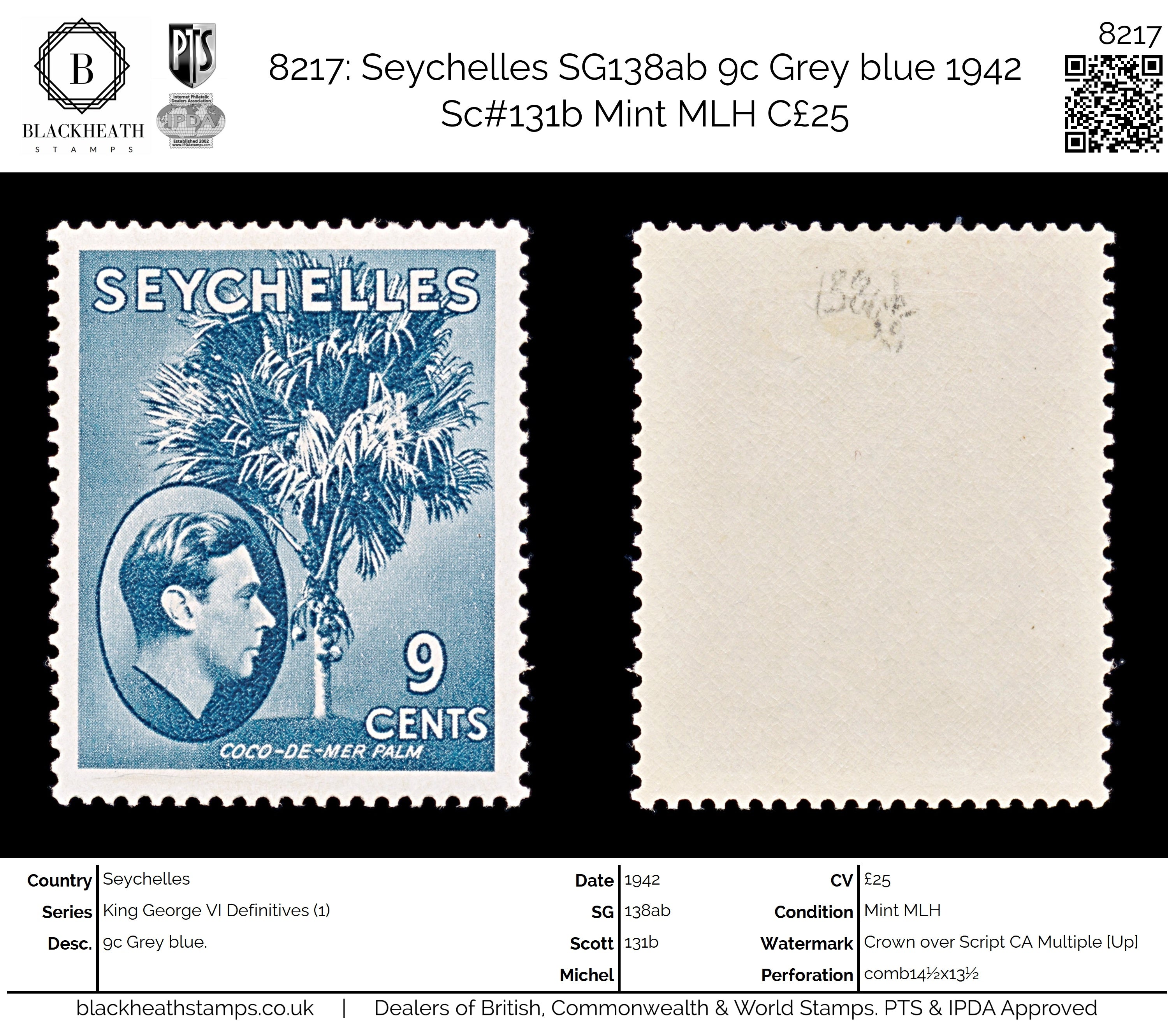 8217: Seychelles SG138ab 9c Grey blue 1942 Sc#131b Mint MLH C£25