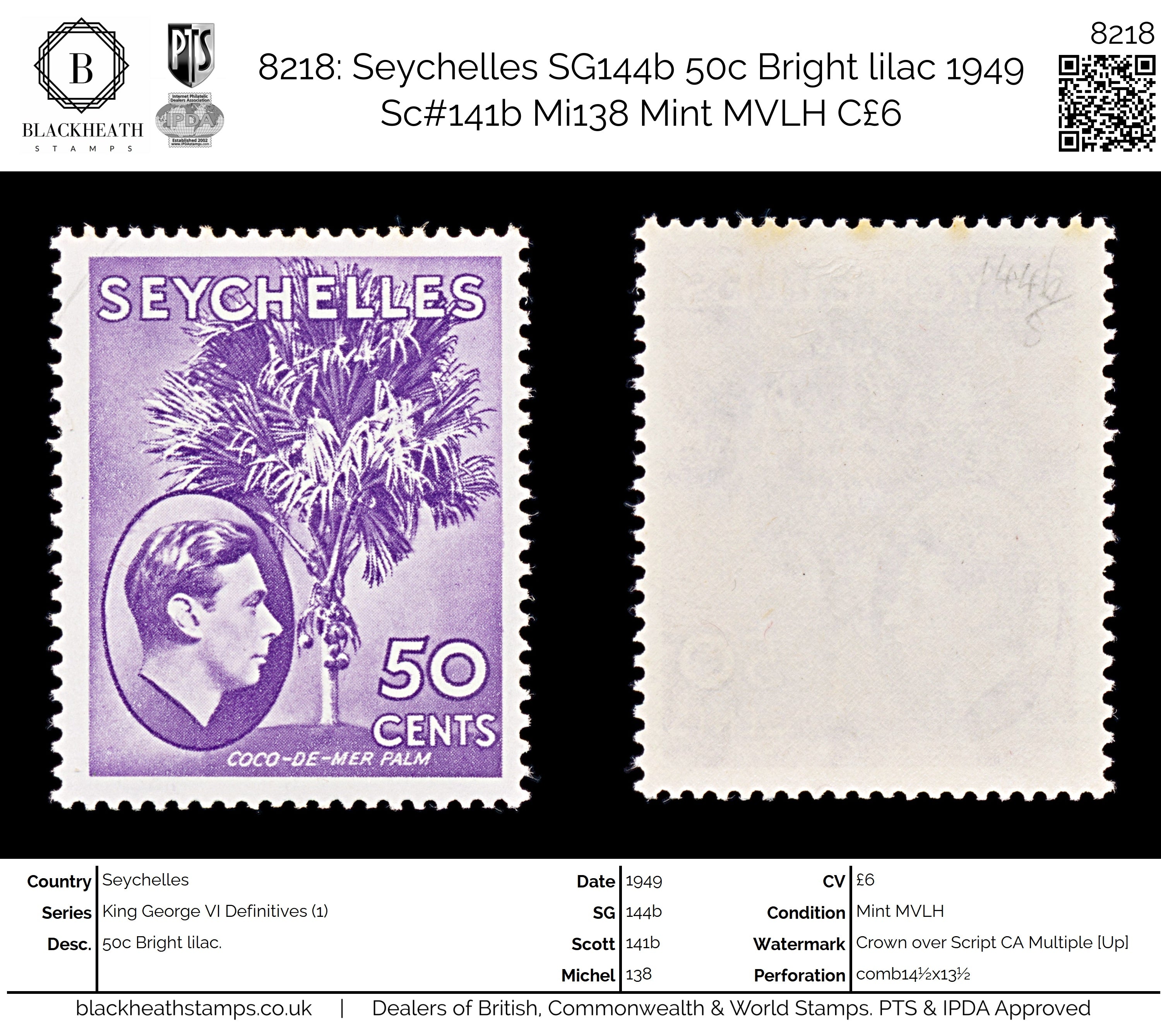 8218: Seychelles SG144b 50c Bright lilac 1949 Sc#141b Mi138 Mint MVLH C£6