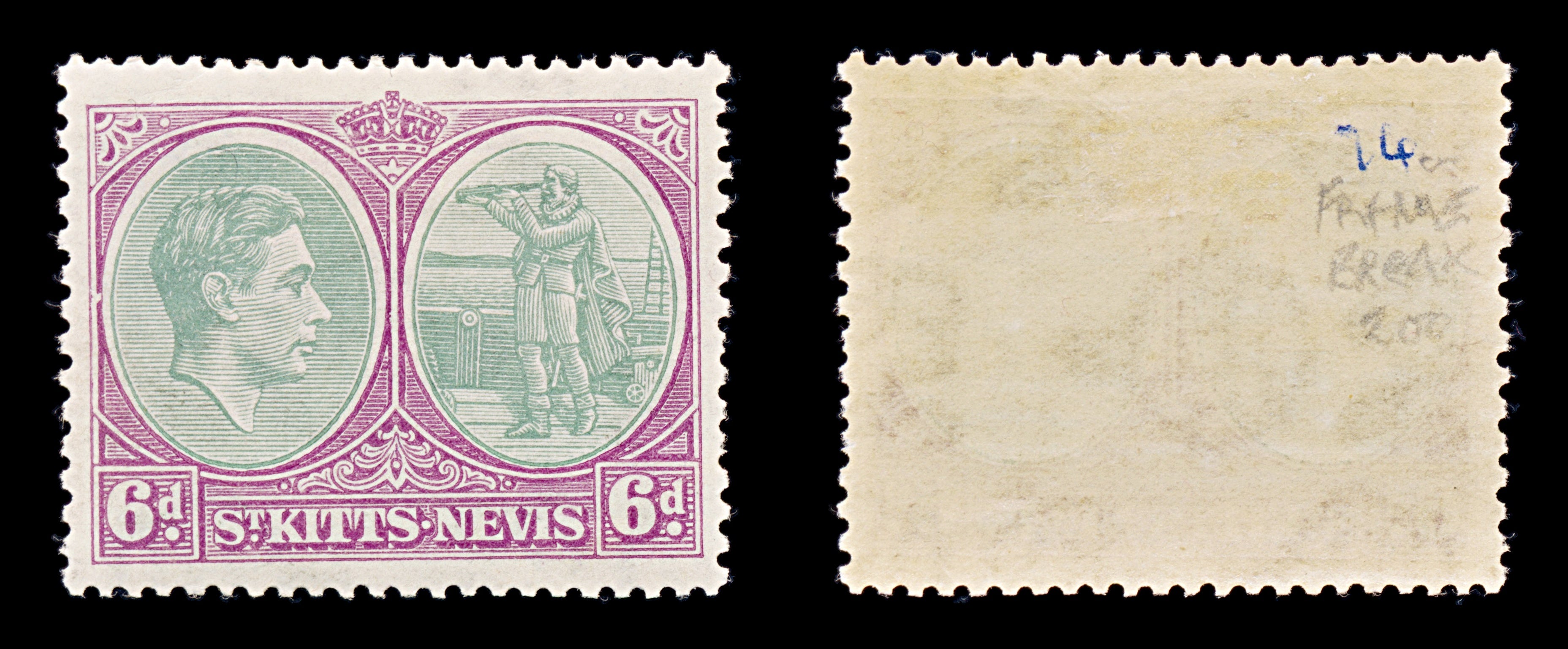 8222: St Kitts Nevis SG74 6d Purple & Ggreen 1938 Sc#85a Mi78Ca Mint MLH C£200: Frame Break on left side