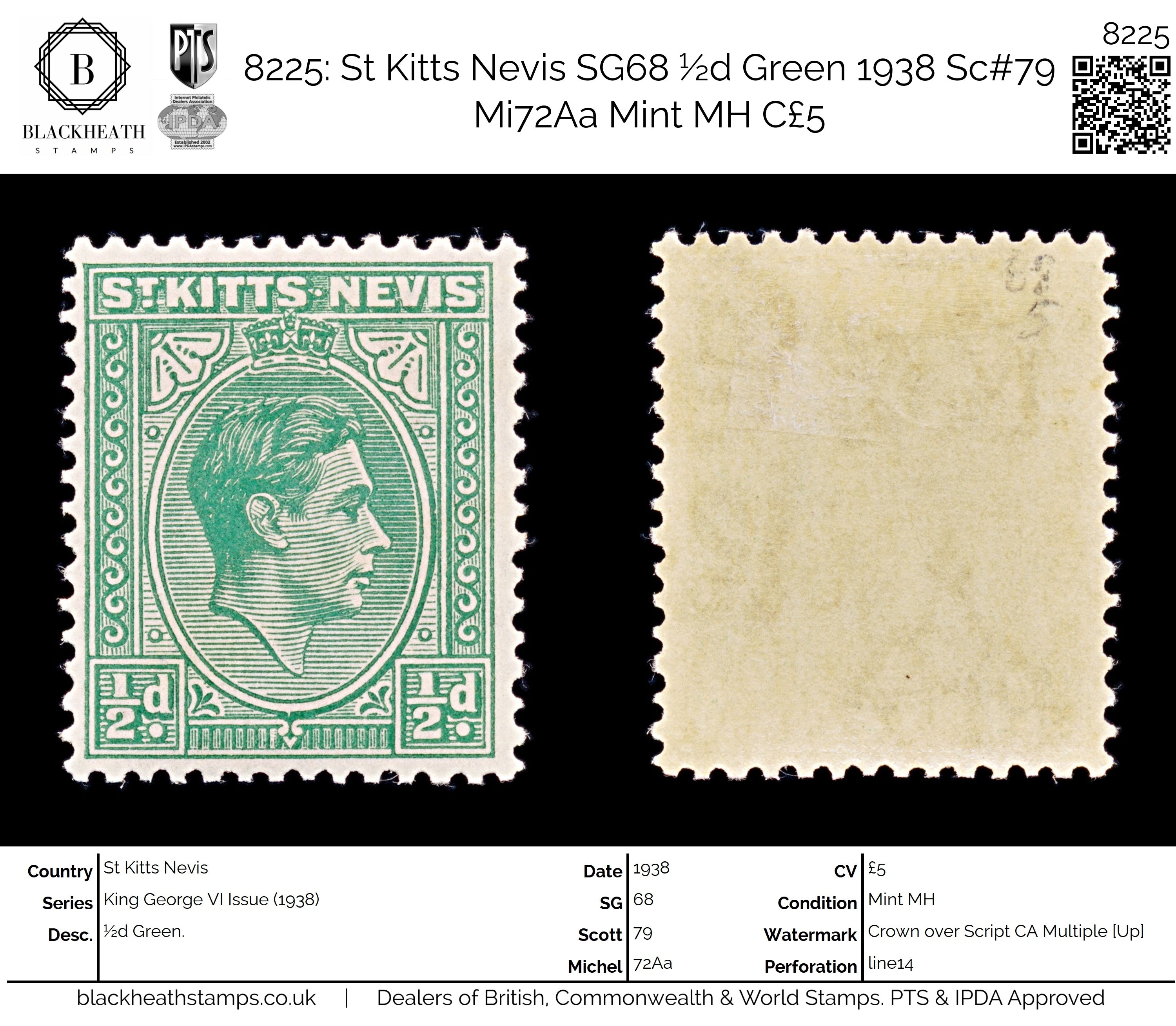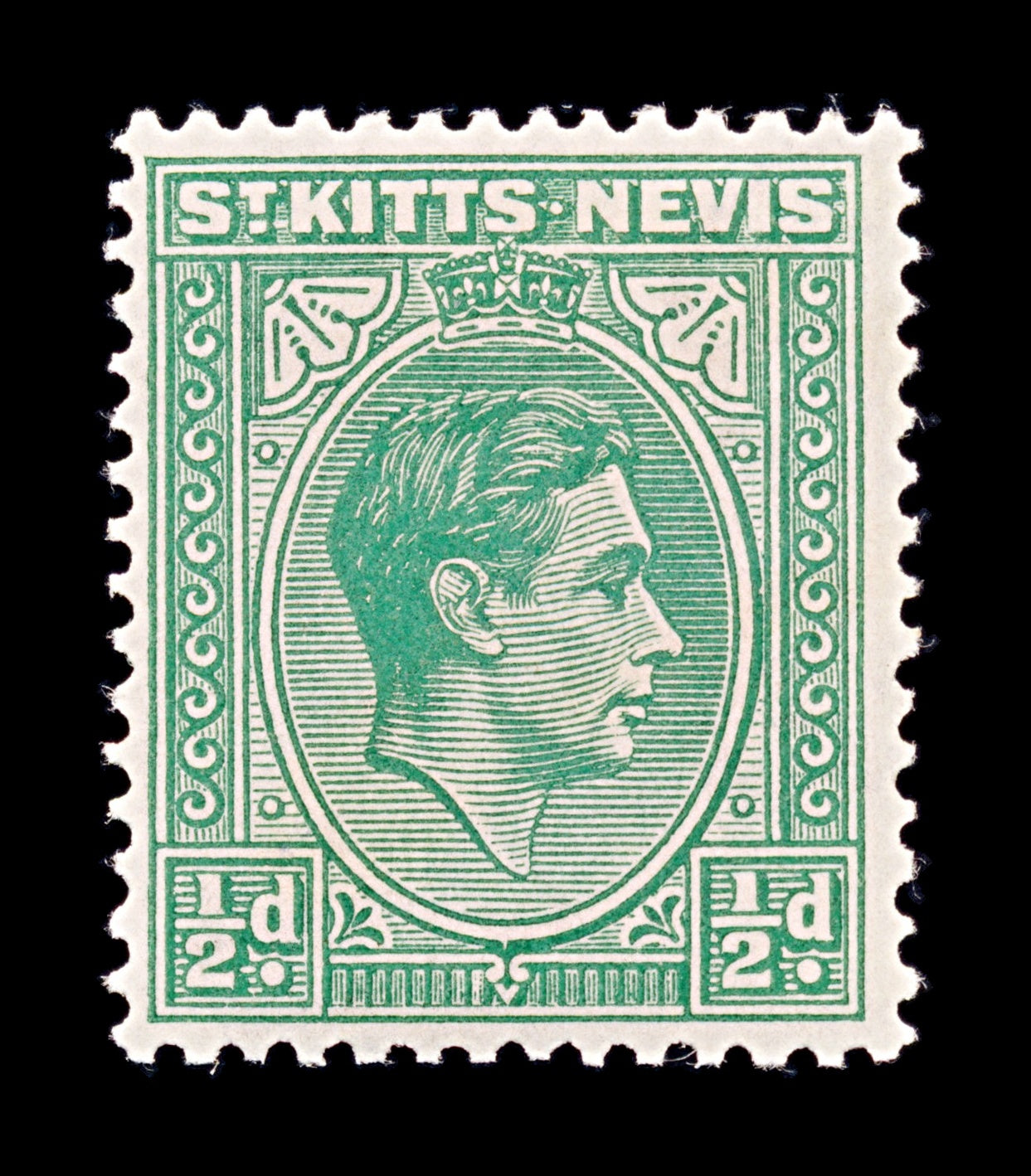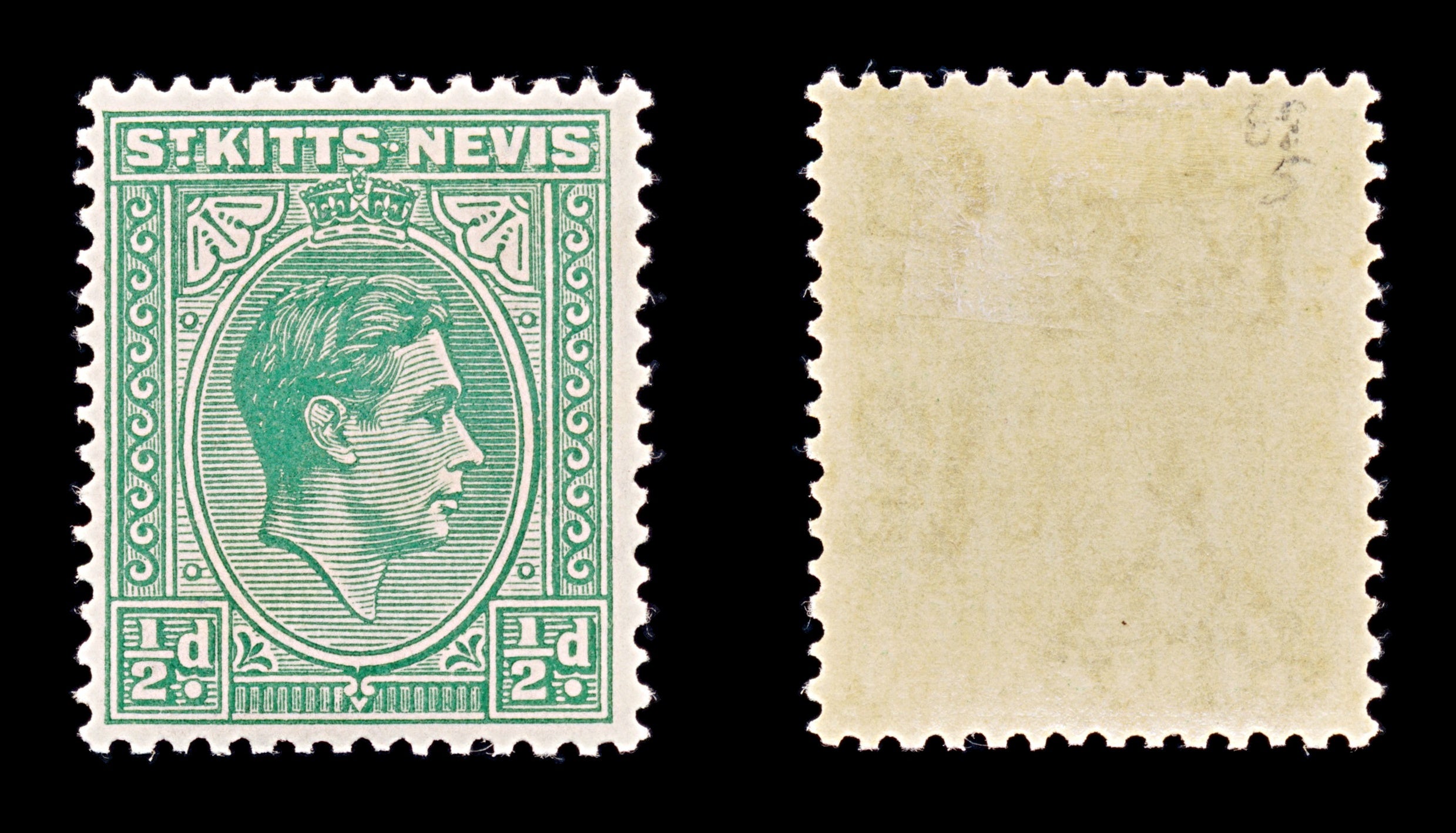 8225: St Kitts Nevis SG68 ½d Green 1938 Sc#79 Mi72Aa Mint MH C£5