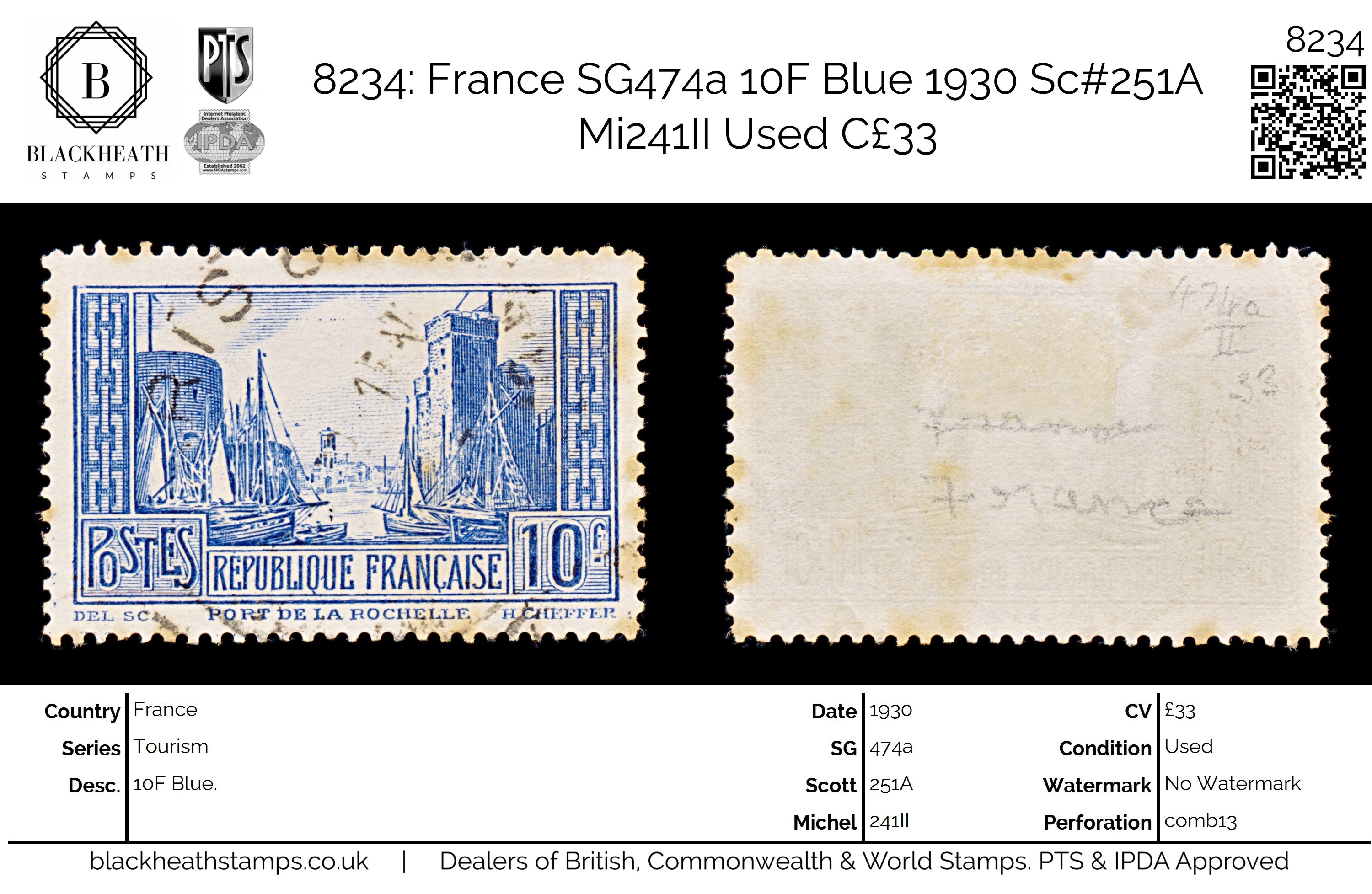 8234: France SG474a 10F Blue 1930 Sc#251A Mi241II Uséd C£33