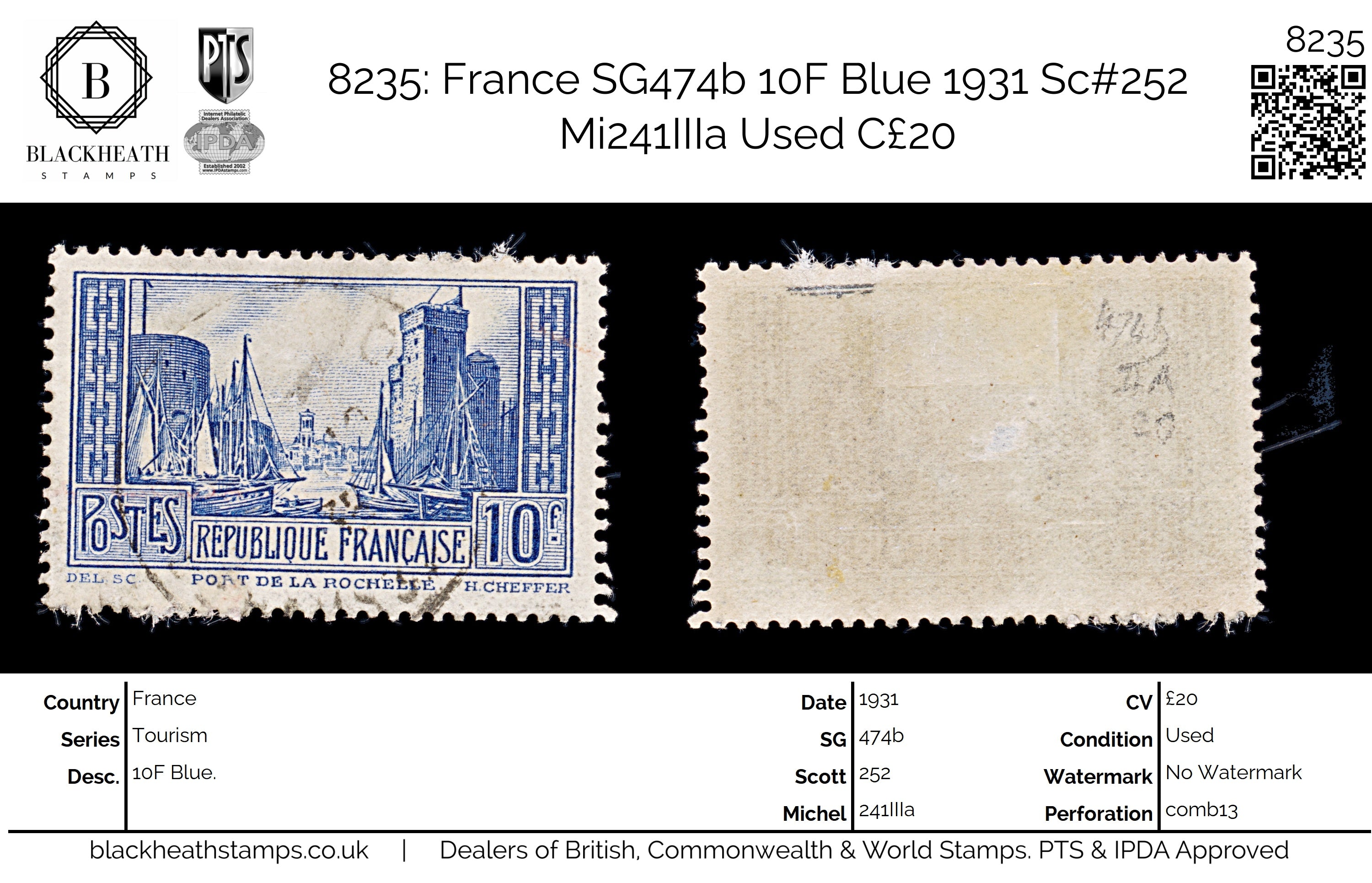 8235: France SG474b 10F Blue 1931 Sc#252 Mi241IIIa Uséd C£20