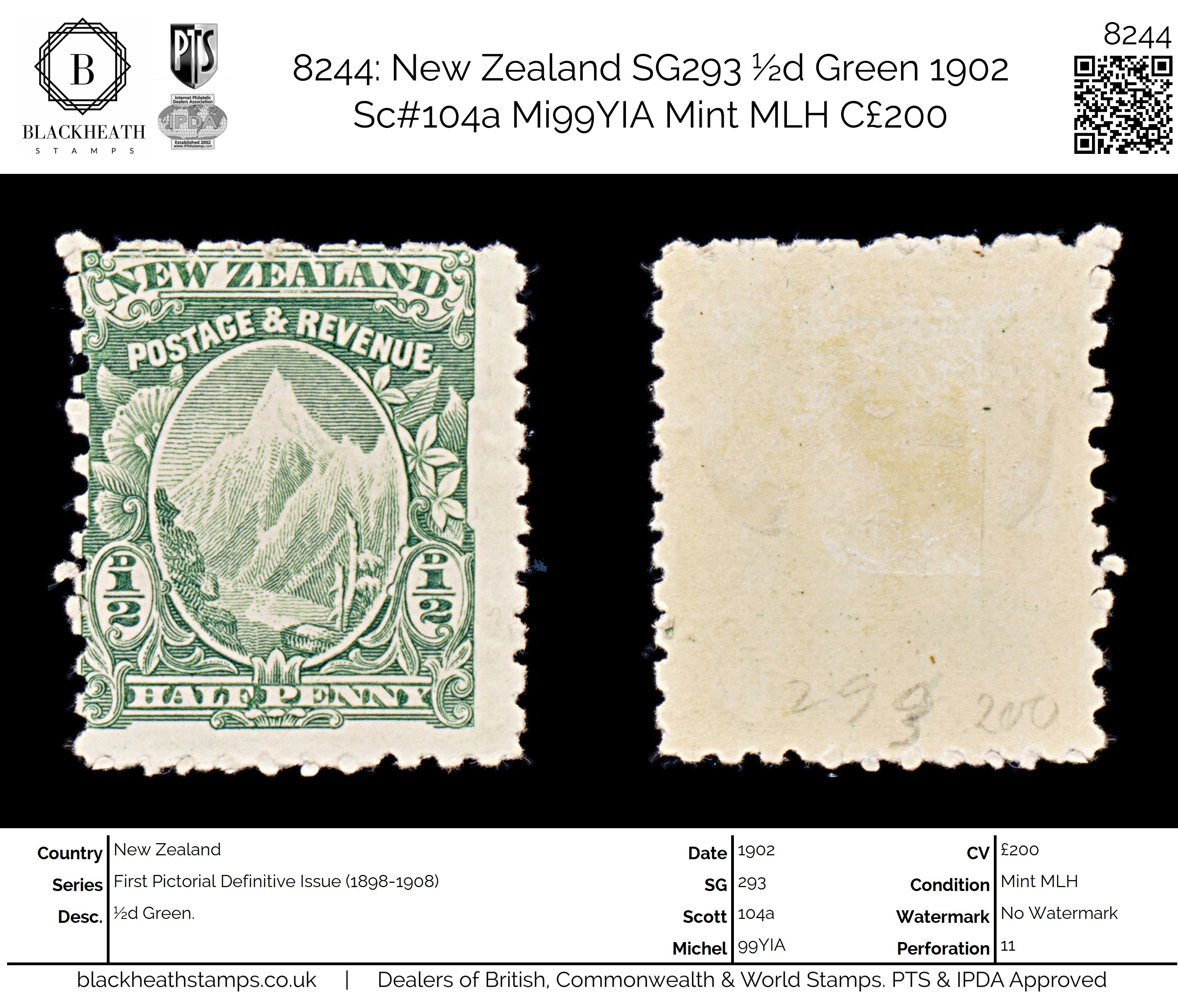 8244: New Zealand SG293 ½d Green 1902 Sc#104a Mi99YIA Mint MLH C£200