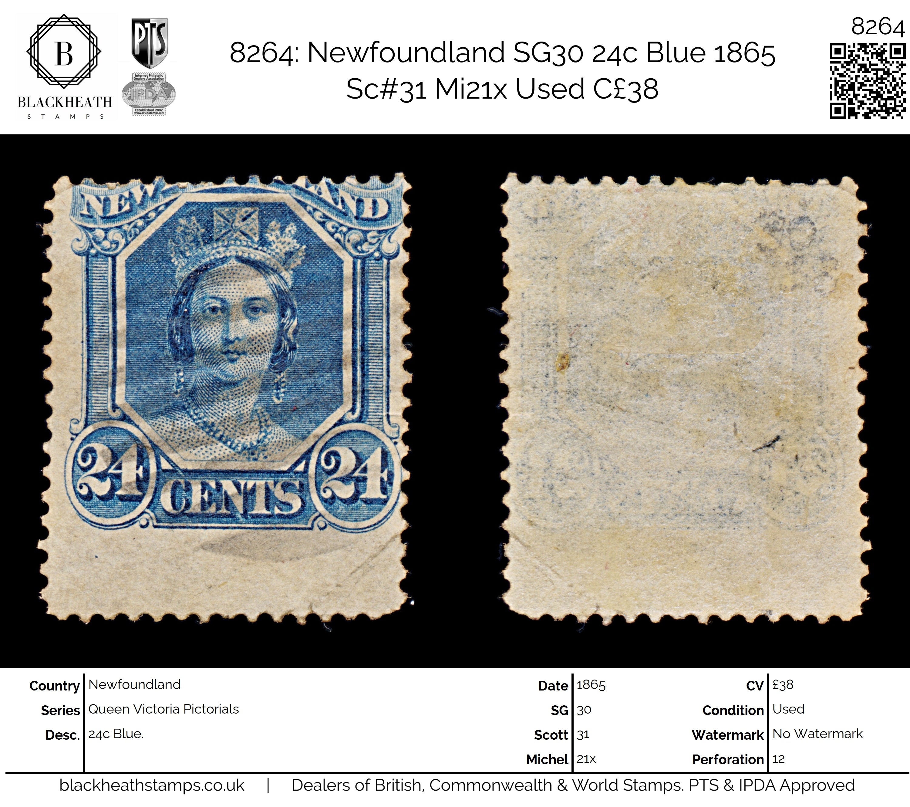 8264: Newfoundland SG30 24c Blue 1865 Sc#31 Mi21x Uséd C£38