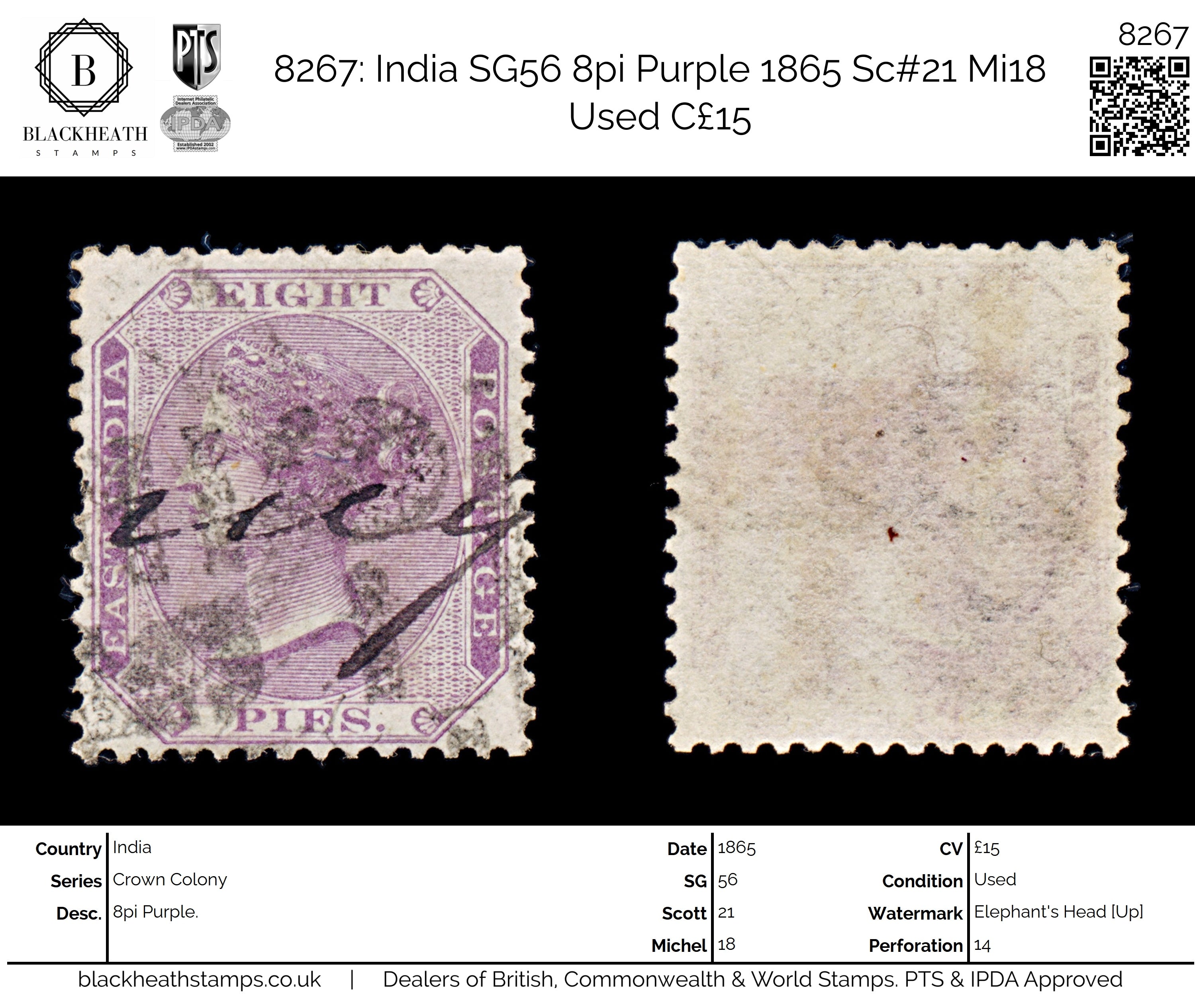 8267: India SG56 8pi Purple 1865 Sc#21 Mi18 Uséd C£15