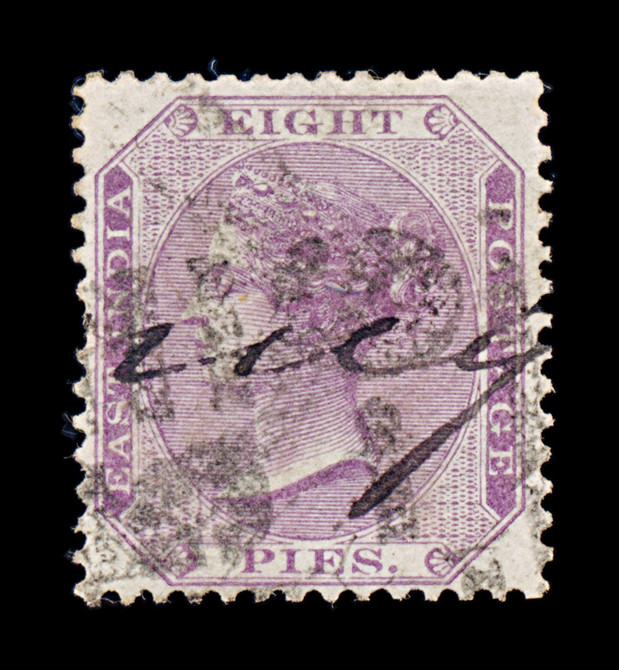 8267: India SG56 8pi Purple 1865 Sc#21 Mi18 Used C£15
