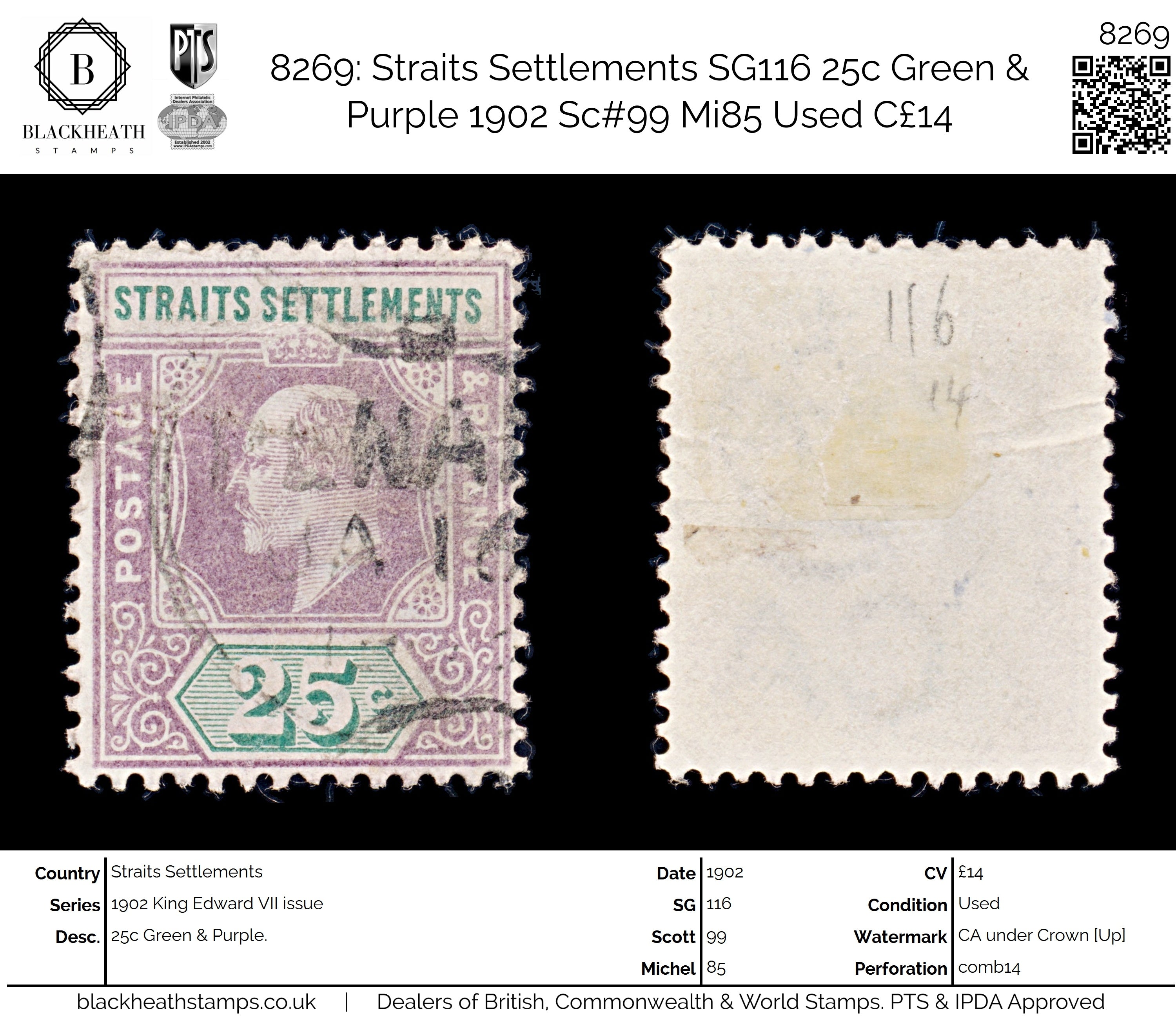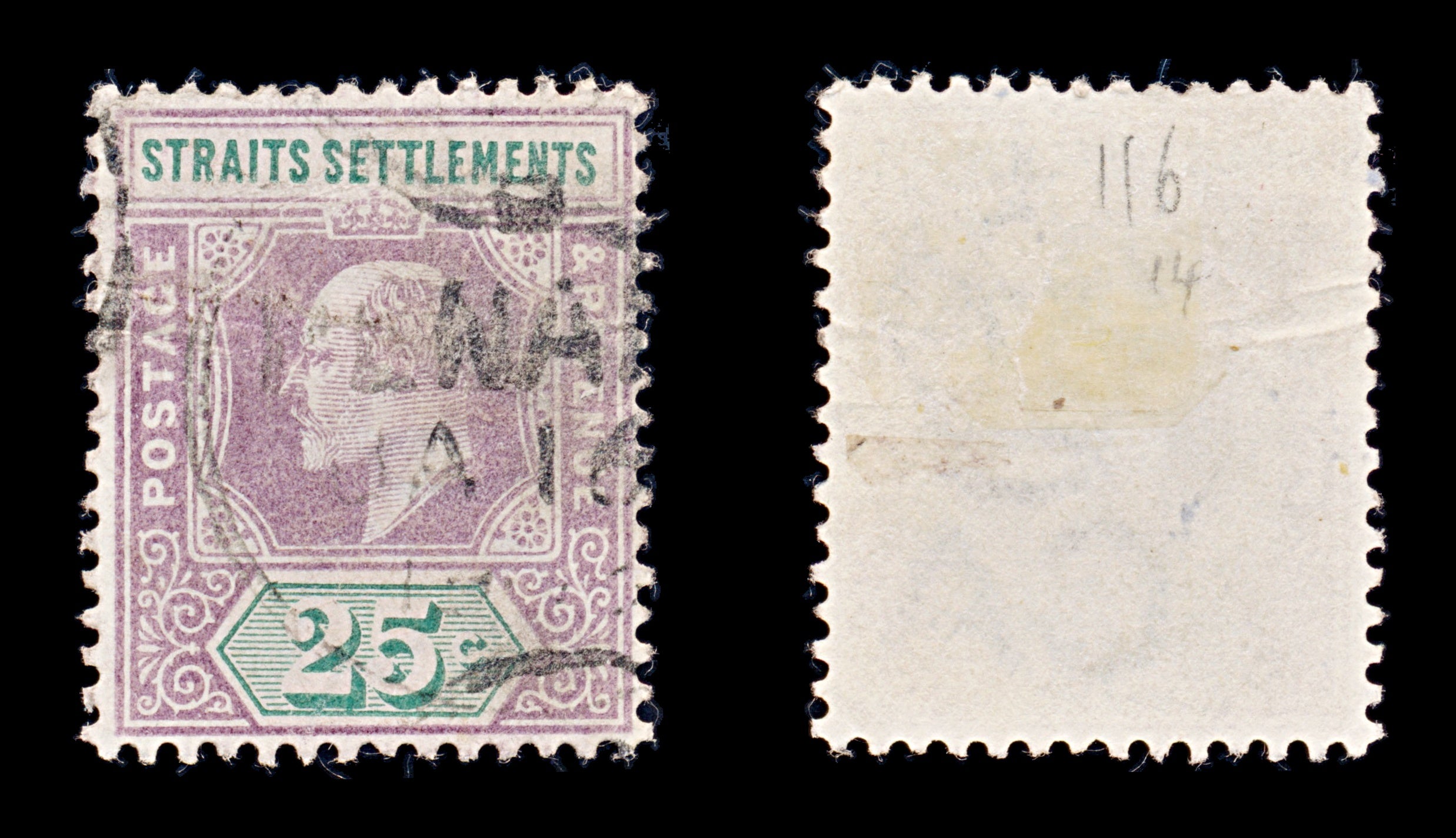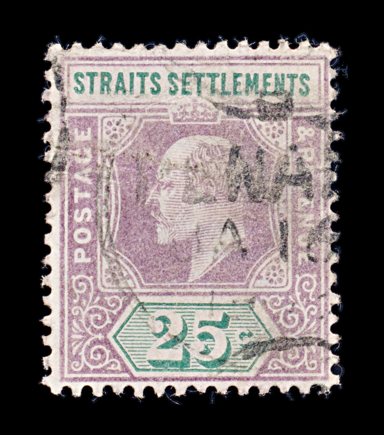 8269: Straits Settlements SG116 25c Green & Purple 1902 Sc#99 Mi85 Uséd C£14