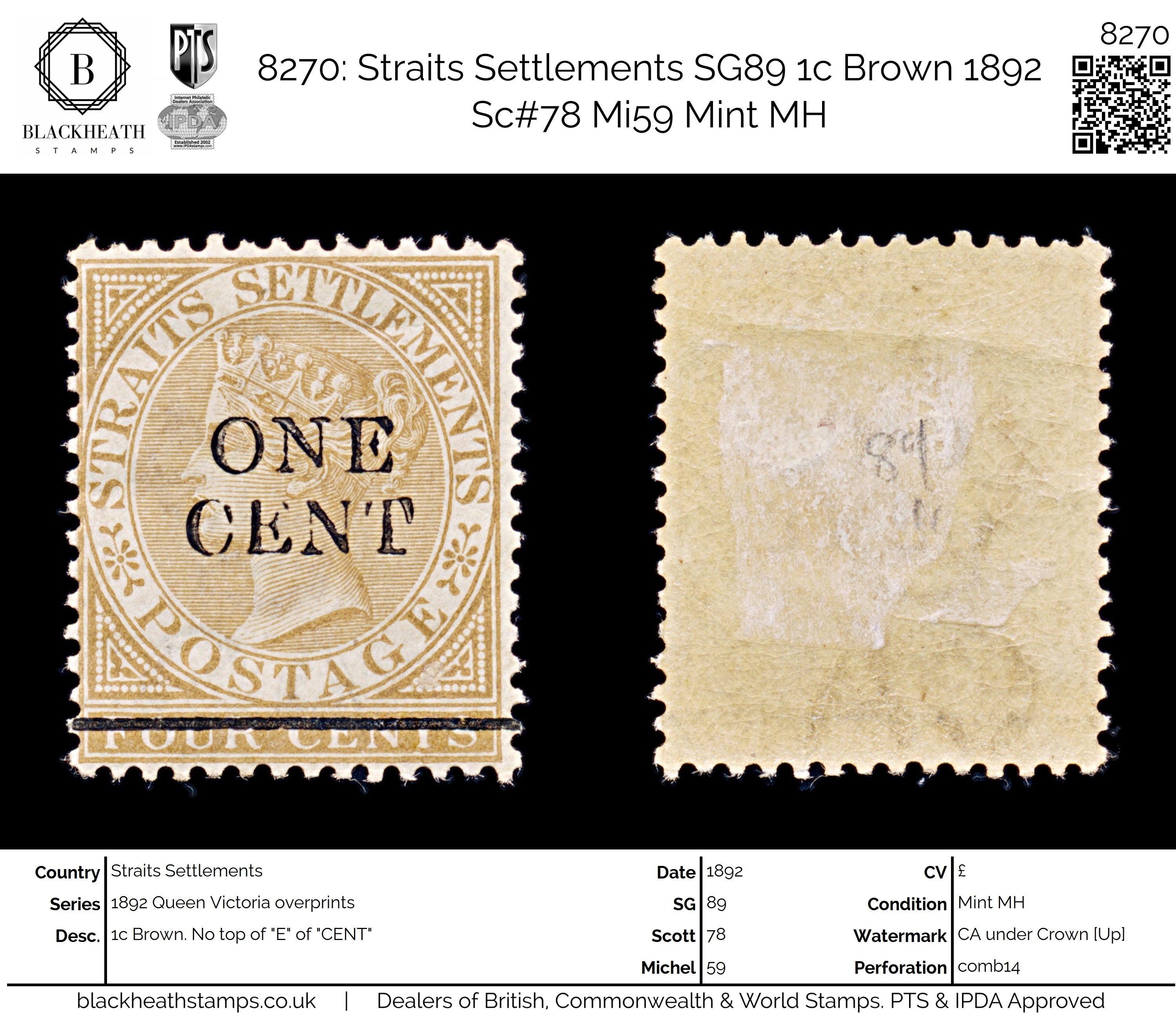 8270: Straits Settlements SG89 1c Brown 1892 Sc#78 Mi59 Mint MH: No top of "E" of "CENT"