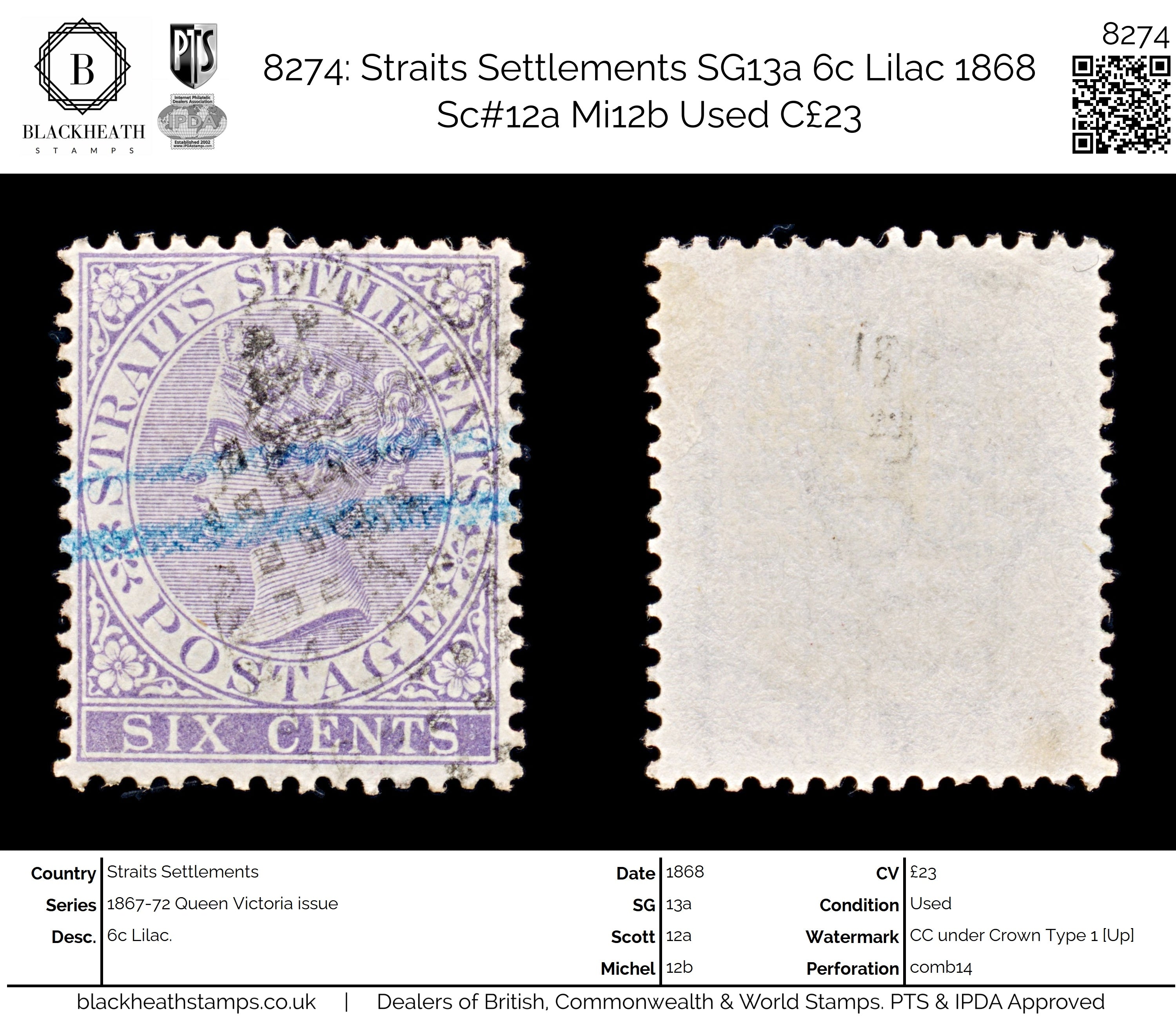 8274: Straits Settlements SG13a 6c Lilac 1868 Sc#12a Mi12b Uséd C£23