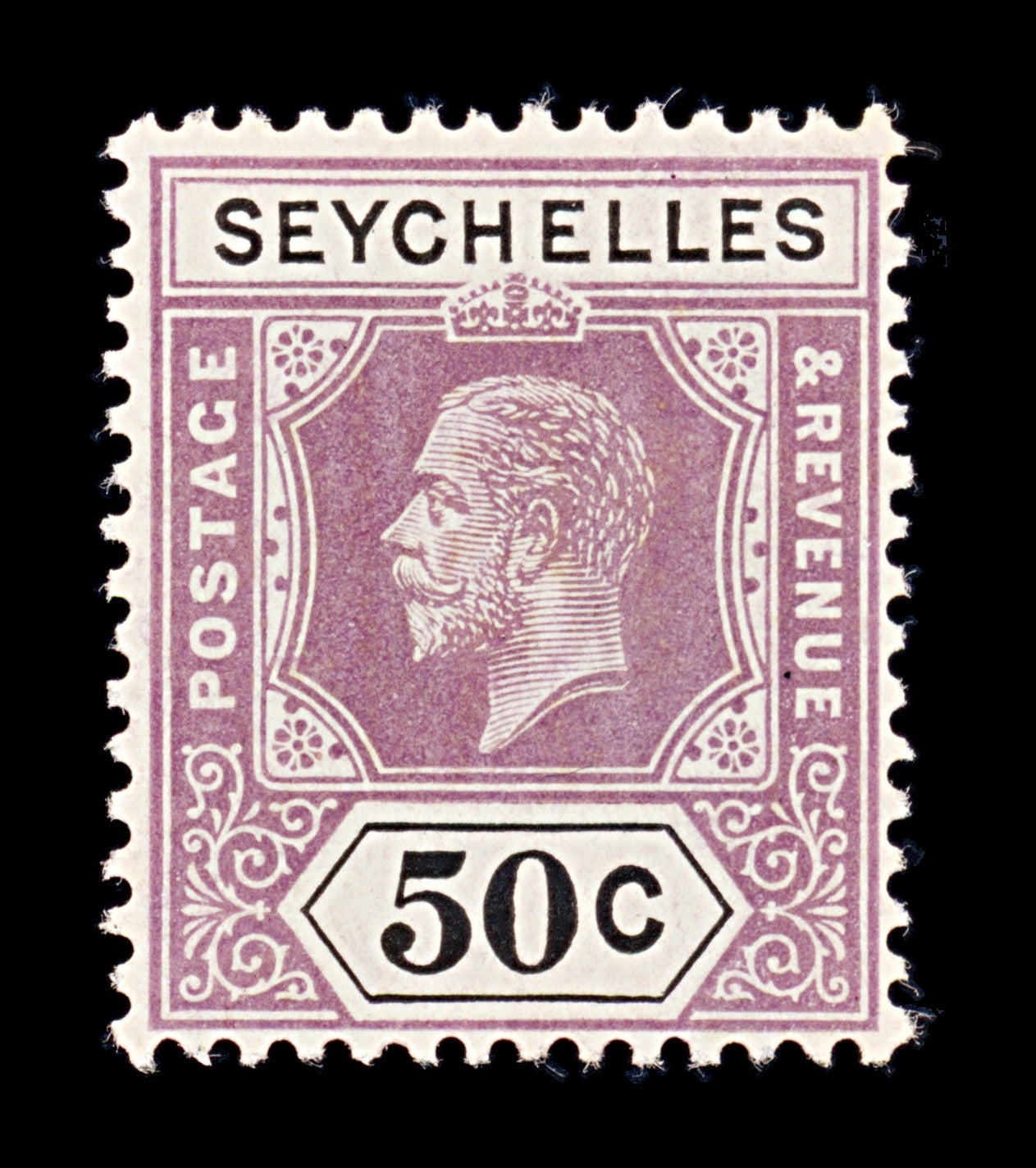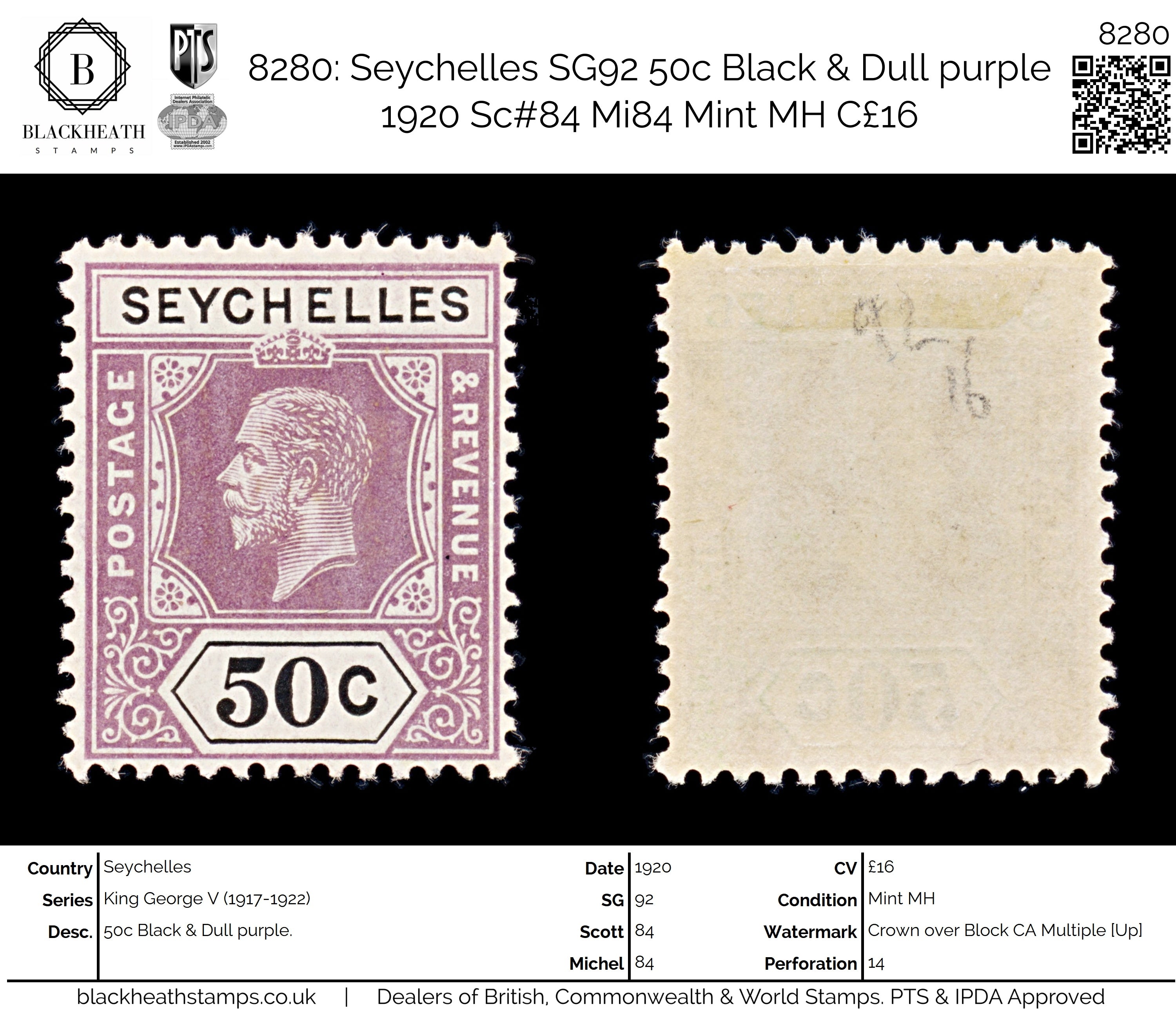 8280: Seychelles SG92 50c Black & Dull purple 1920 Sc#84 Mi84 Mint MH C£16