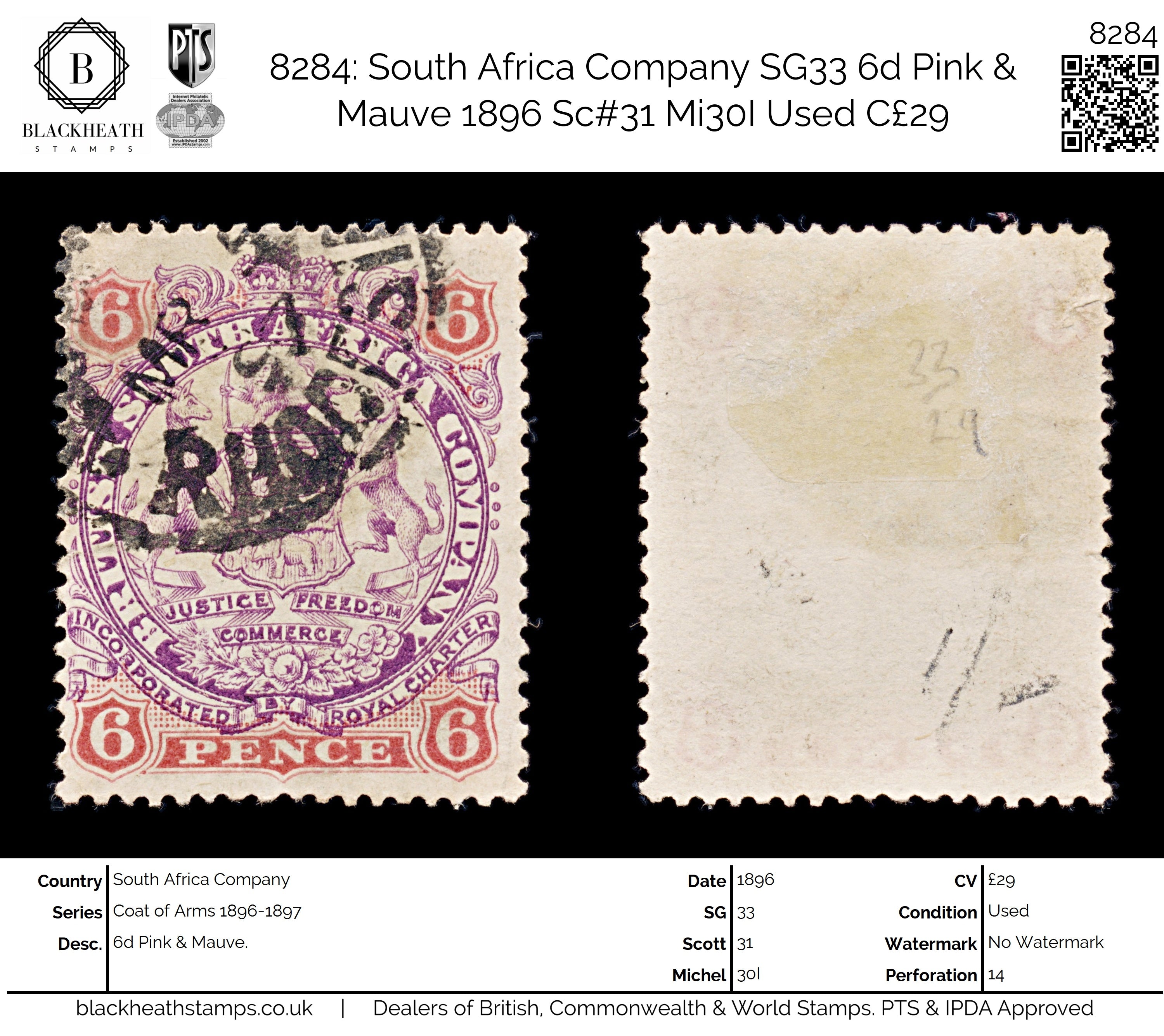 8284: South Africa Company SG33 6d Pink & Mauve 1896 Sc#31 Mi30I Uséd C£29