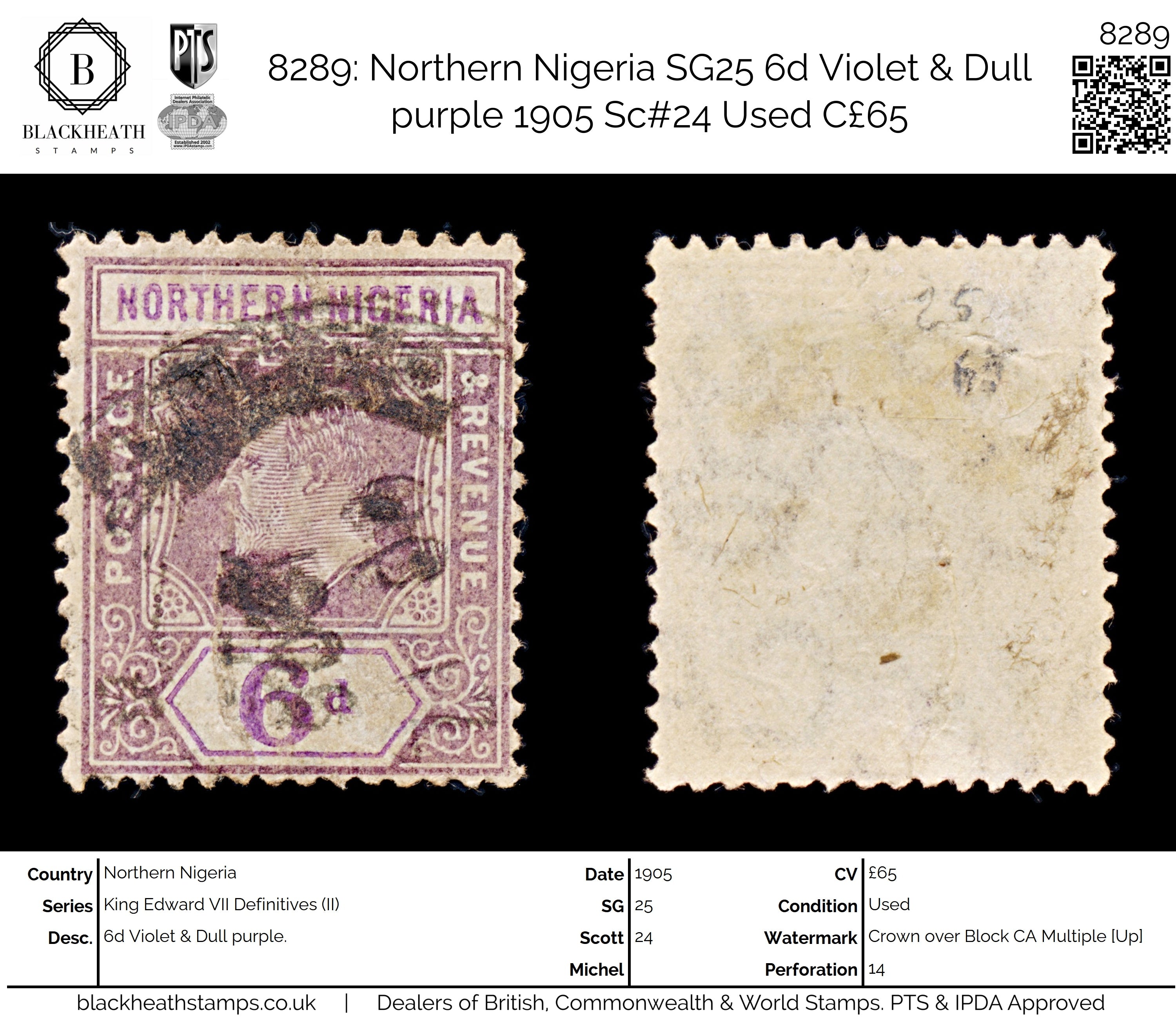 8289: Northern Nigeria SG25 6d Violet & Dull purple 1905 Sc#24 Uséd C£65