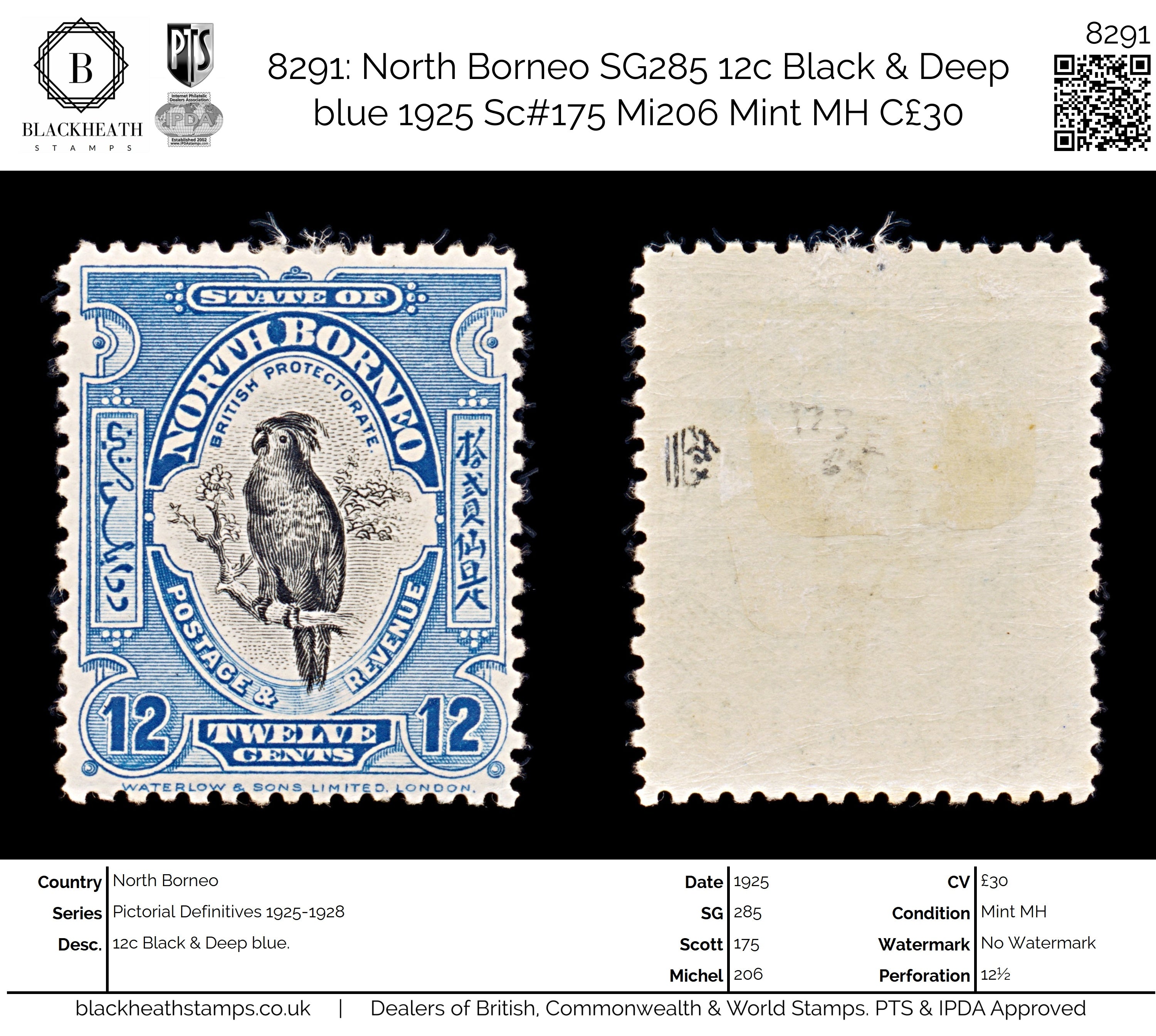 8291: North Borneo SG285 12c Black & Deep blue 1925 Sc#175 Mi206 Mint MH C£30