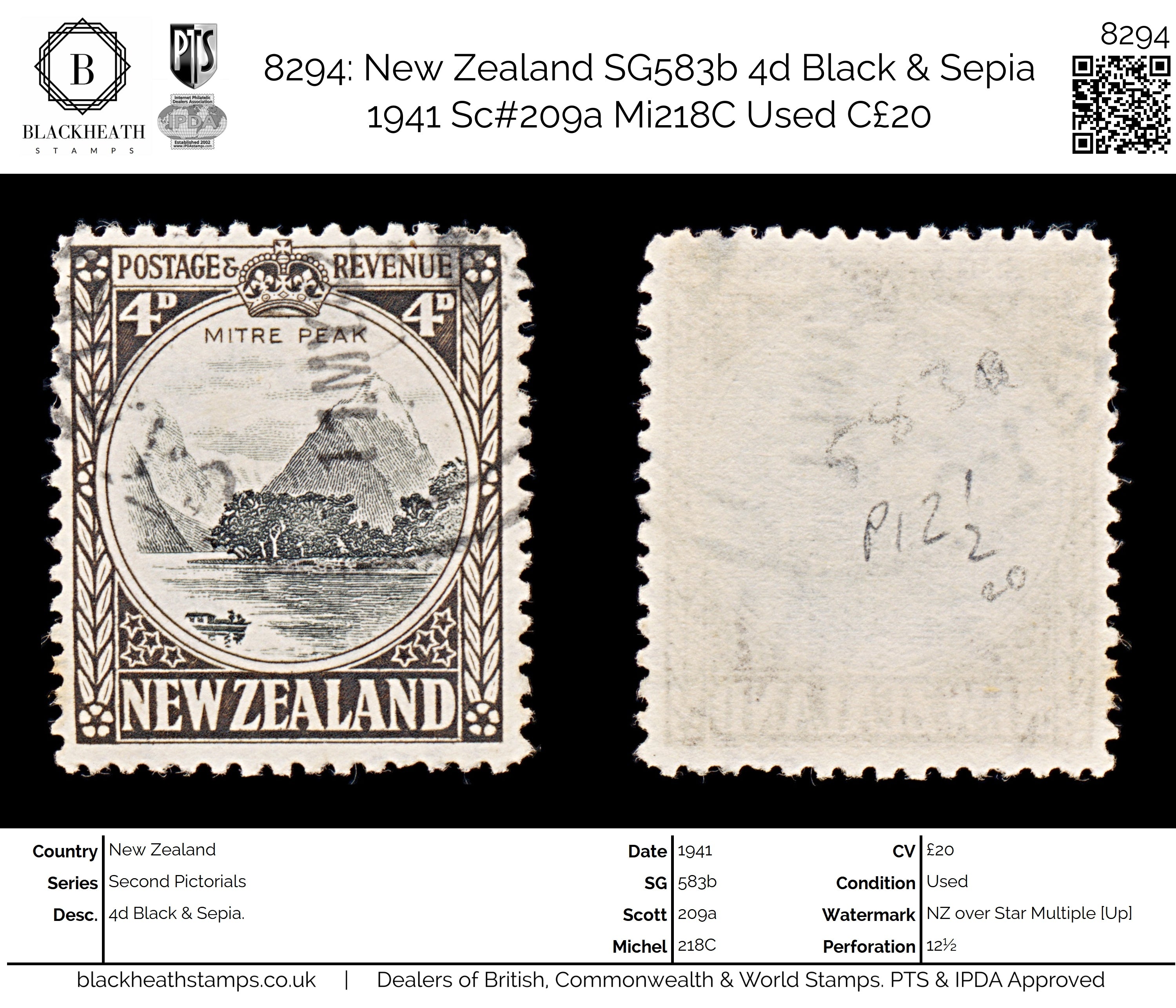 8294: New Zealand SG583b 4d Black & Sepia 1941 Sc#209a Mi218C Used C£20