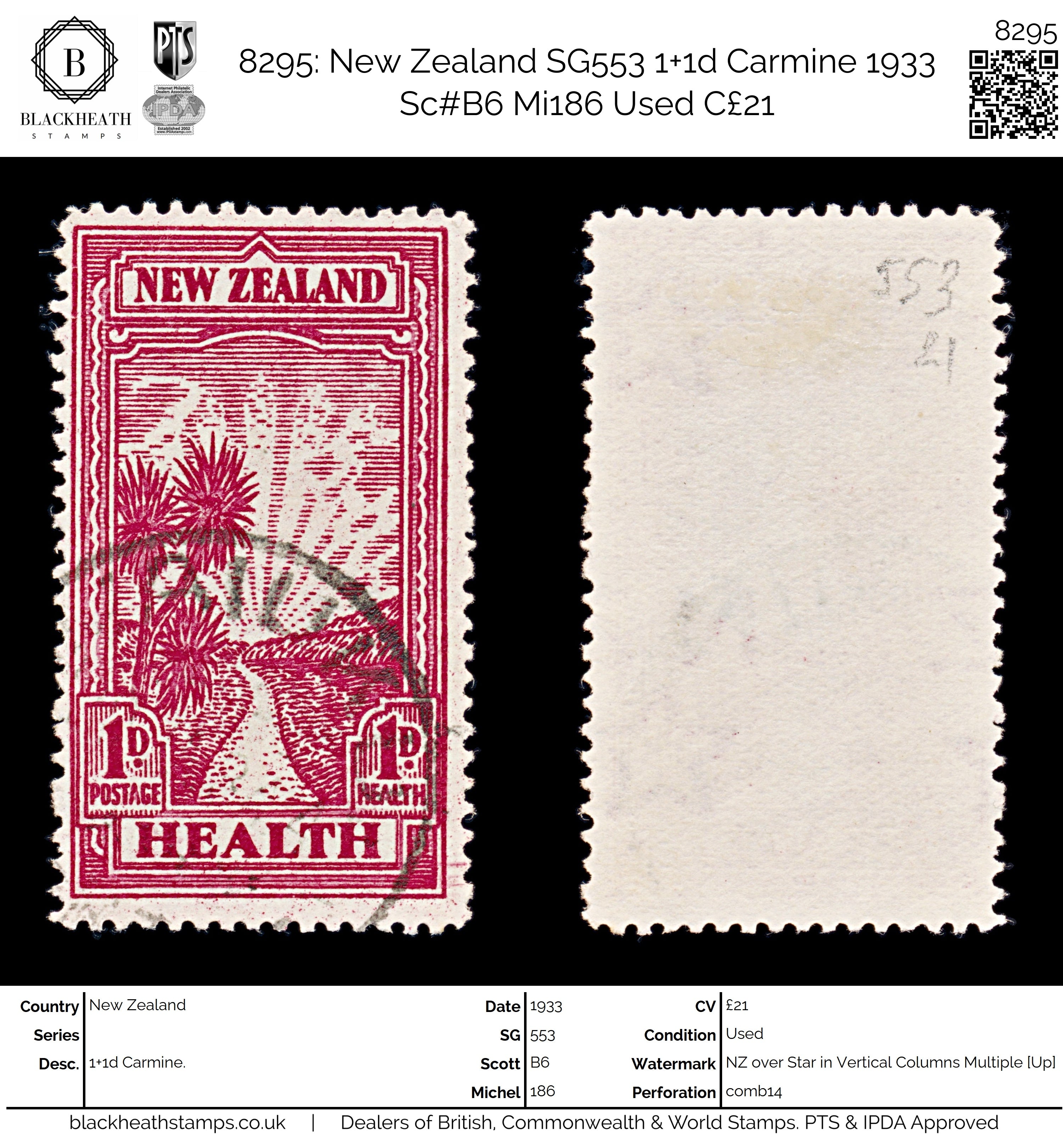 8295: New Zealand SG553 1+1d Carmine 1933 Sc#B6 Mi186 Uséd C£21