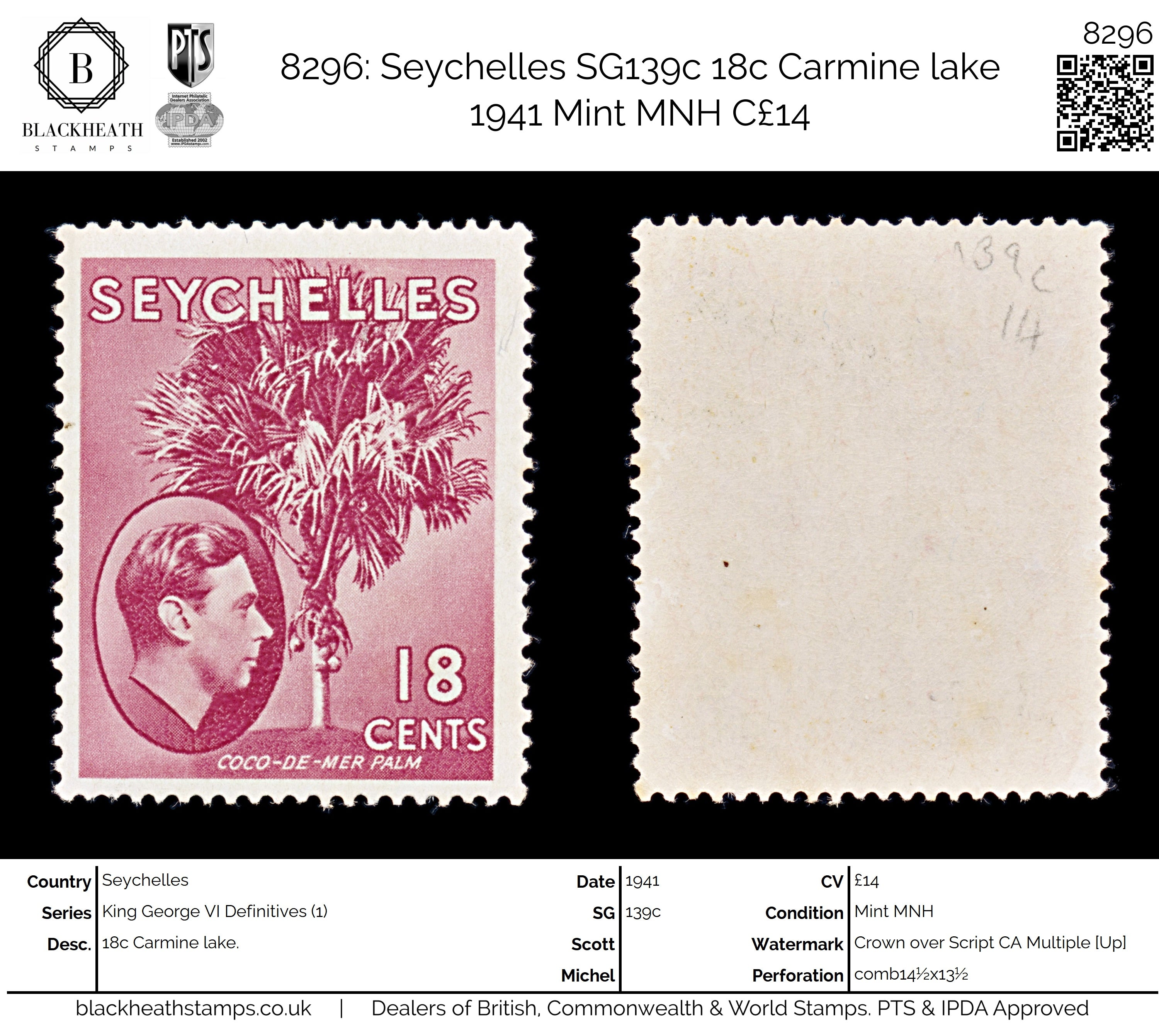 8296: Seychelles SG139c 18c Carmine lake 1941 Mint MNH C£14