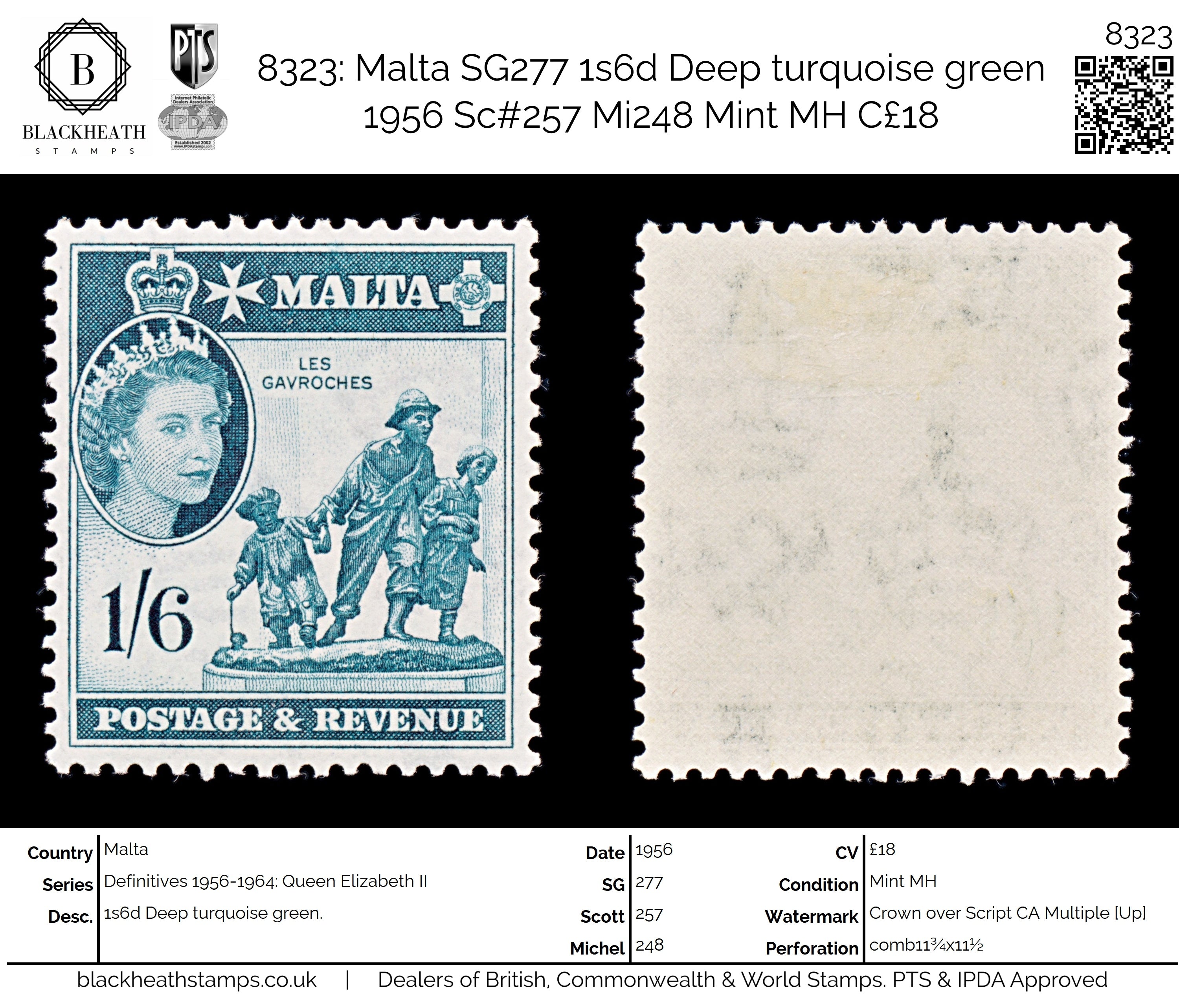 8323: Malta SG277 1s6d Deep turquoise green 1956 Sc#257 Mi248 Mint MH C£18